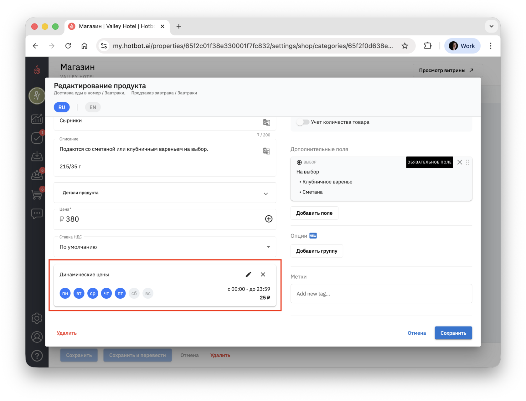 Отметьте чекбокс Поле обязательно к заполнению — и гость не сможет положить продукт в корзину, пока не выберет опцию. Например, если для заказа блюда важно указать способ приготовления.