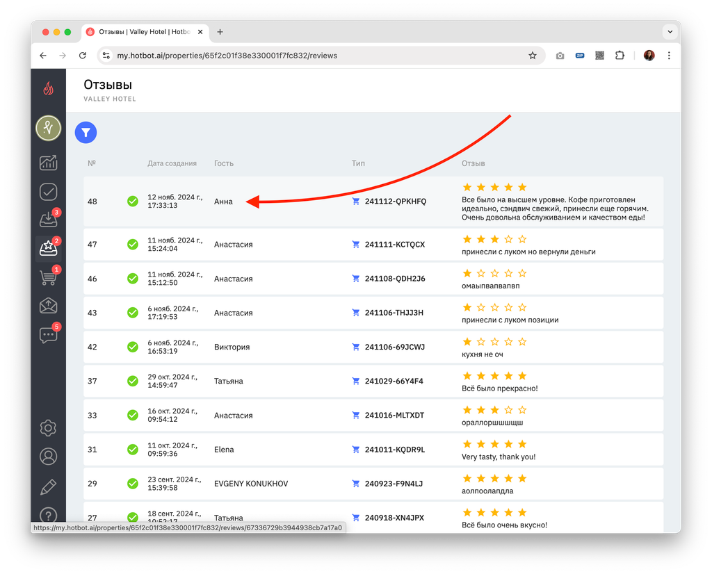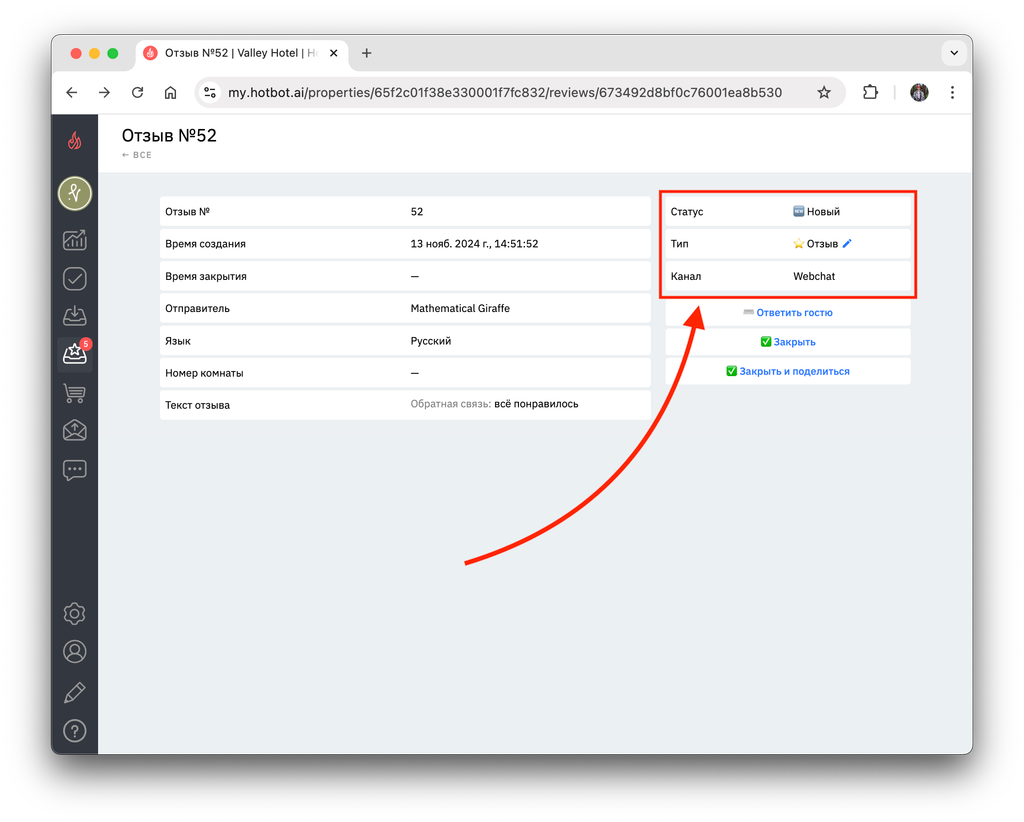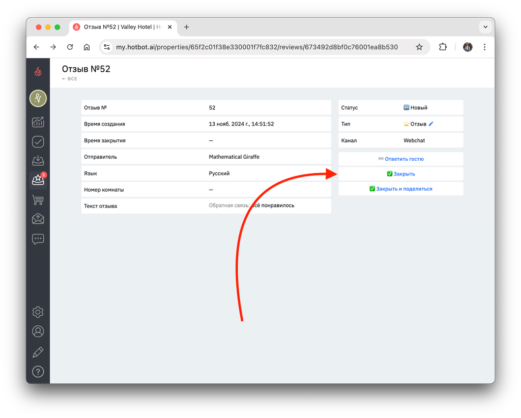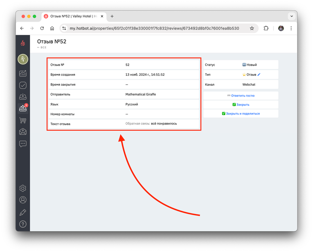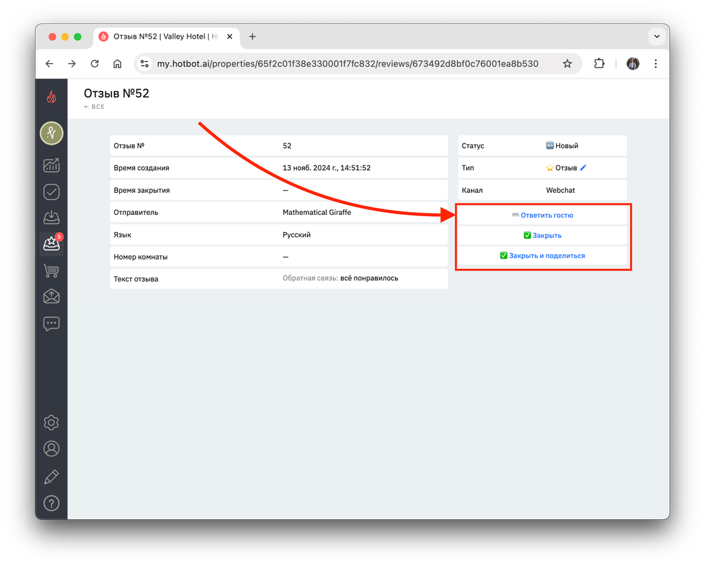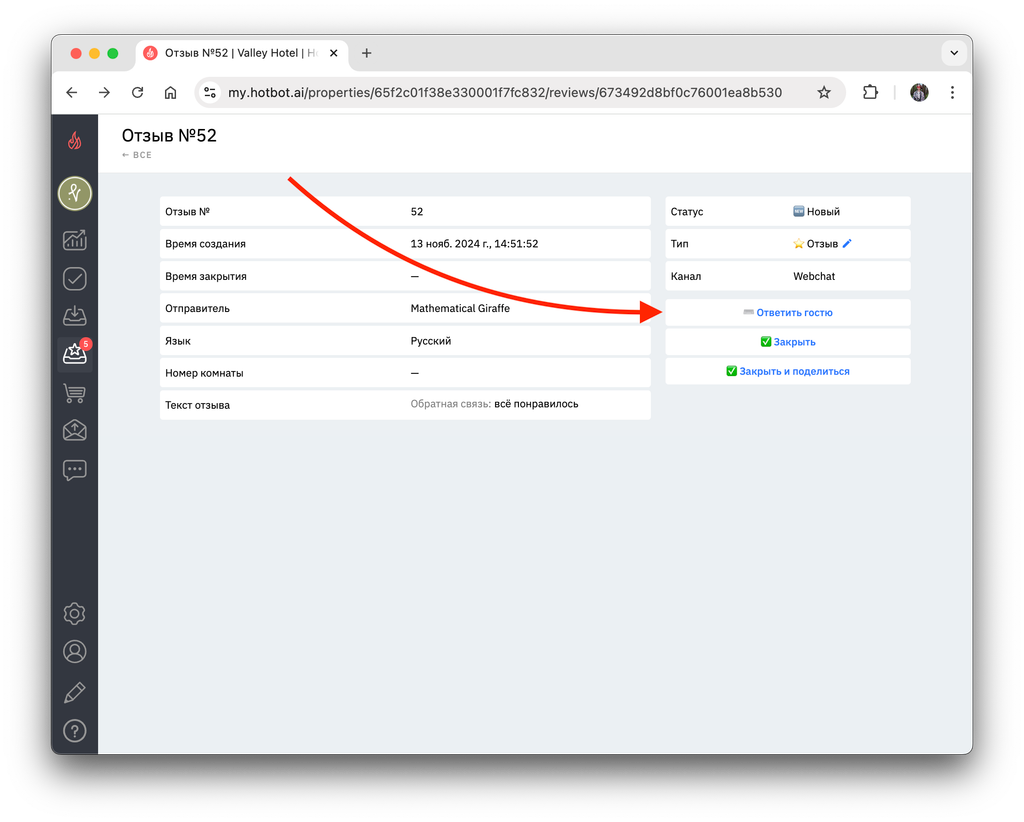 Когда гость оставляет отзыв, сотрудник отеля получает уведомление в личном кабинете Хотбот или в Telegram-боте.