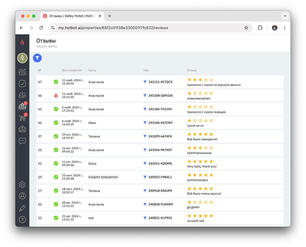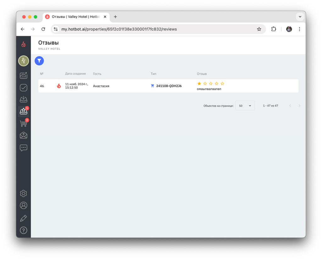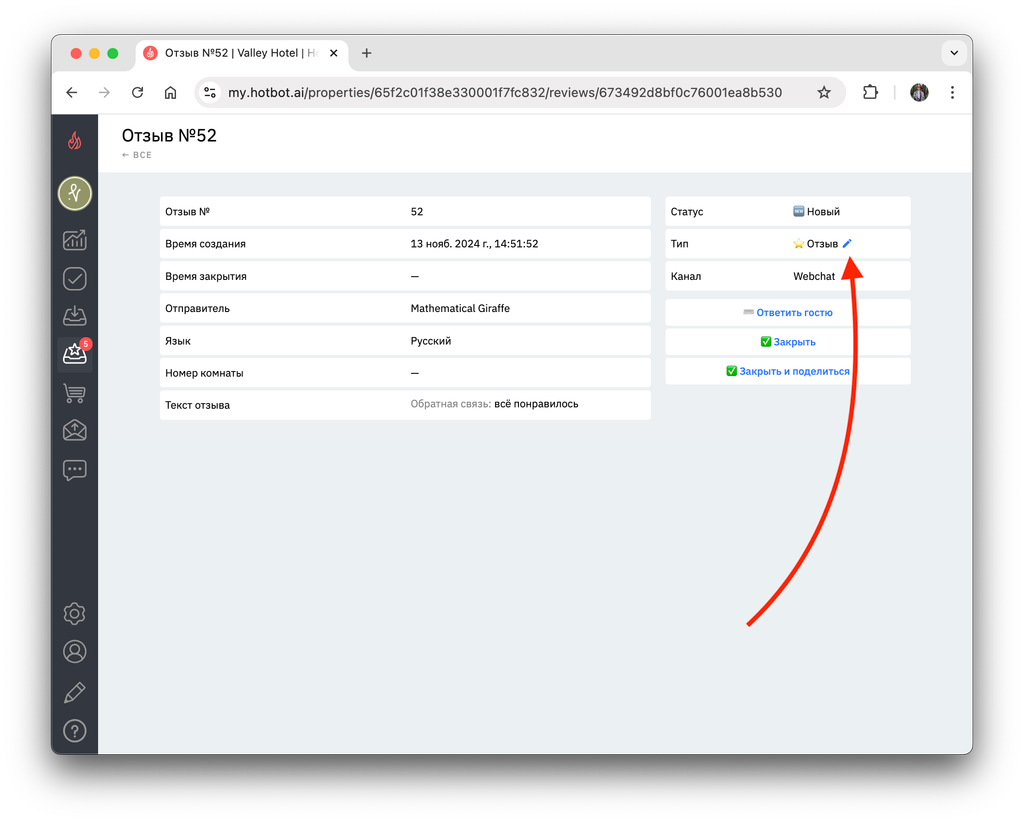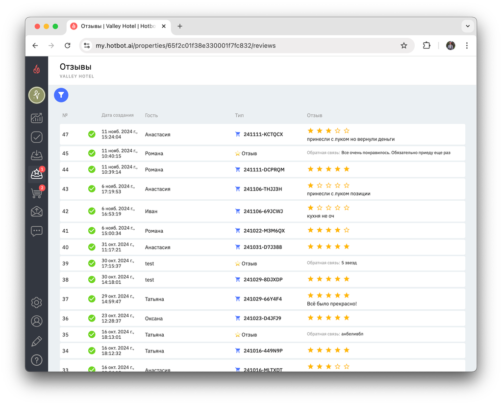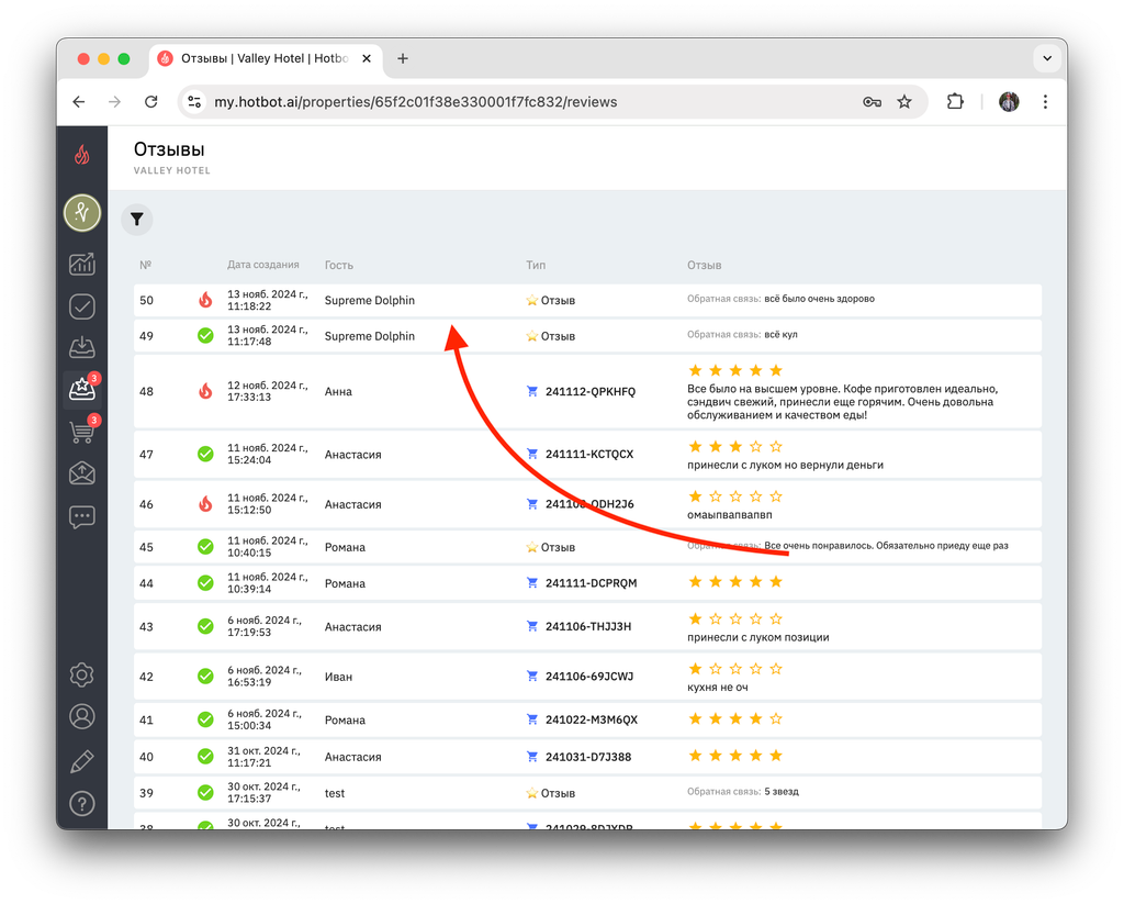 Когда гость оставляет отзыв, сотрудник отеля получает уведомление в личном кабинете Хотбот или в Telegram-боте.