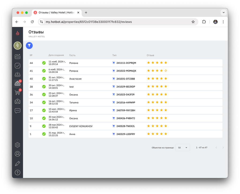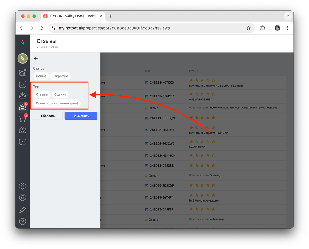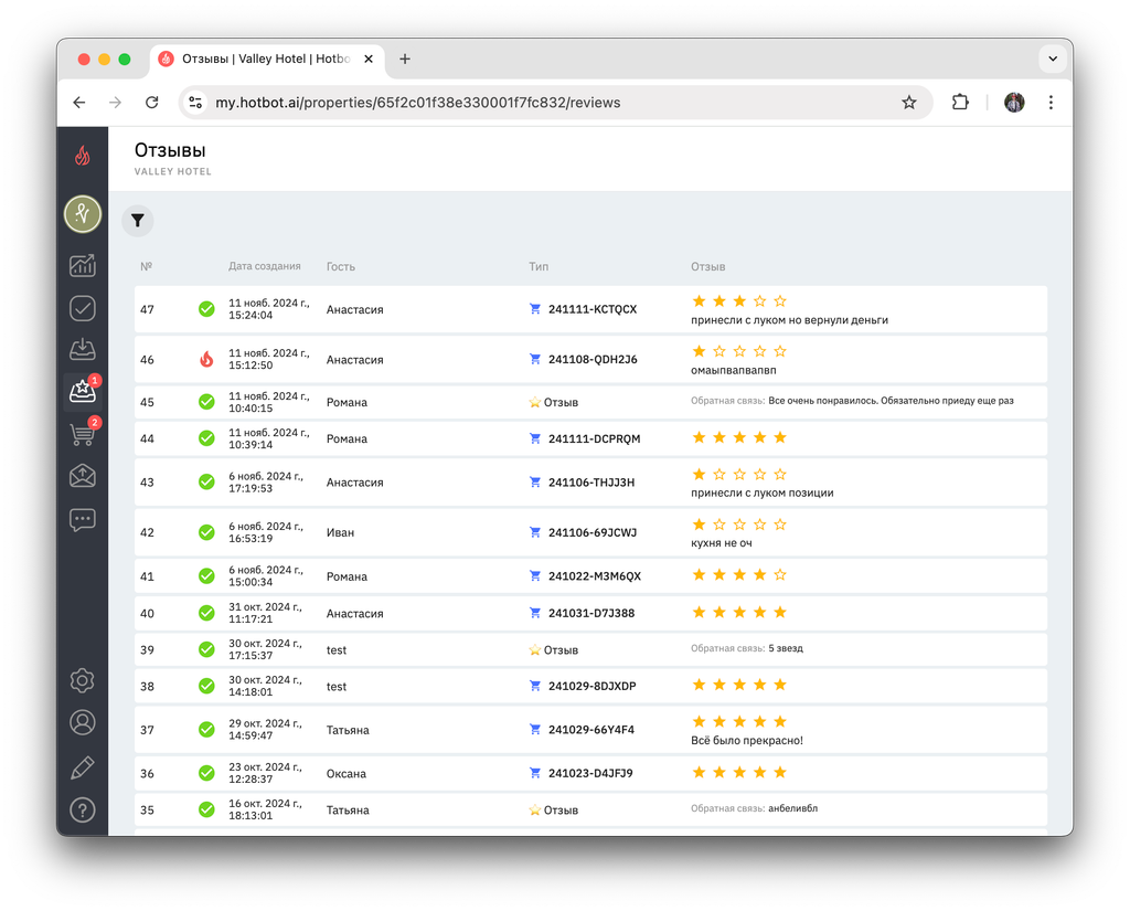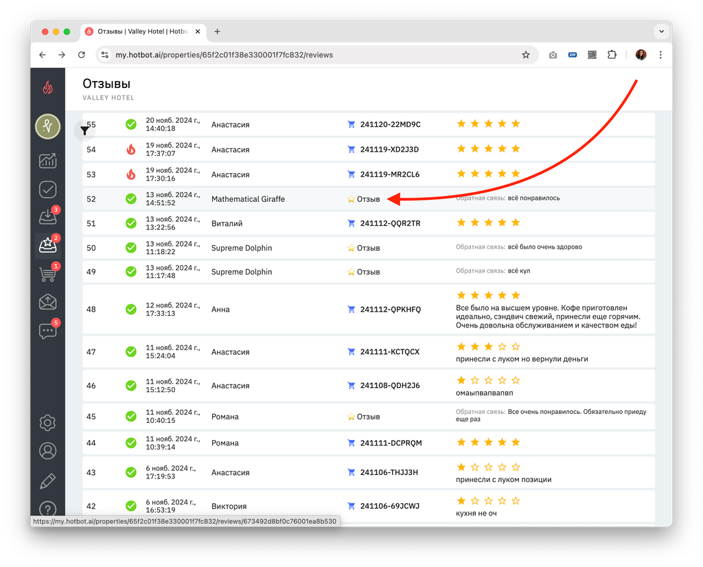 Отзывы — это сообщения от гостей, которые оставлены через CJM-рассылки или кнопку Оставить отзыв в чате. Отзывы отмечены значком ⭐️ и не имеют номера-идентификатора.