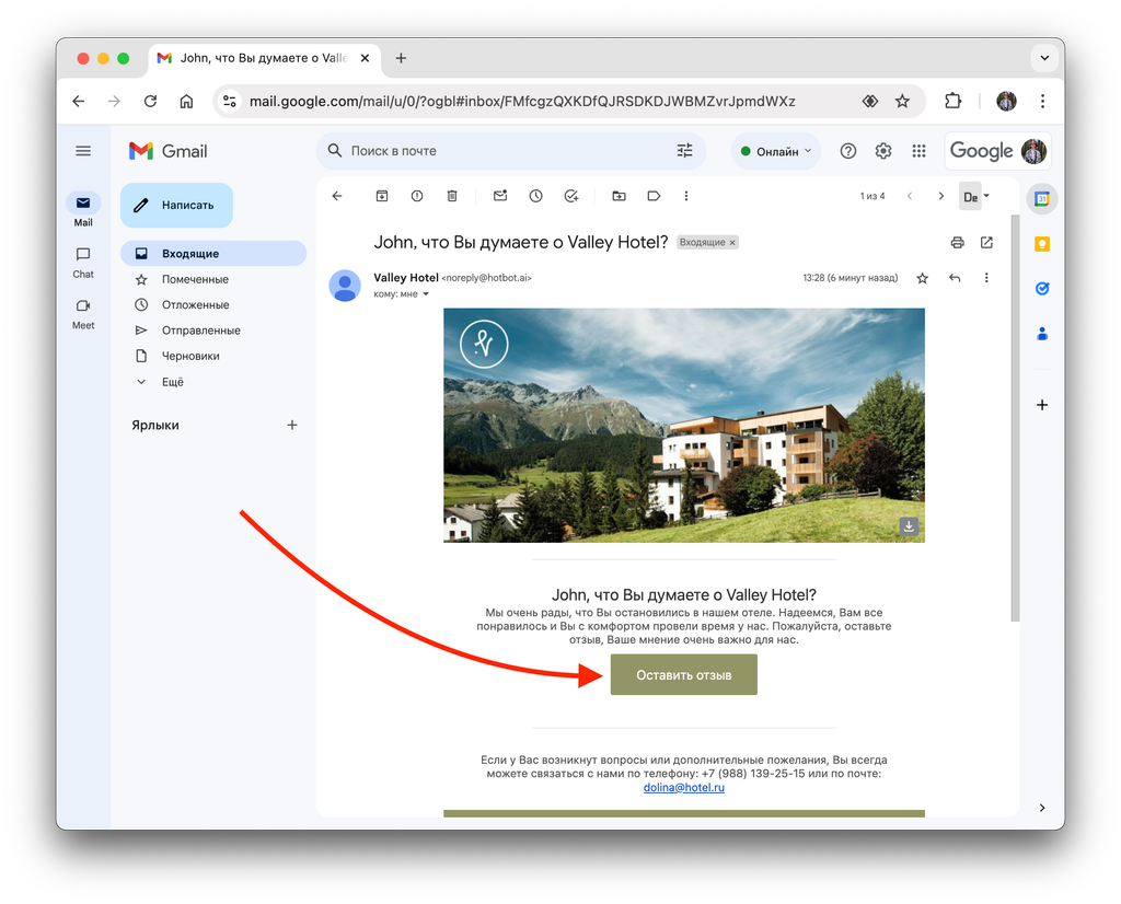 1. После выезда гость получает письмо на email с предложением поделиться своим мнением о качестве обслуживания и впечатлениях от пребывания.
