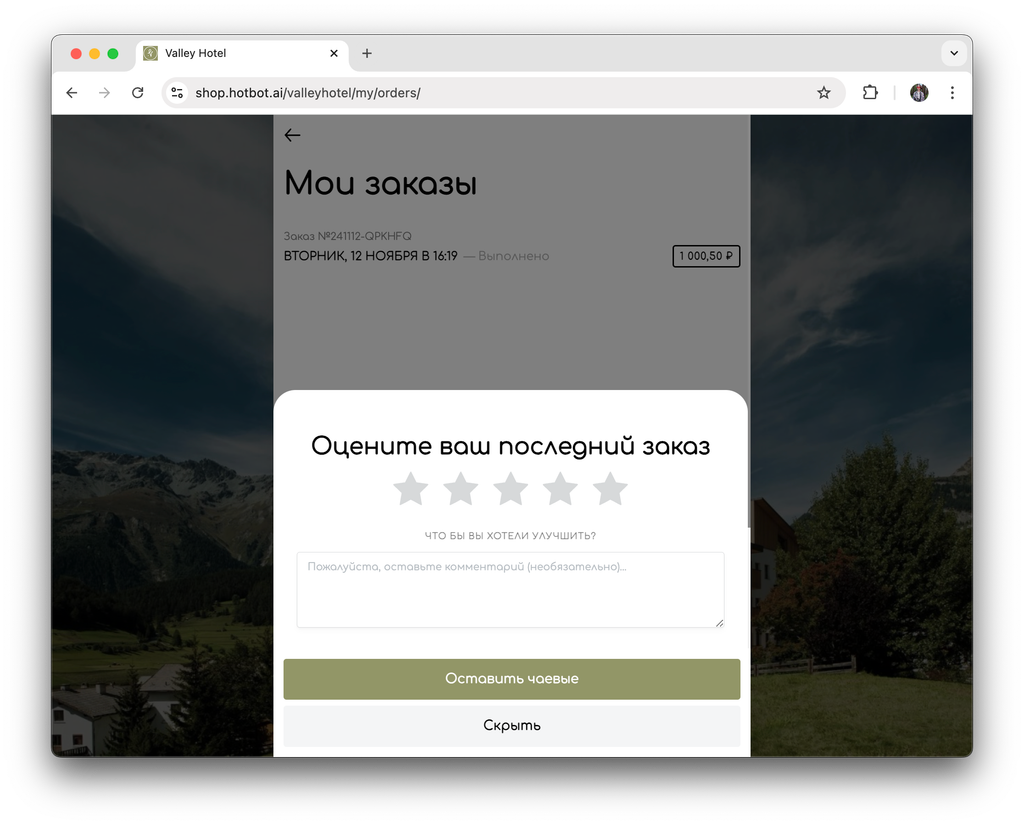 1. После выполнения заказа у гостя на витрине всплывает окошко с предложением оставить отзыв.