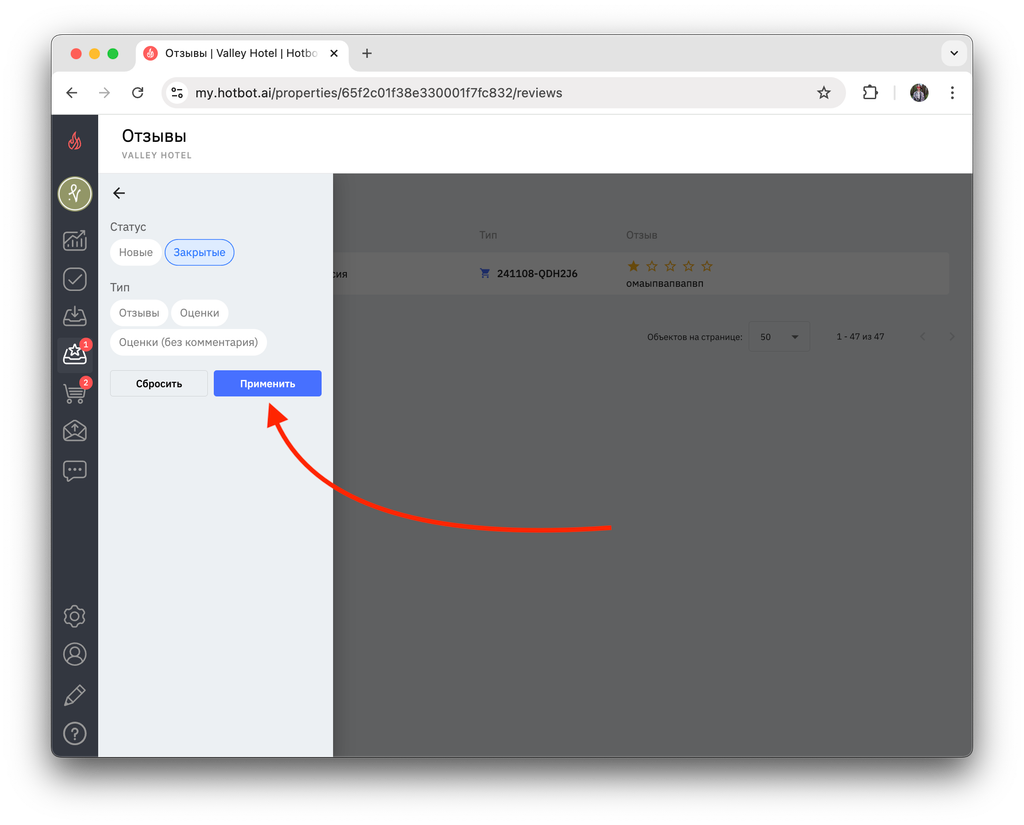 3. Чтобы посмотреть закрытые отзывы, выберите Закрытые и нажмите Применить