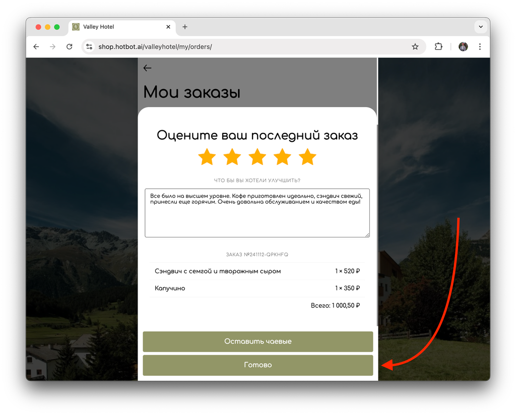 2. Гостю предлагается оценить заказ и написать комментарий. После оценки заказа он нажимает Готово