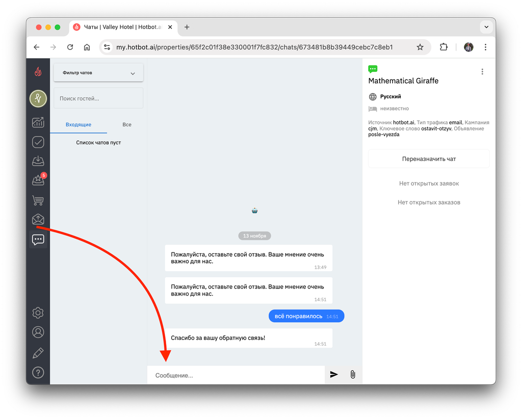 2. Нажав на кнопку Оставить отзыв, гость переходит в чат, где сможет оставить обратную связь об отдыхе в отеле.