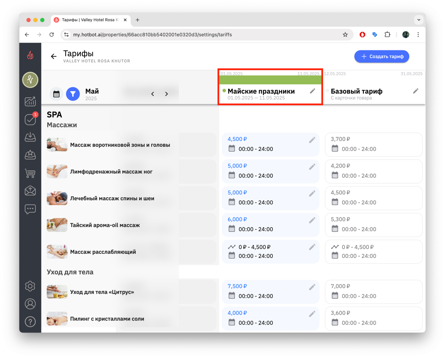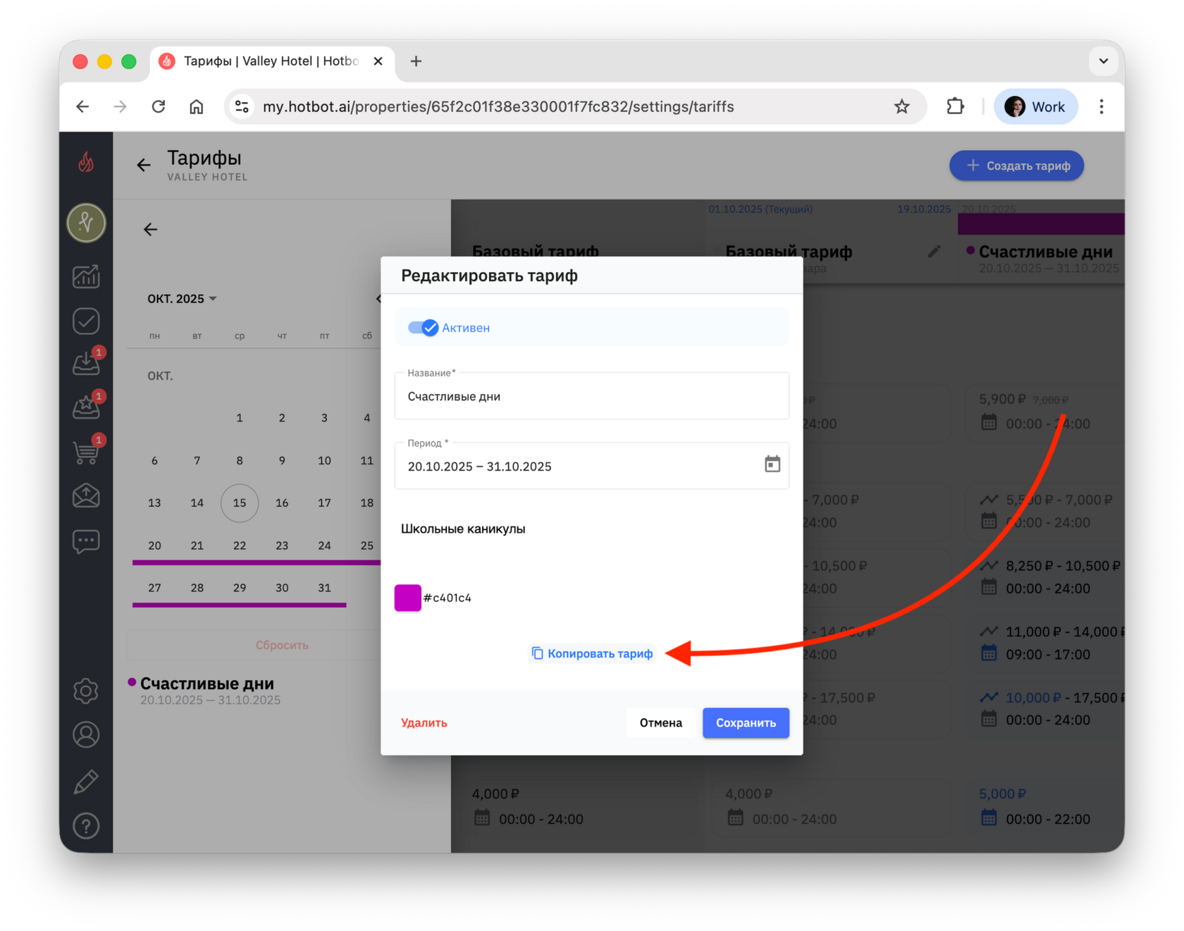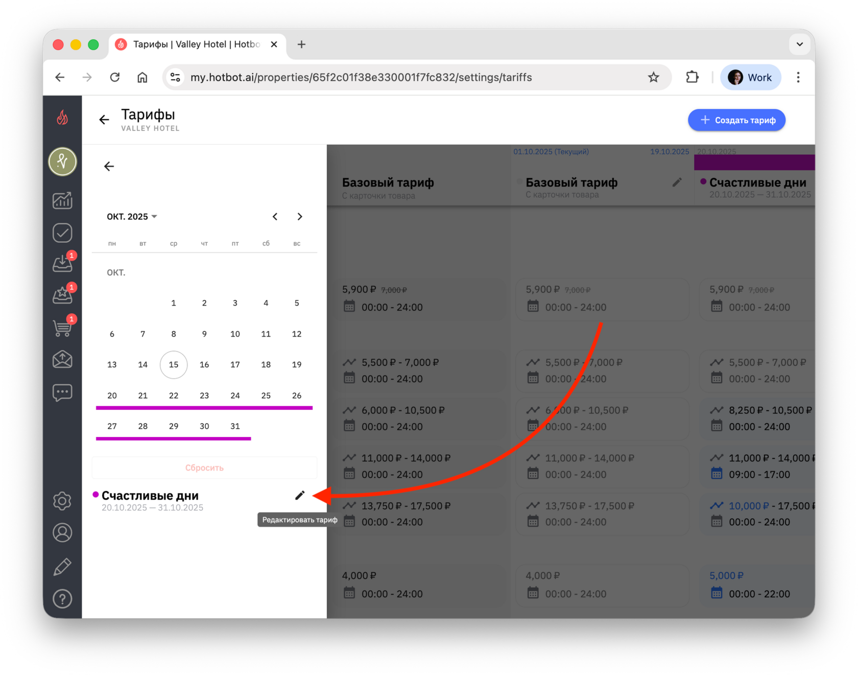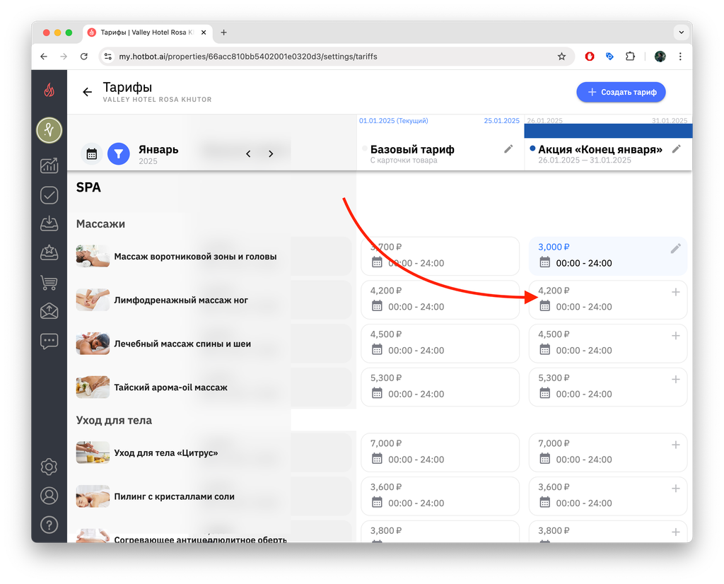 Тарифы — это инструмент управления ценами, который позволяет гибко управлять стоимостью услуг в зависимости от сезонности, загрузки, календаря мероприятий города, а также от других факторов. В Хотбот тарифы помогают автоматизировать ценообразование без изменения базового тарифа.