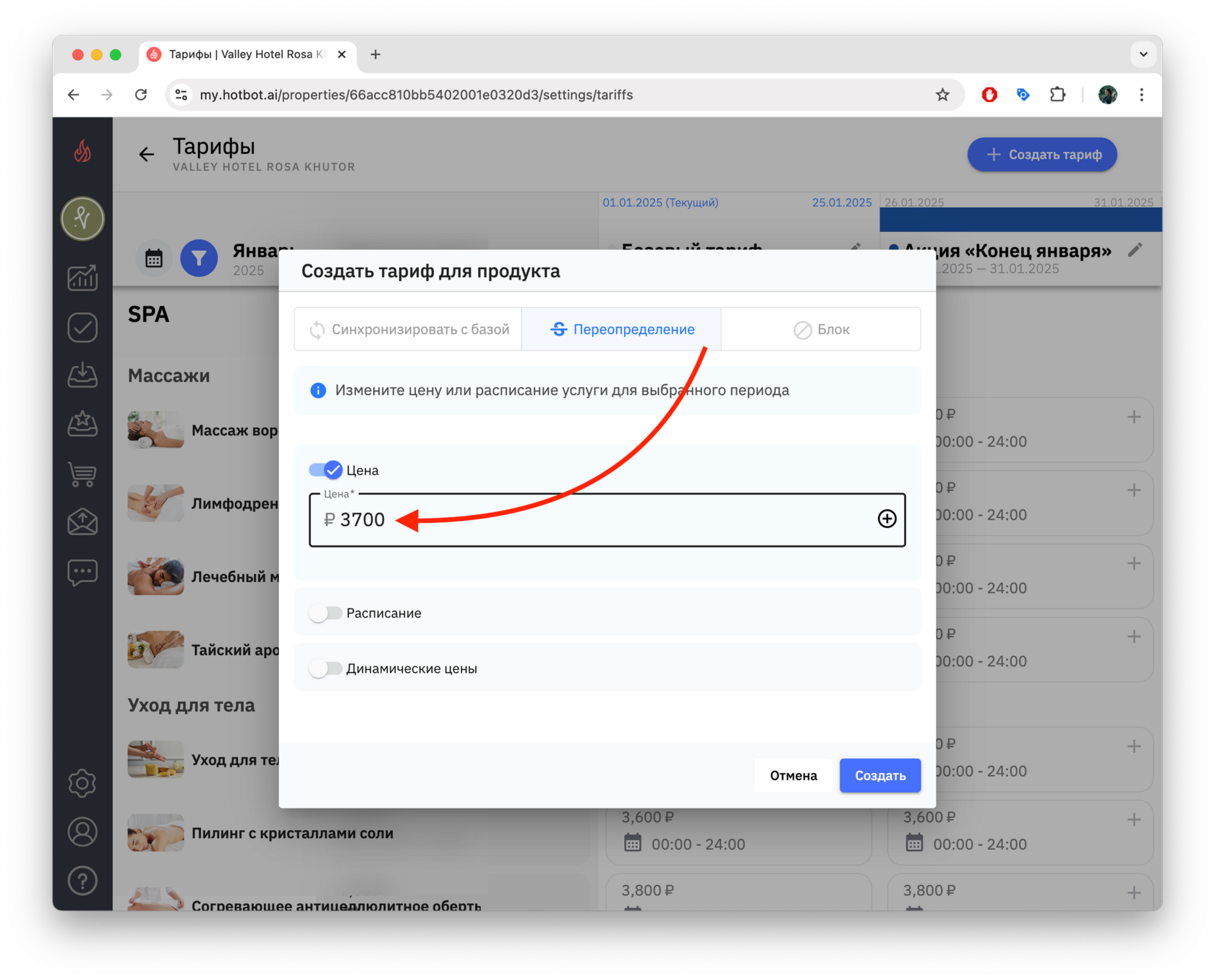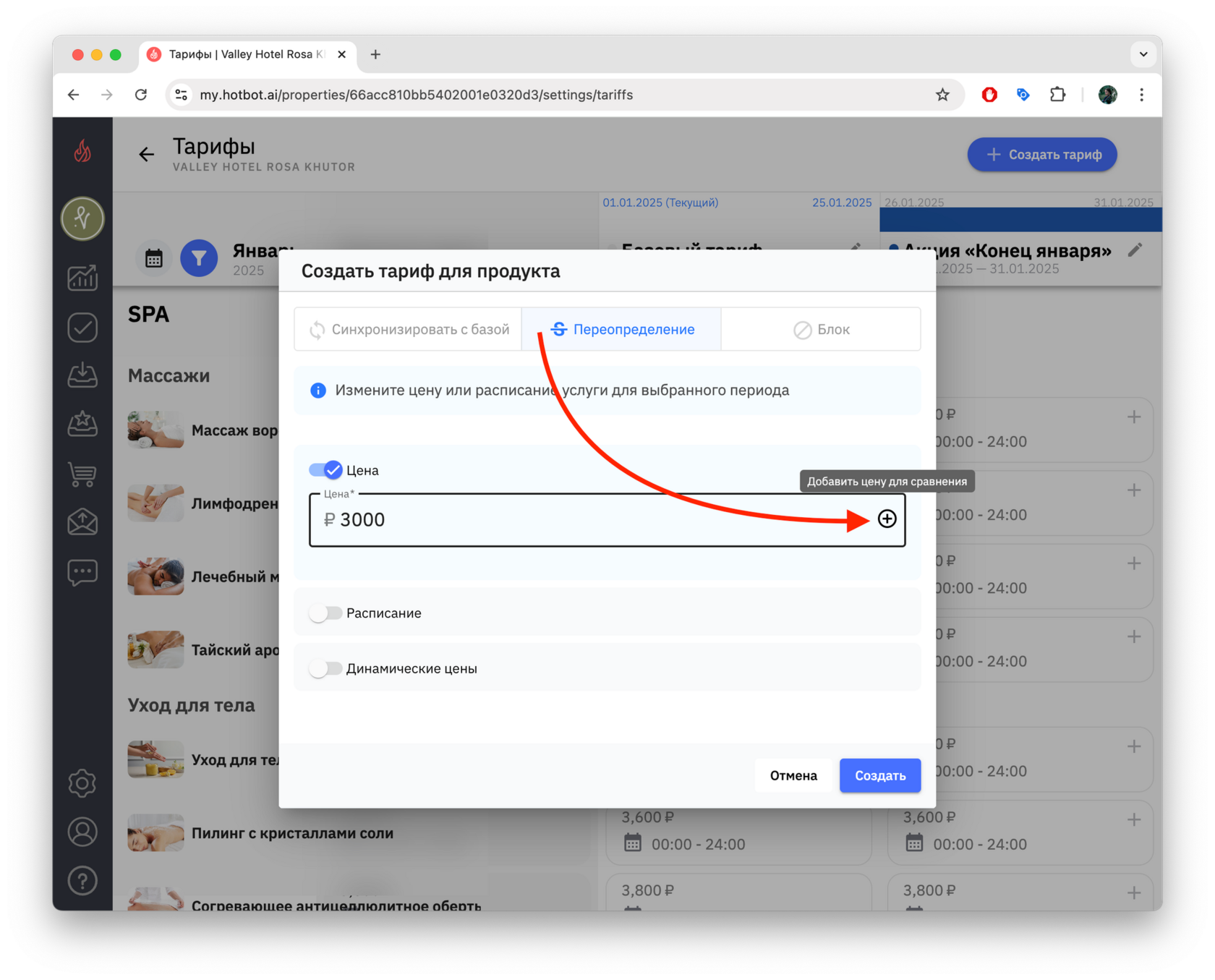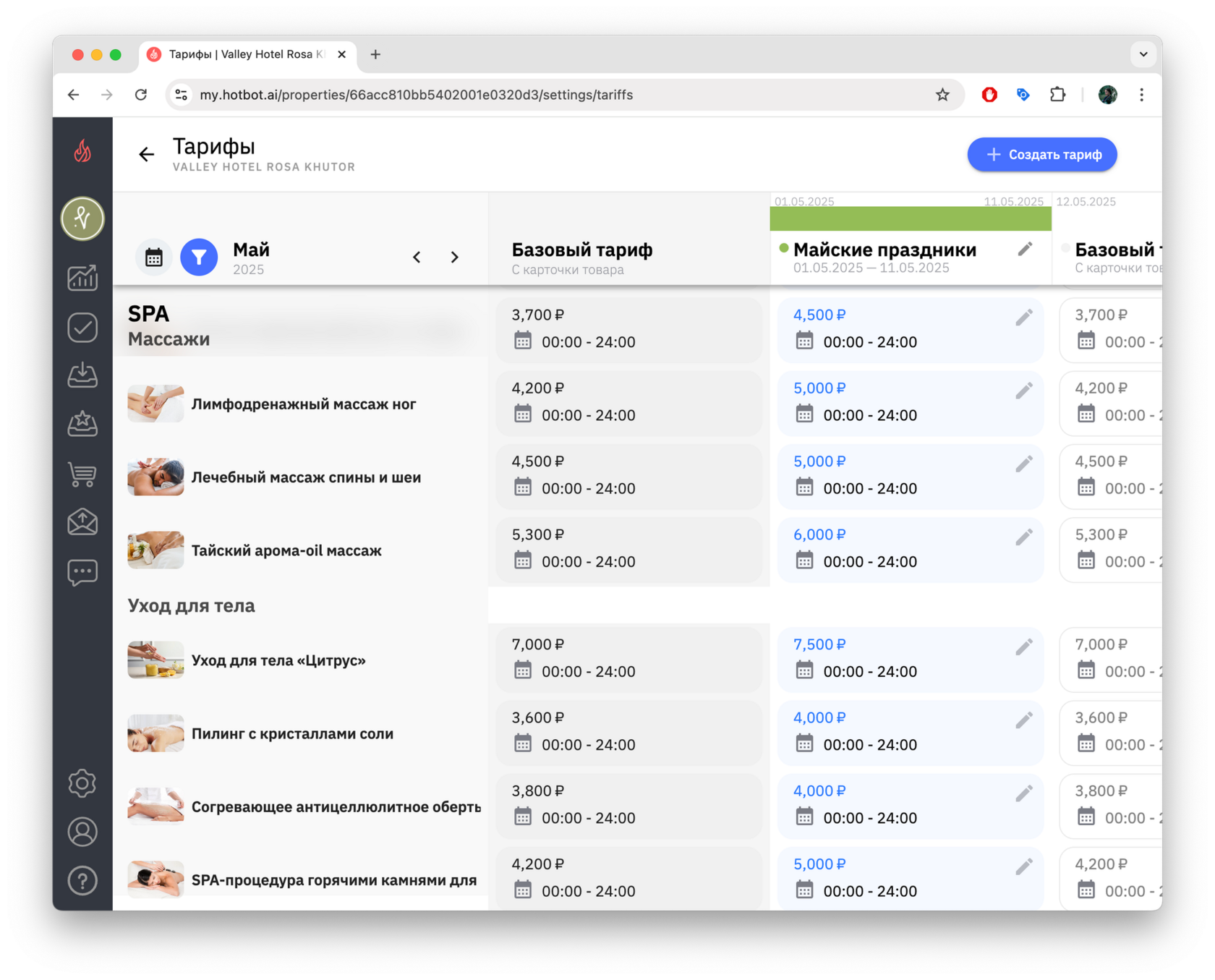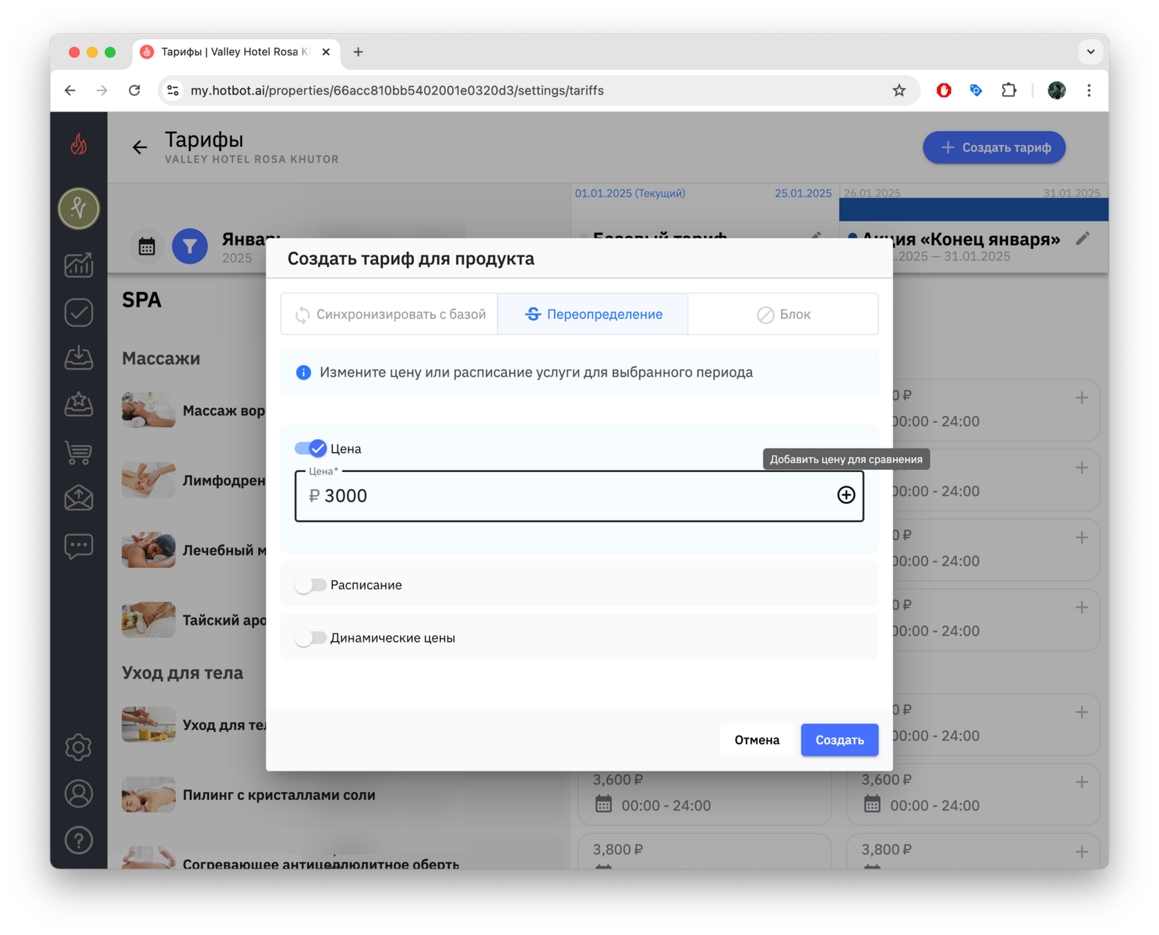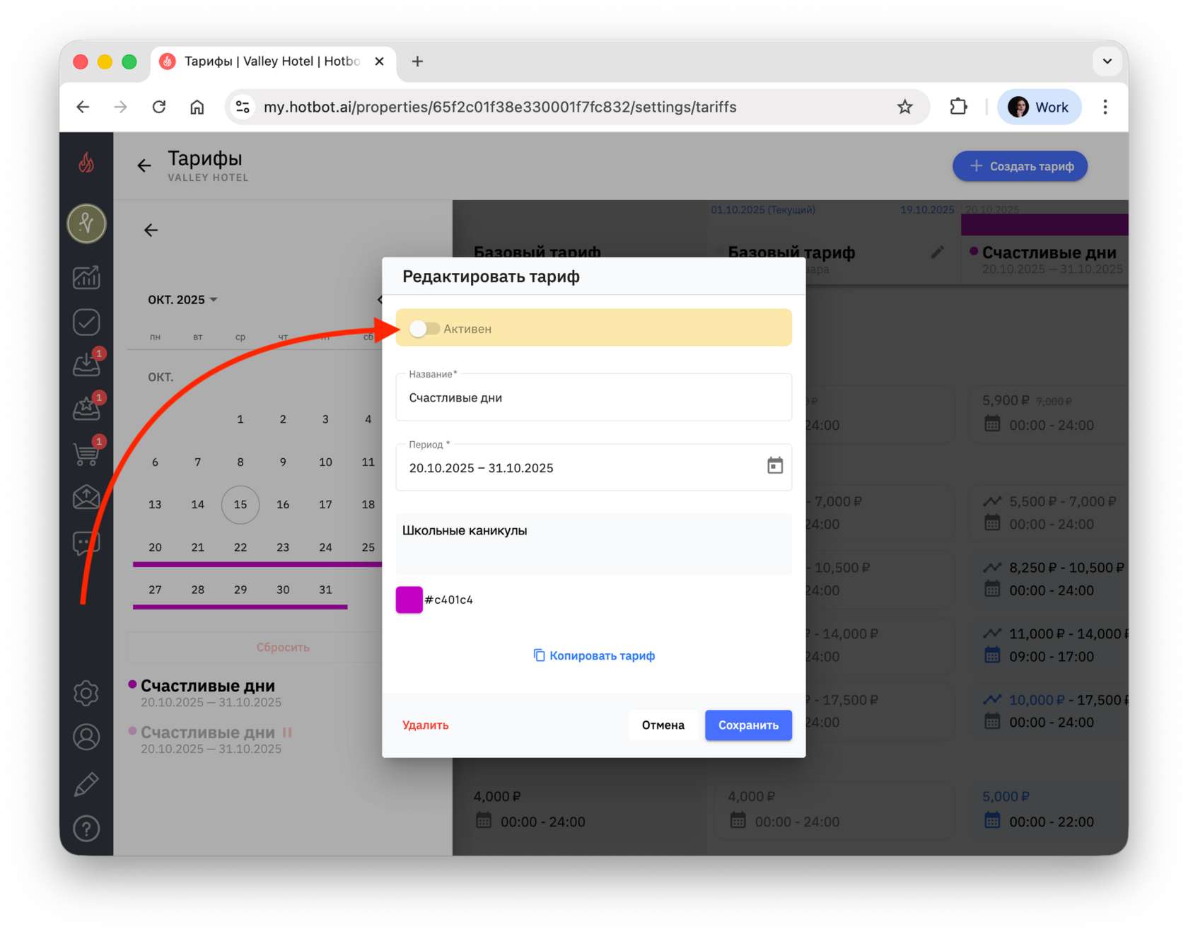 Тарифы — это инструмент управления ценами, который позволяет гибко управлять стоимостью услуг в зависимости от сезонности, загрузки, календаря мероприятий города, а также от других факторов. В Хотбот тарифы помогают автоматизировать ценообразование без изменения базового тарифа.