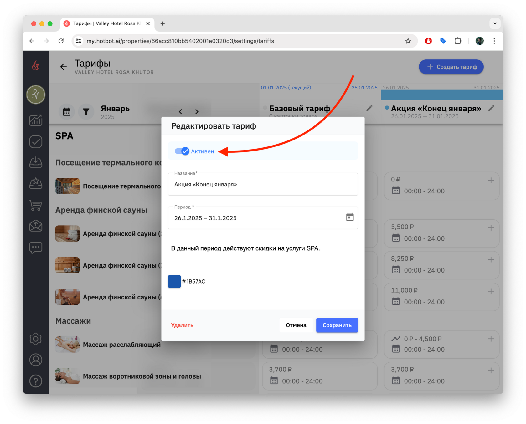 1. Чтобы деактивировать тариф в окне редактирования нажмите на переключатель Активен