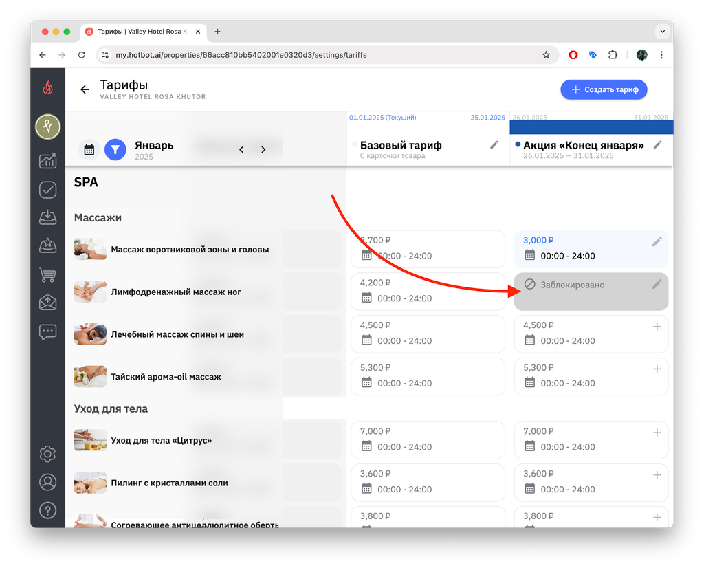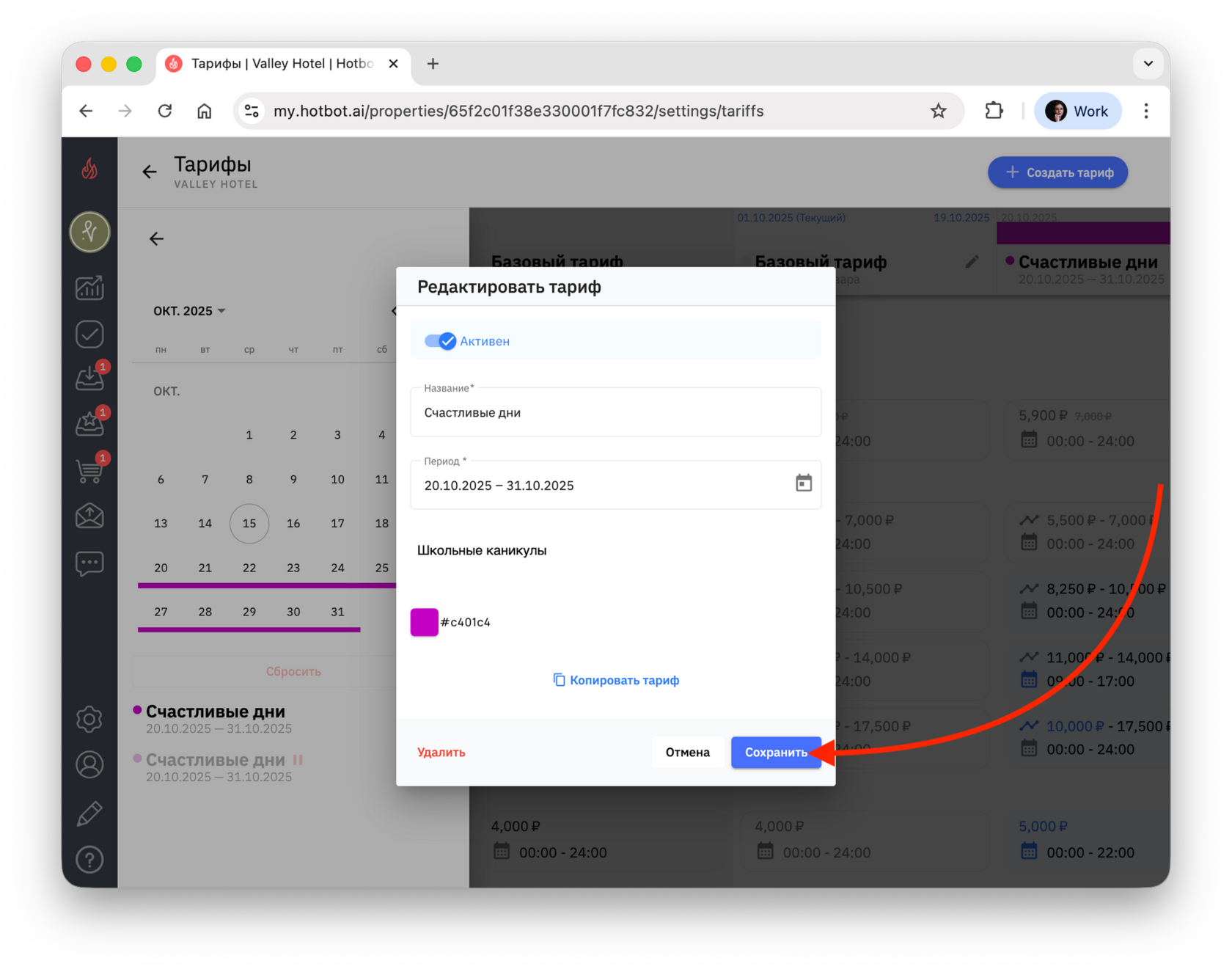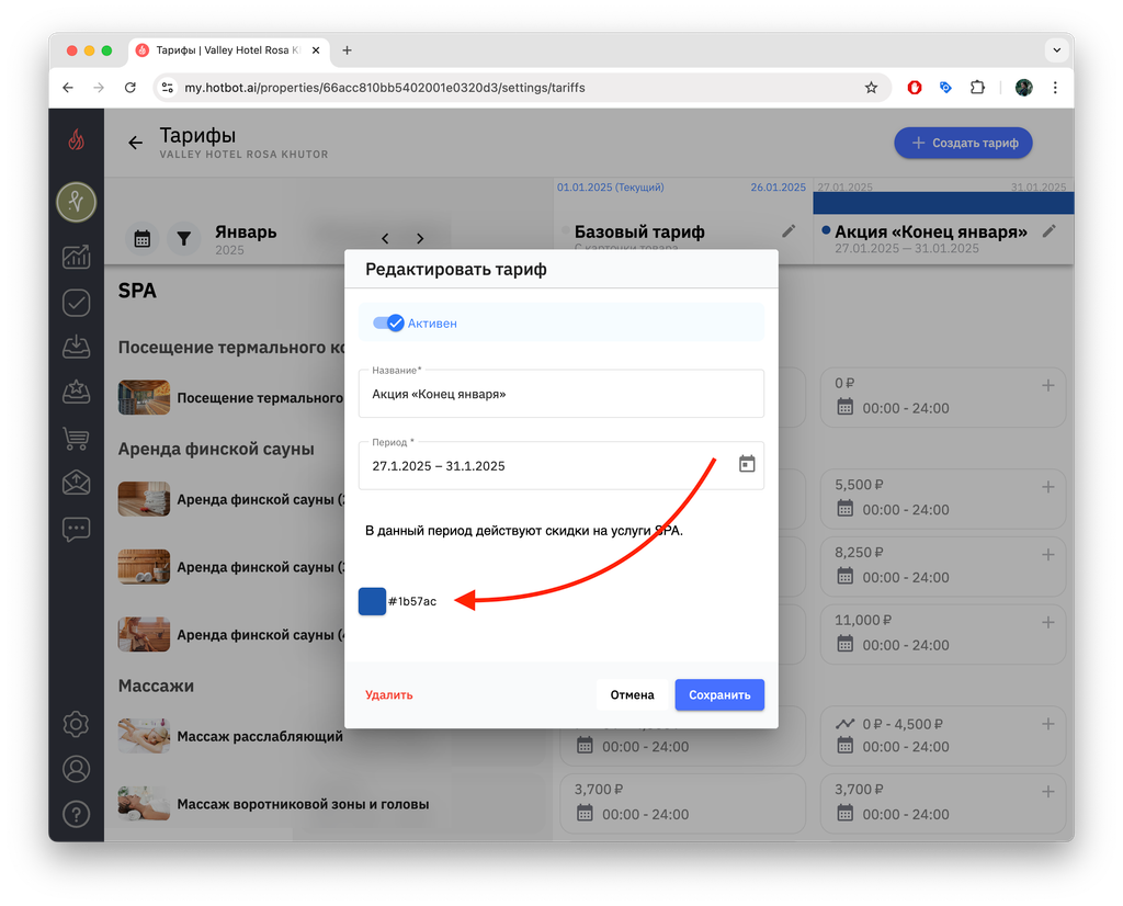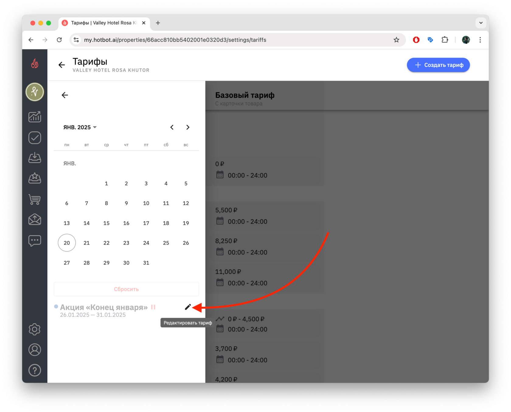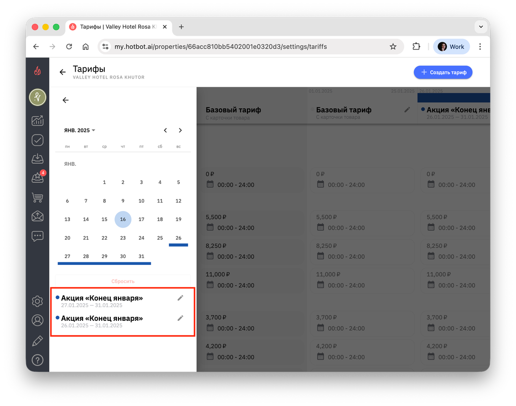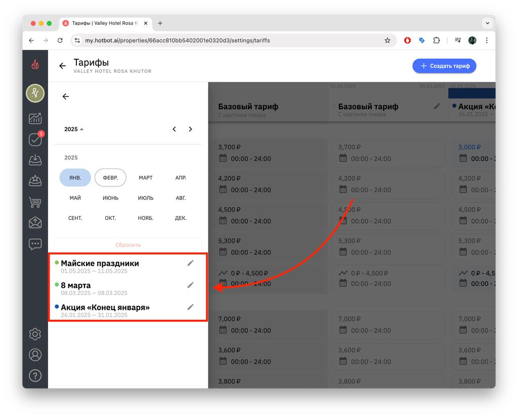 4. Чтобы просмотреть список созданных тарифов, снова откройте календарь — в нижней части появится перечень тарифов выбранного месяца.