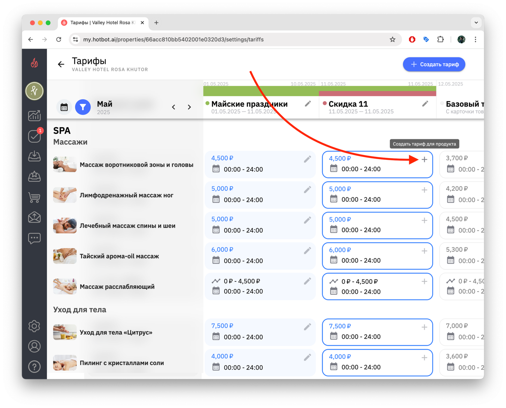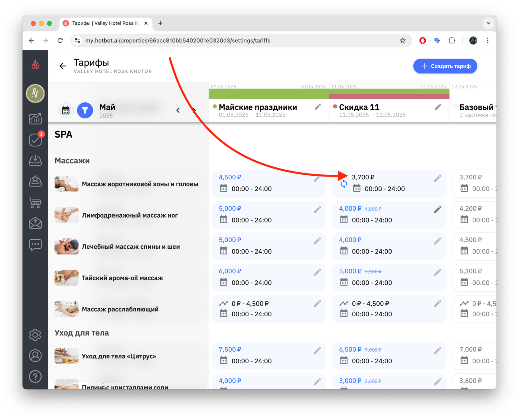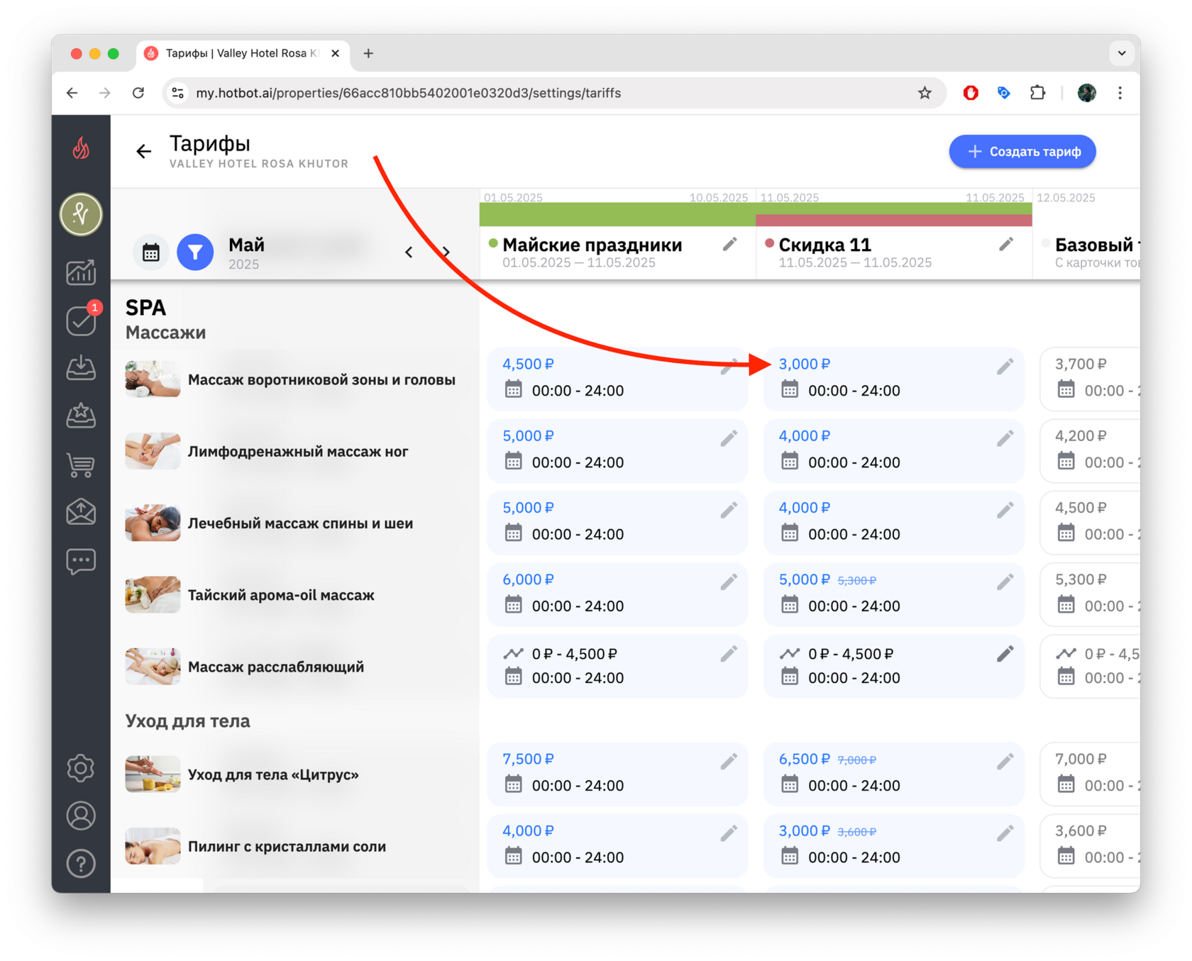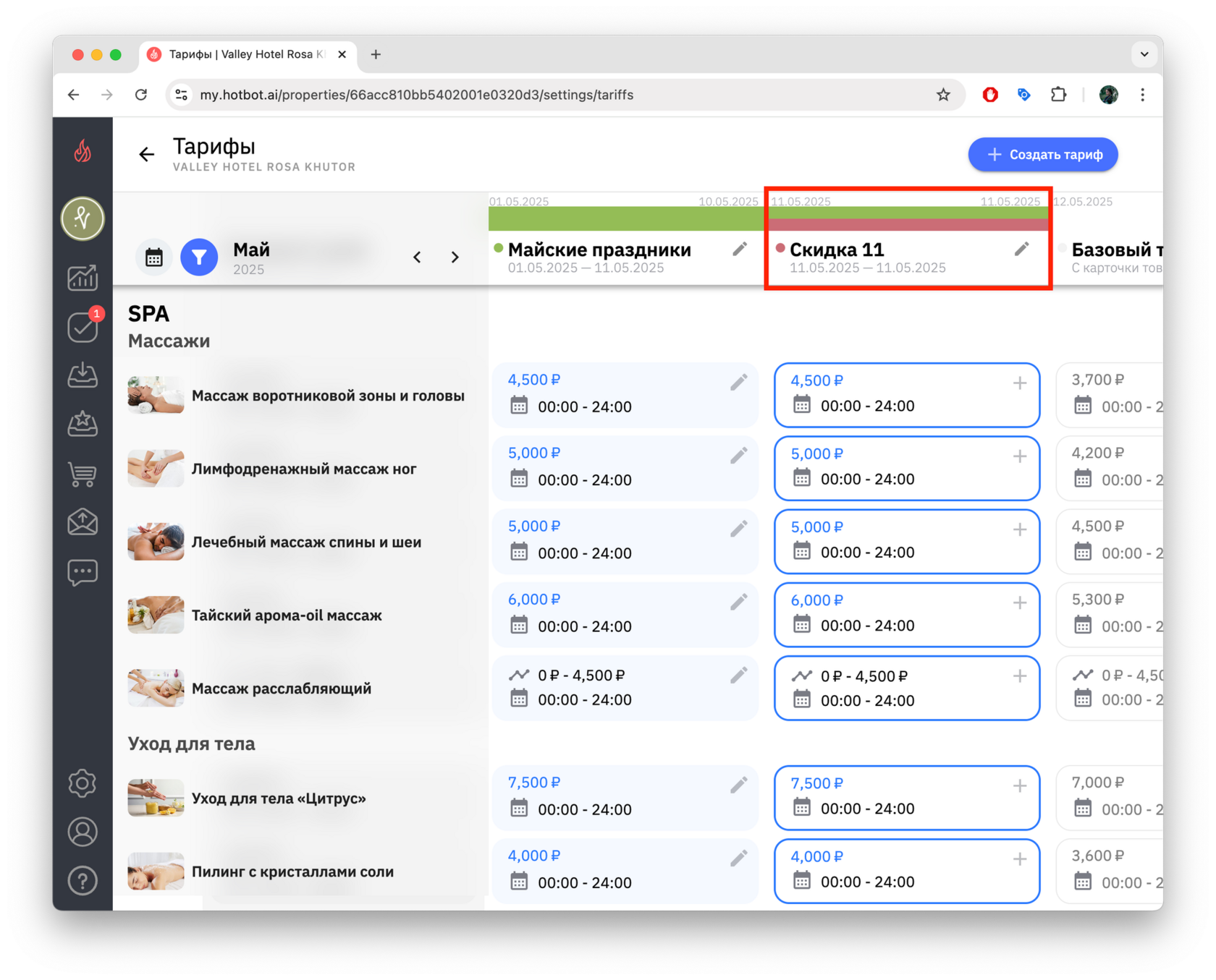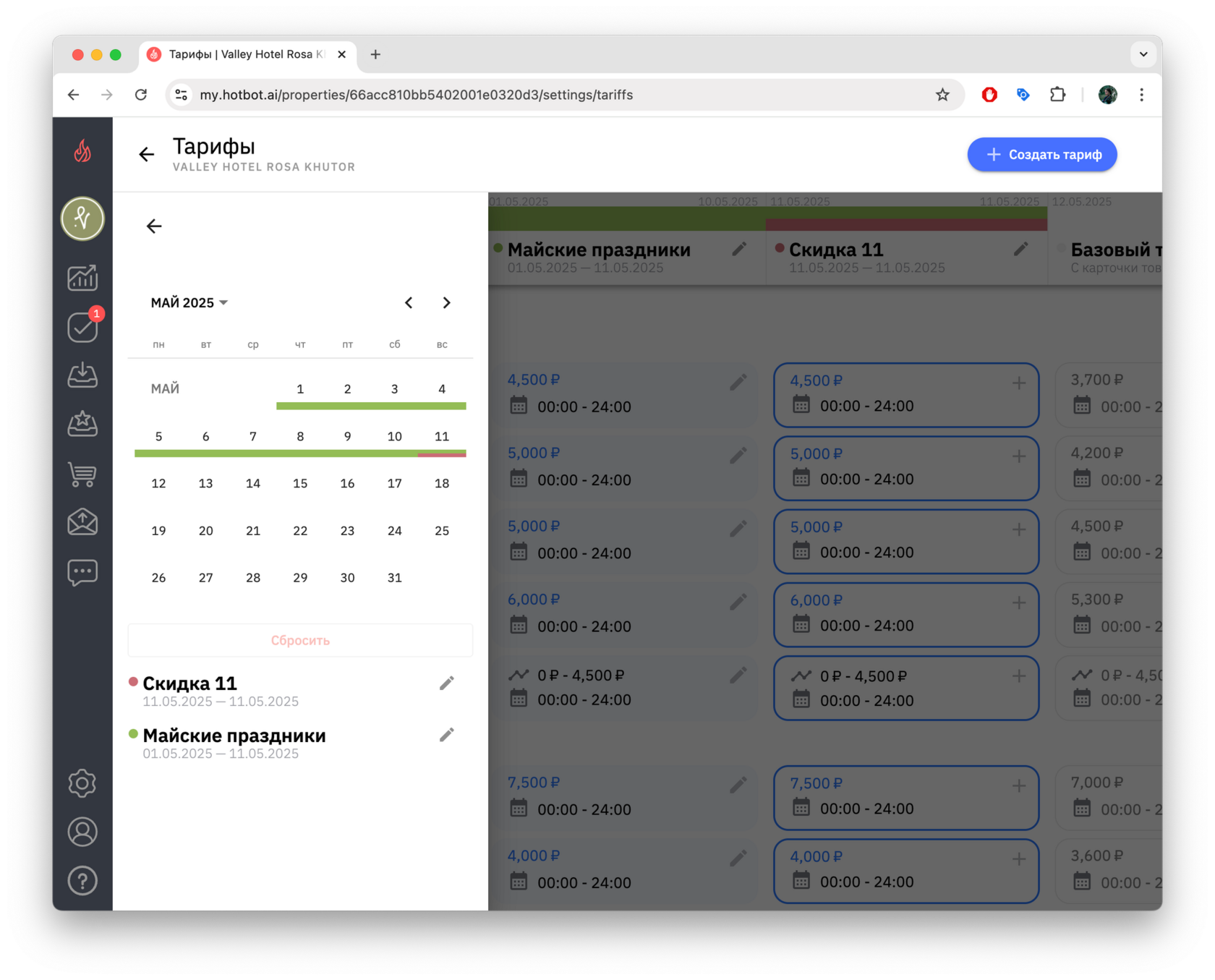- Обновленные настройки тарифа «Скидка 11 мая» вступят в силу только в выбранные даты, а в остальные дни продолжит действовать основной тариф «Майские праздники».