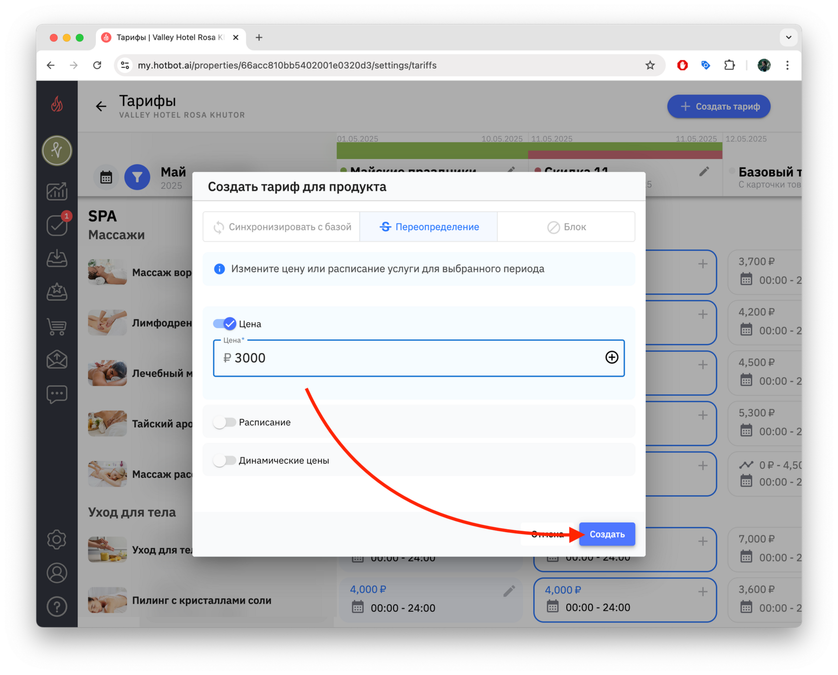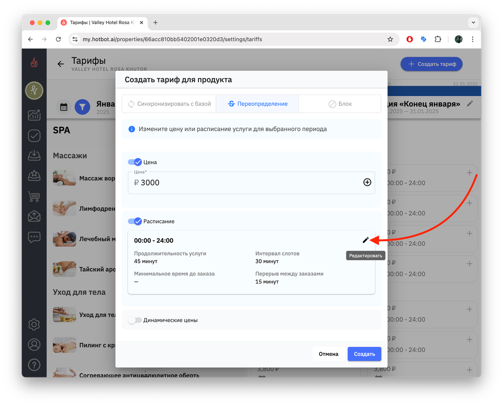 Ниже вы увидите параметры, которые можно изменить: цена, расписание, динамические цены.