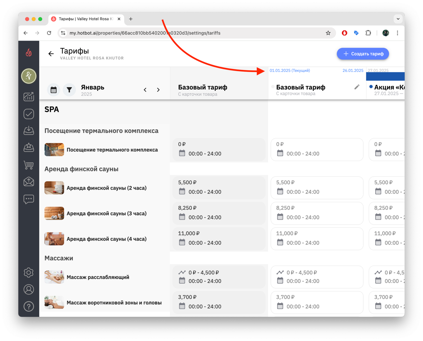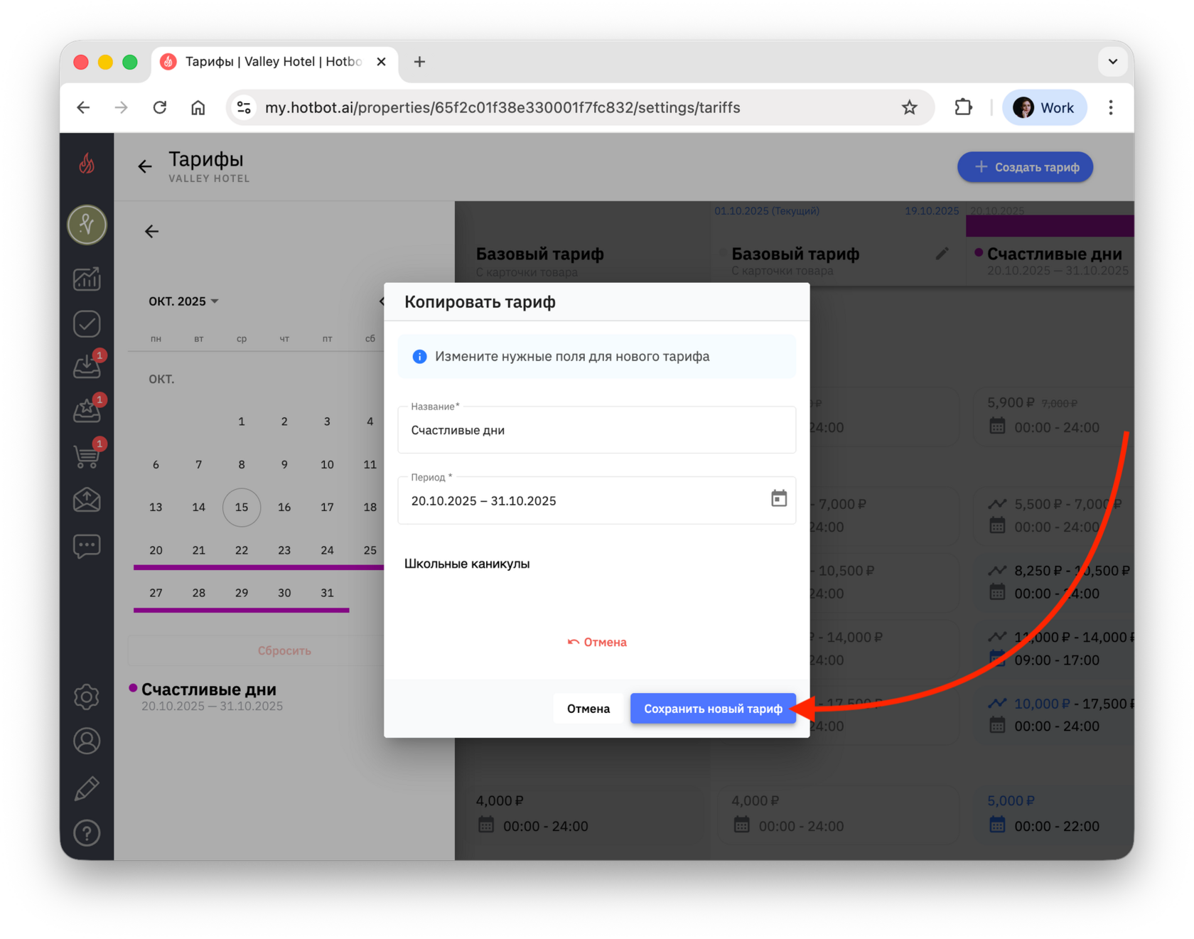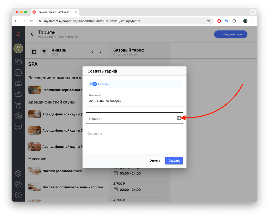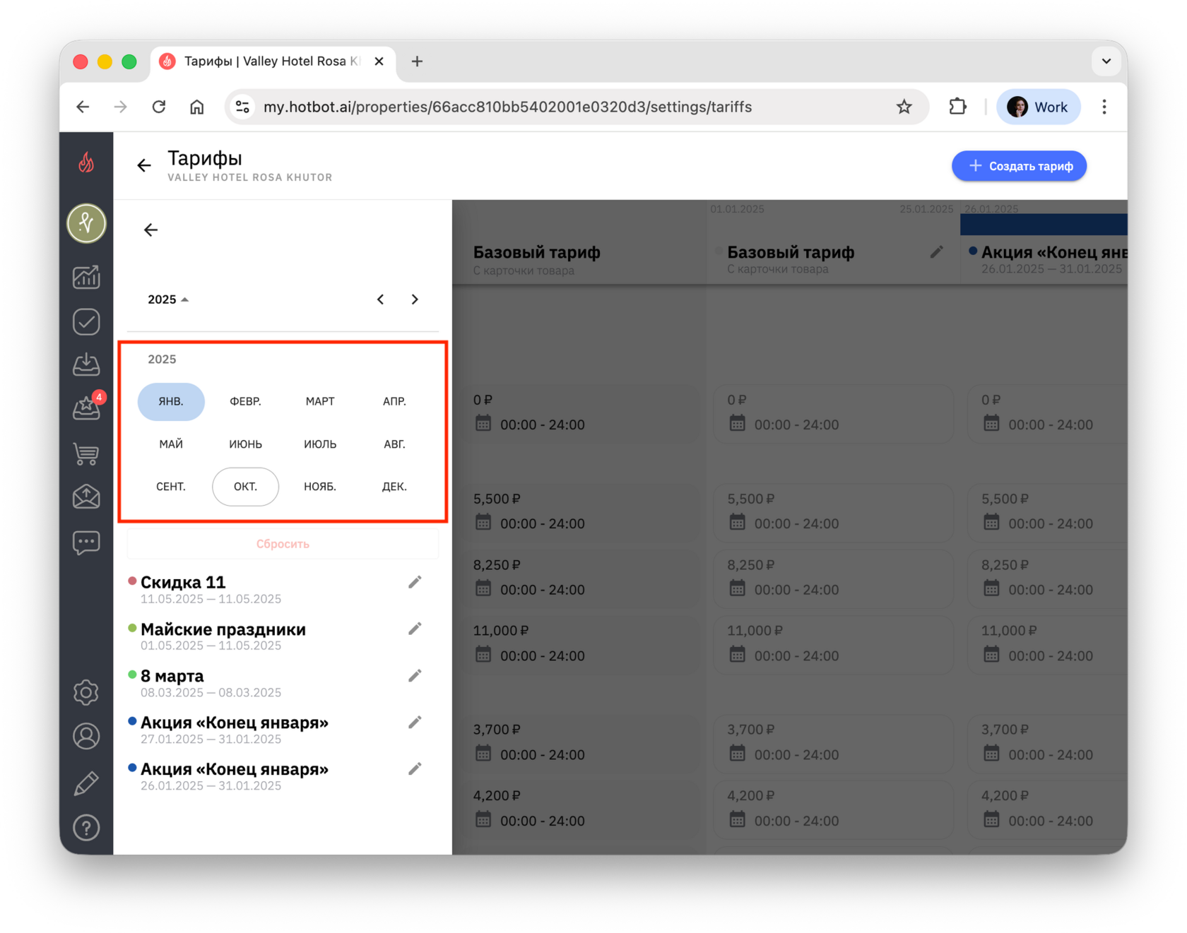 Если вы создаете тариф на будущие даты (например, тариф на декабрь в октябре), сначала переключите календарь на нужный месяц, а затем нажмите + Создать тариф.