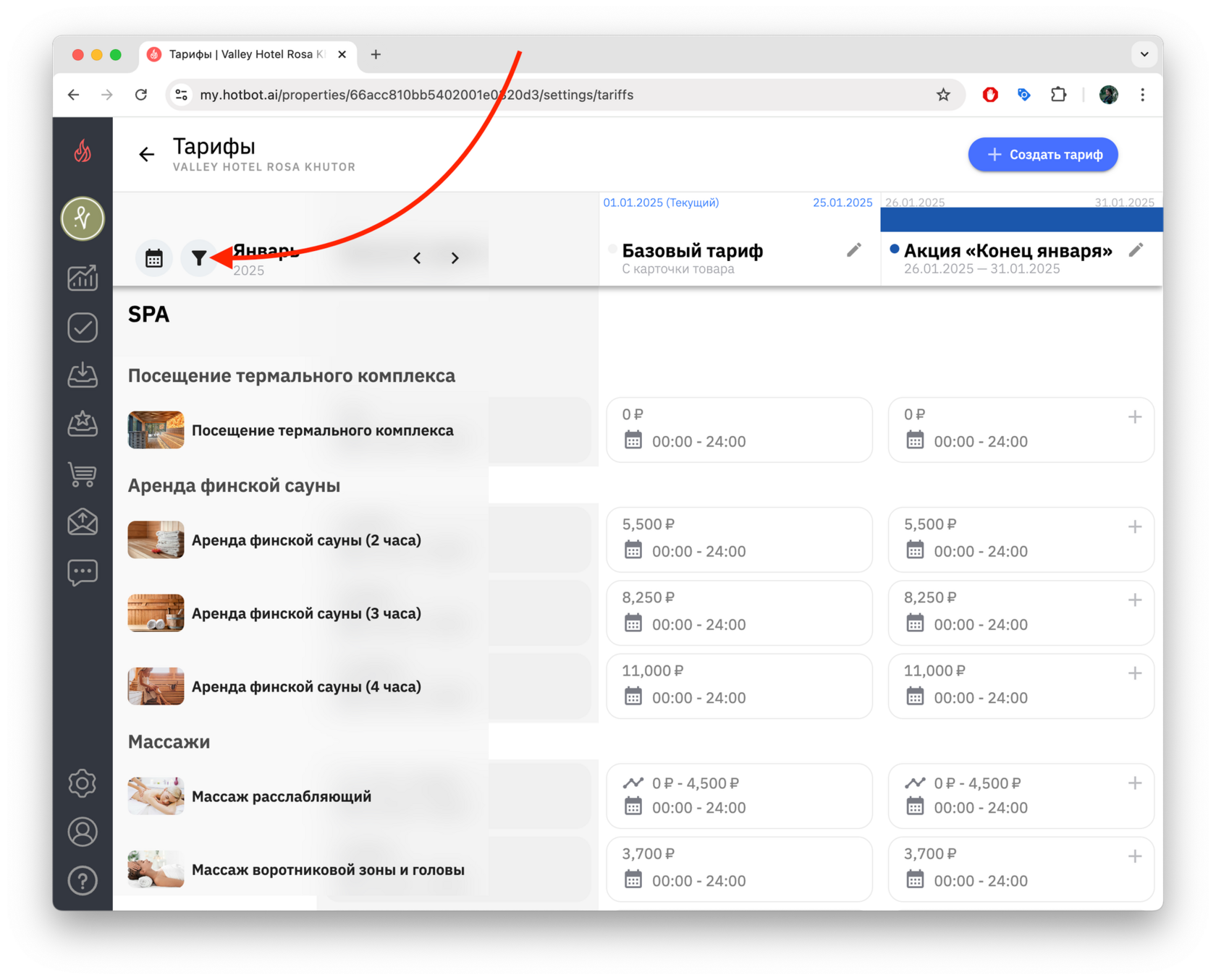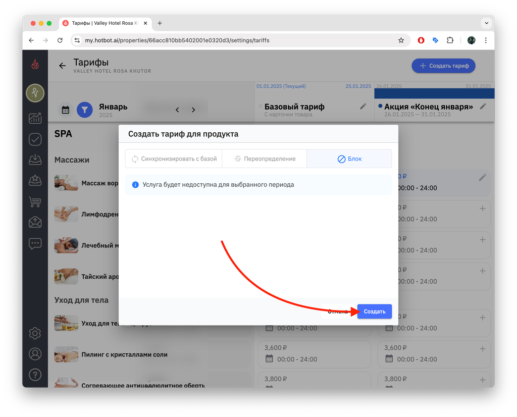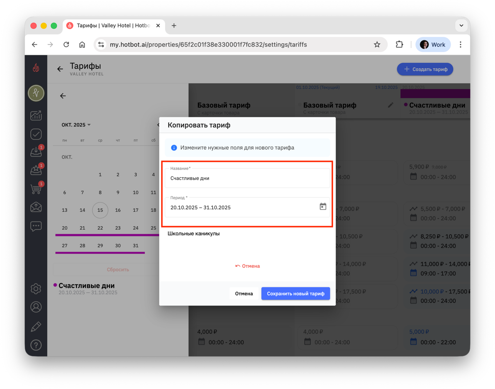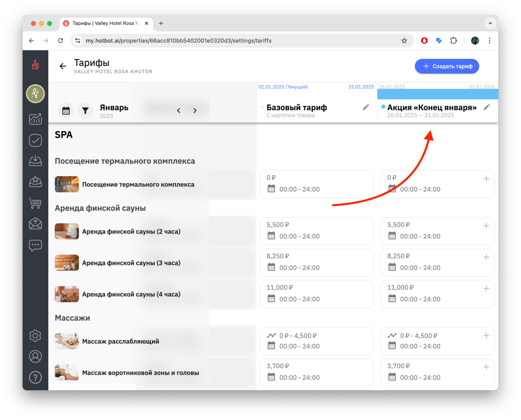 Если вы создаете тариф на будущие даты (например, тариф на декабрь в октябре), сначала переключите календарь на нужный месяц, а затем нажмите + Создать тариф.