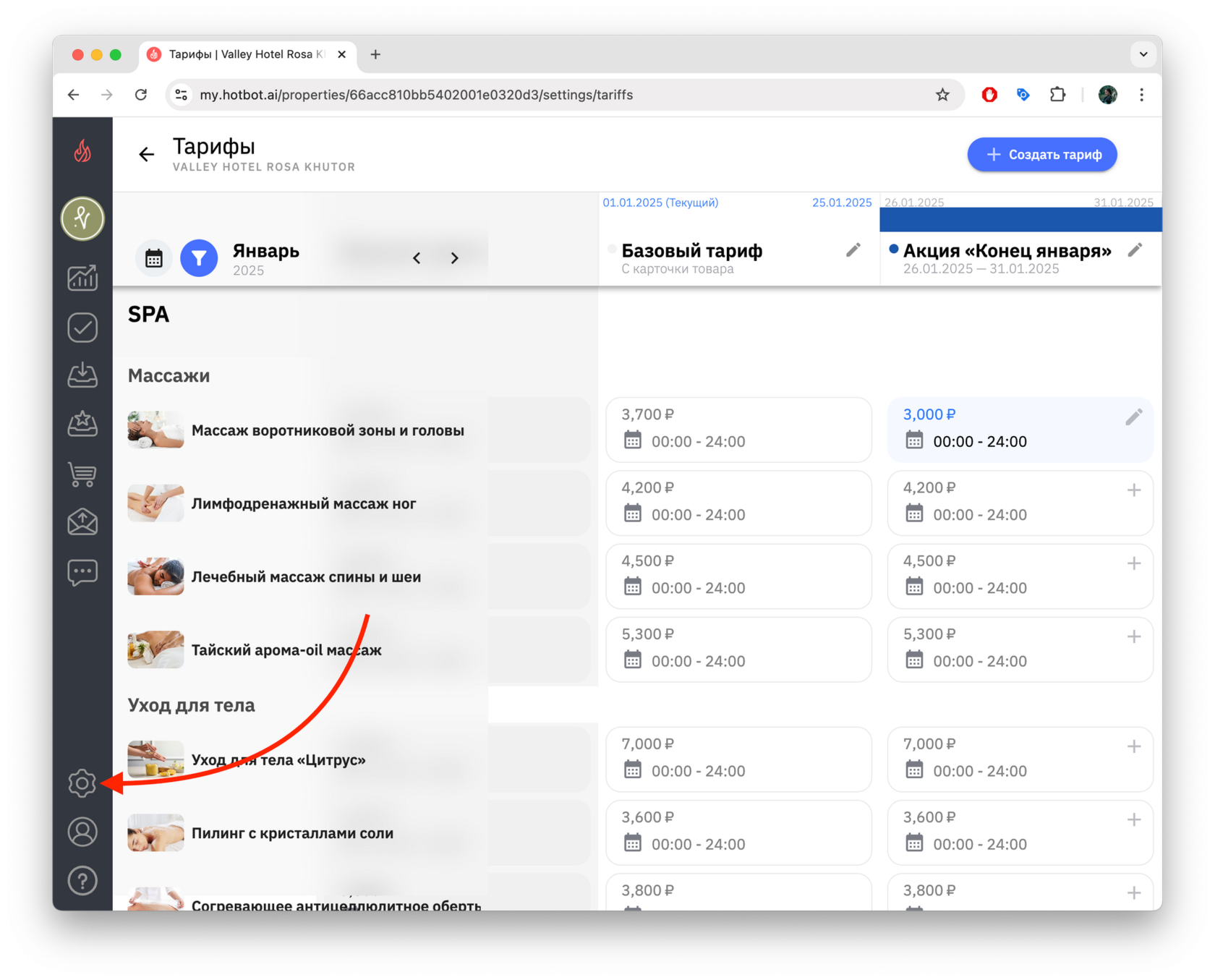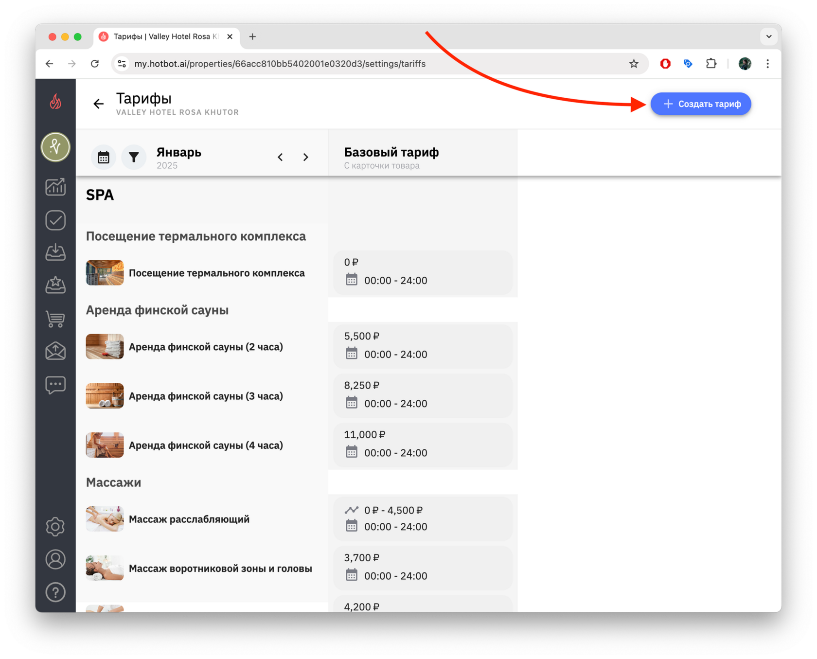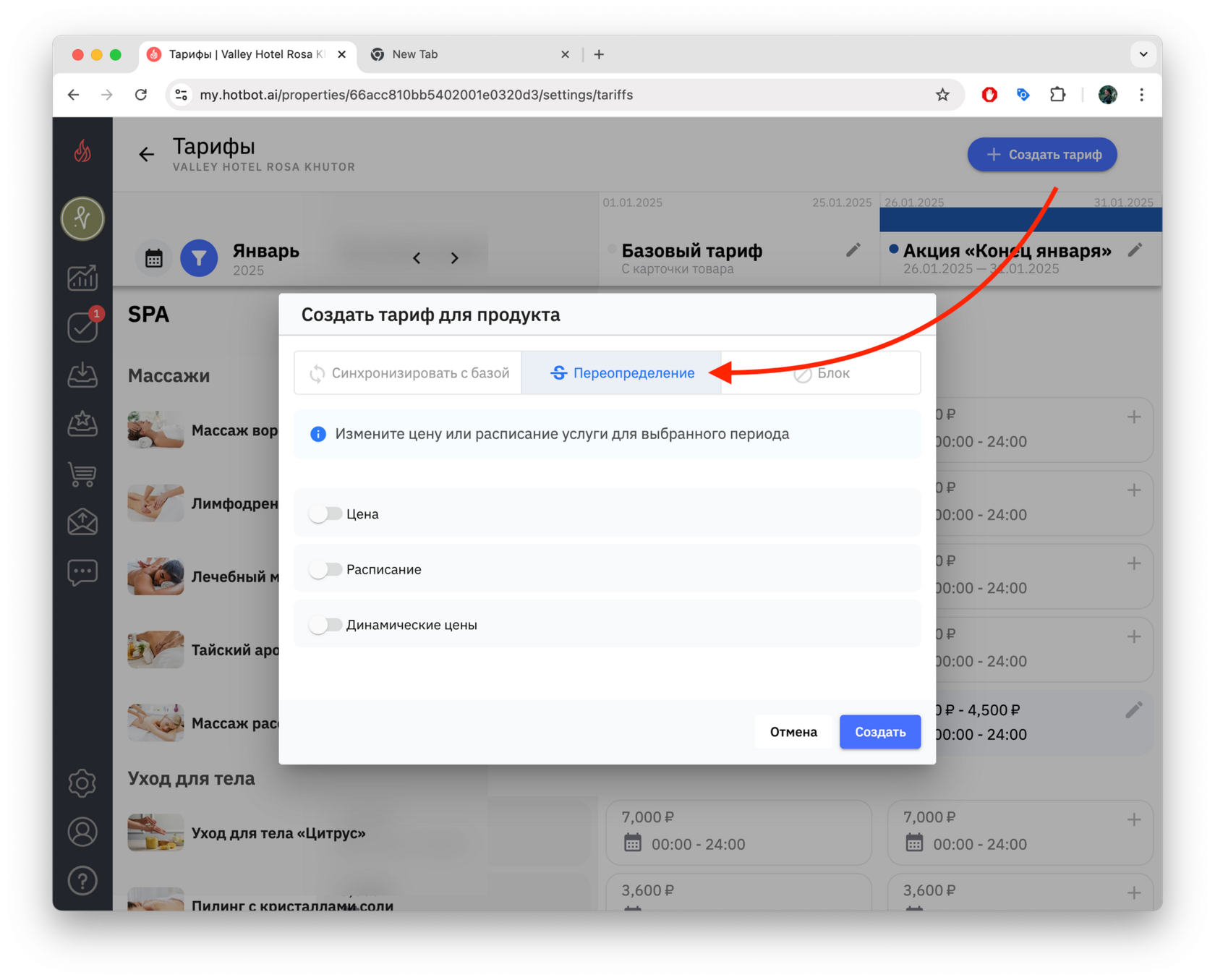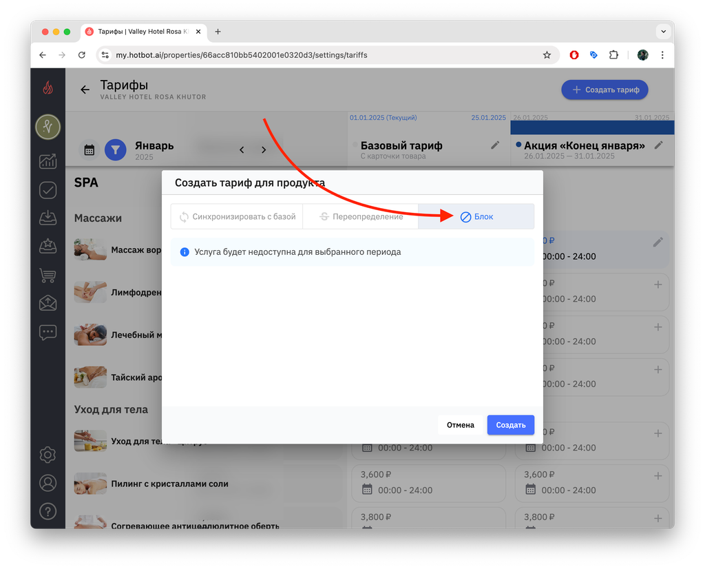 Если вы создаете тариф на будущие даты (например, тариф на декабрь в октябре), сначала переключите календарь на нужный месяц, а затем нажмите + Создать тариф.