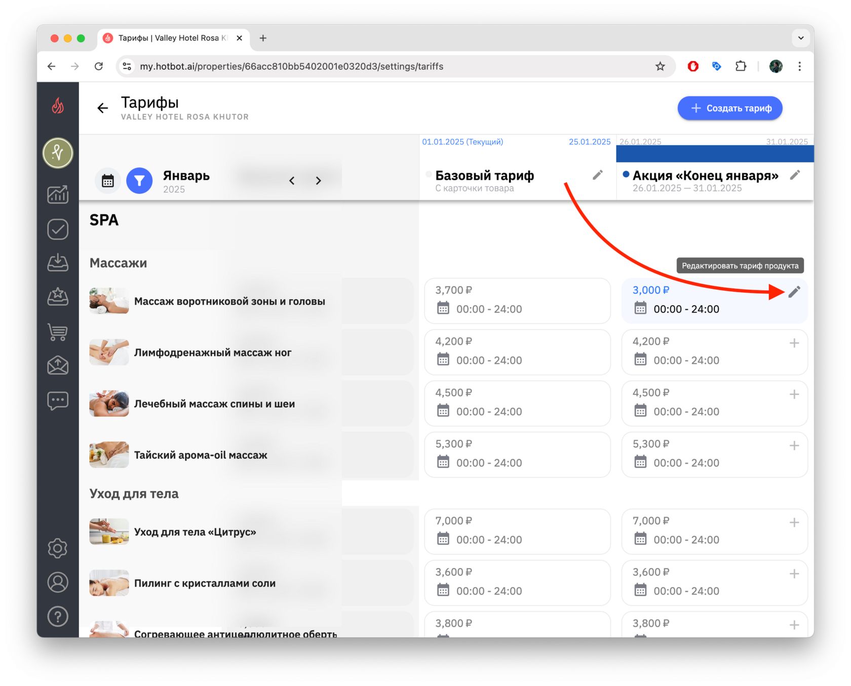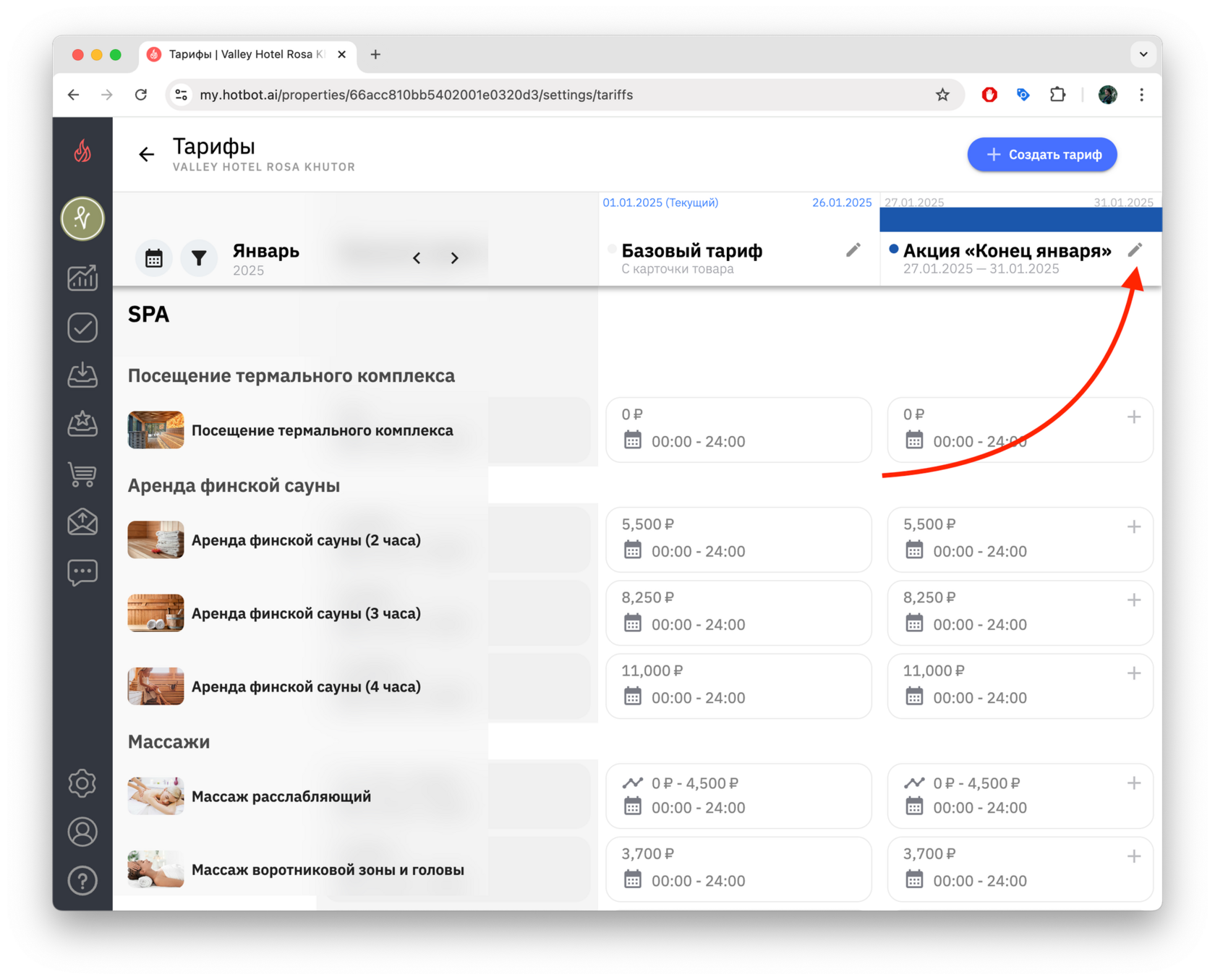 1. Найдите нужный тариф и нажмите ✎ — редактировать.