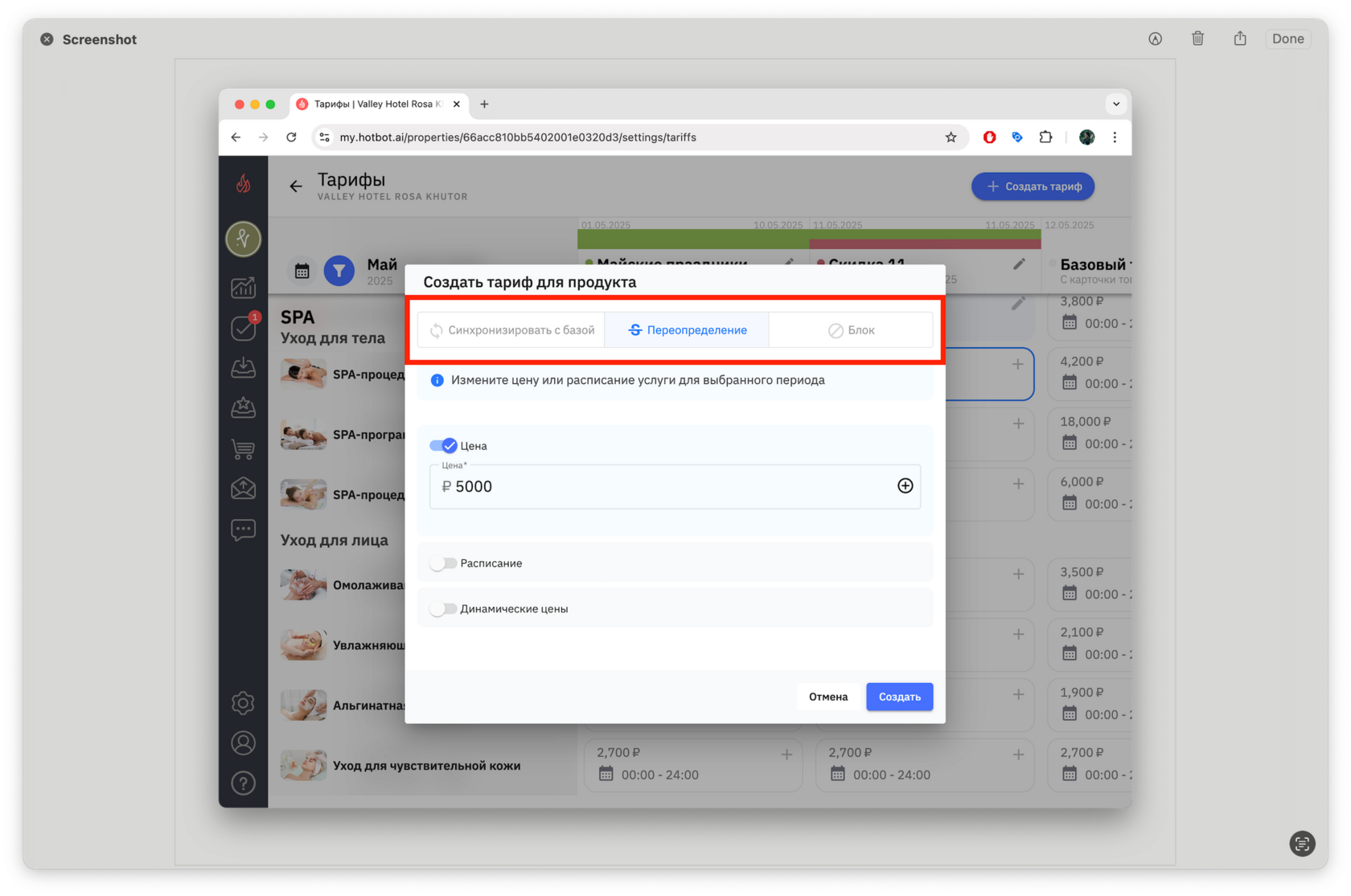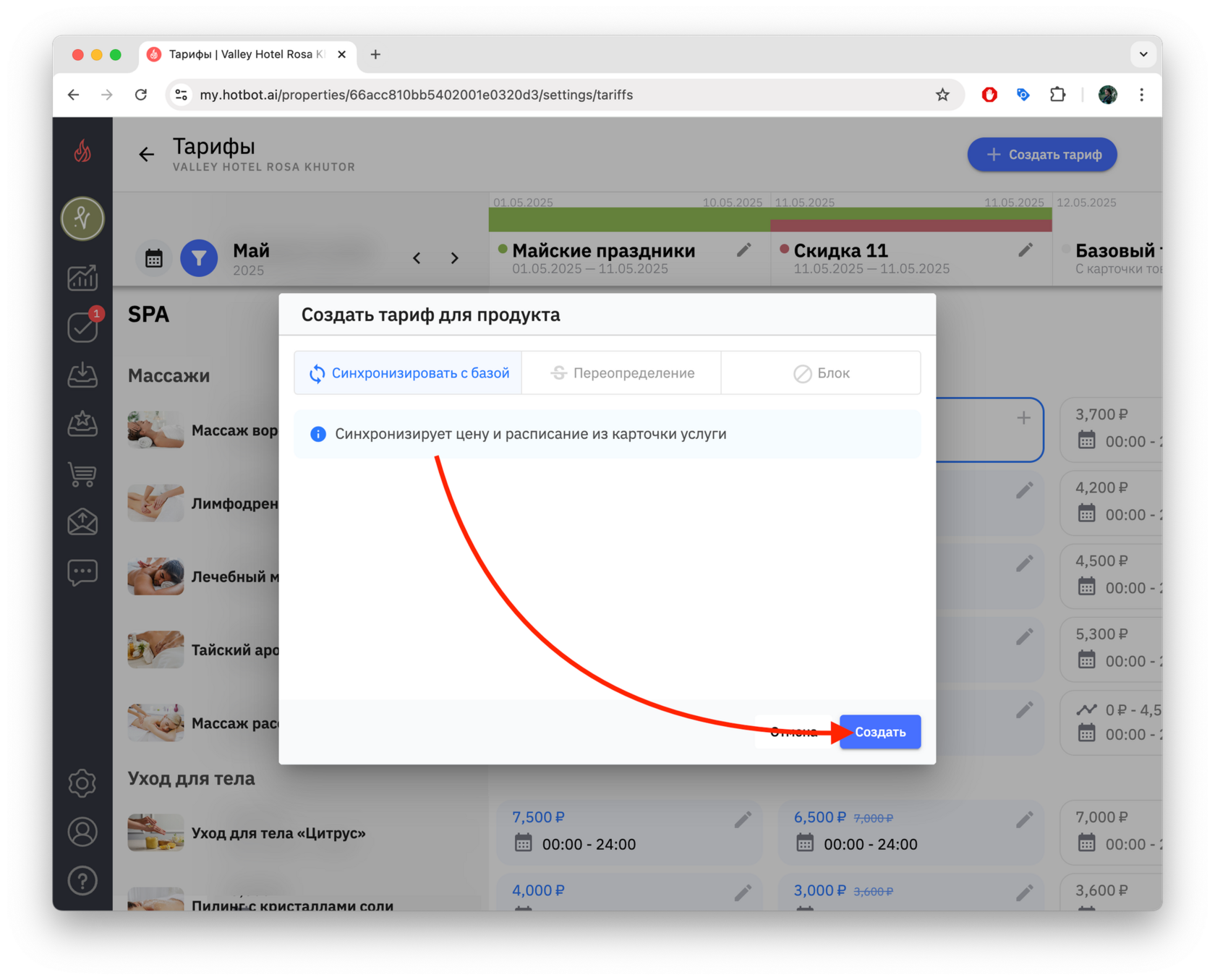 Чтобы синхронизировать цену с базовым тарифом, нажмите Синхронизировать с базой, а затем Создать.
