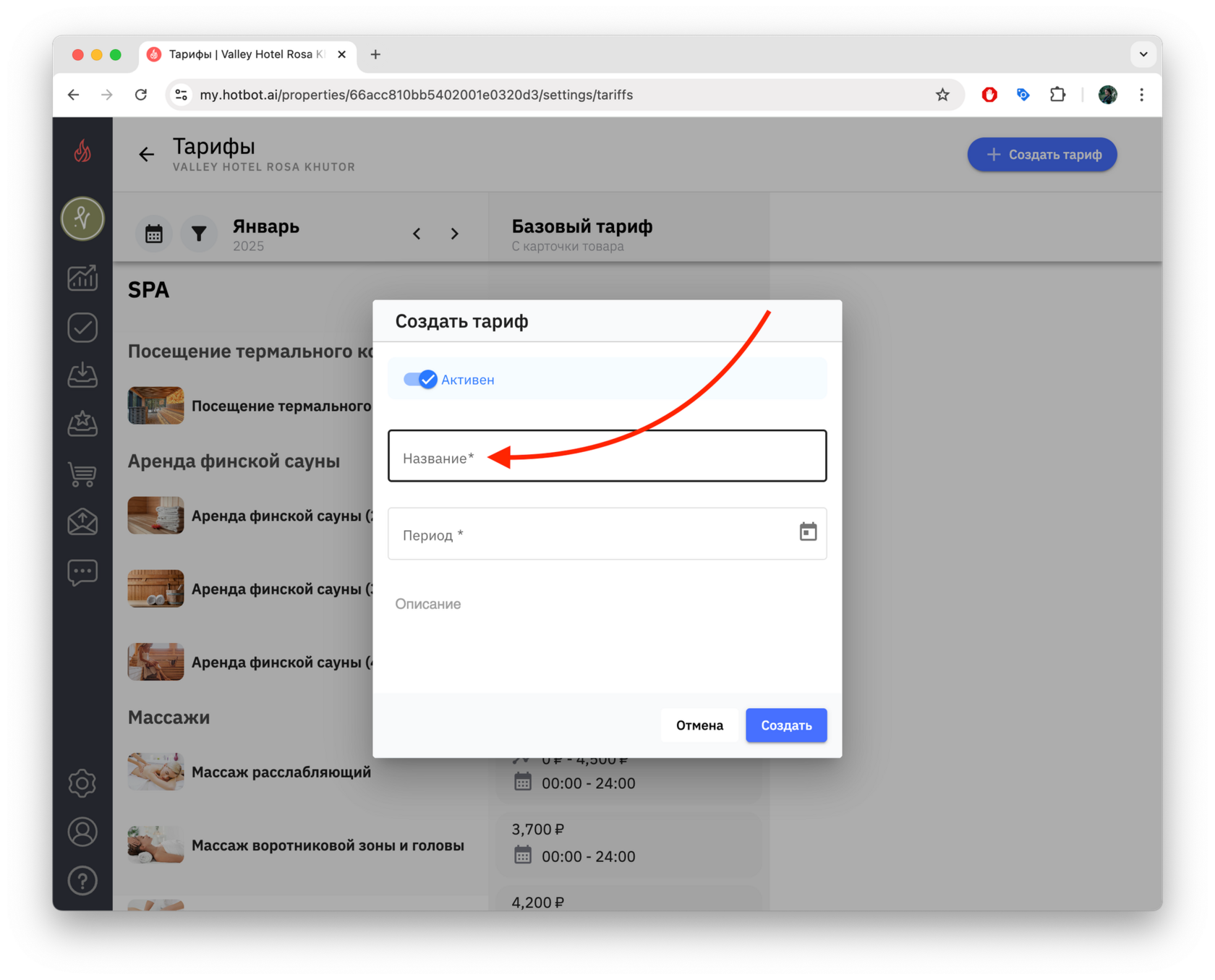 1. Нажмите + Создать тариф в правом верхнем углу страницы.