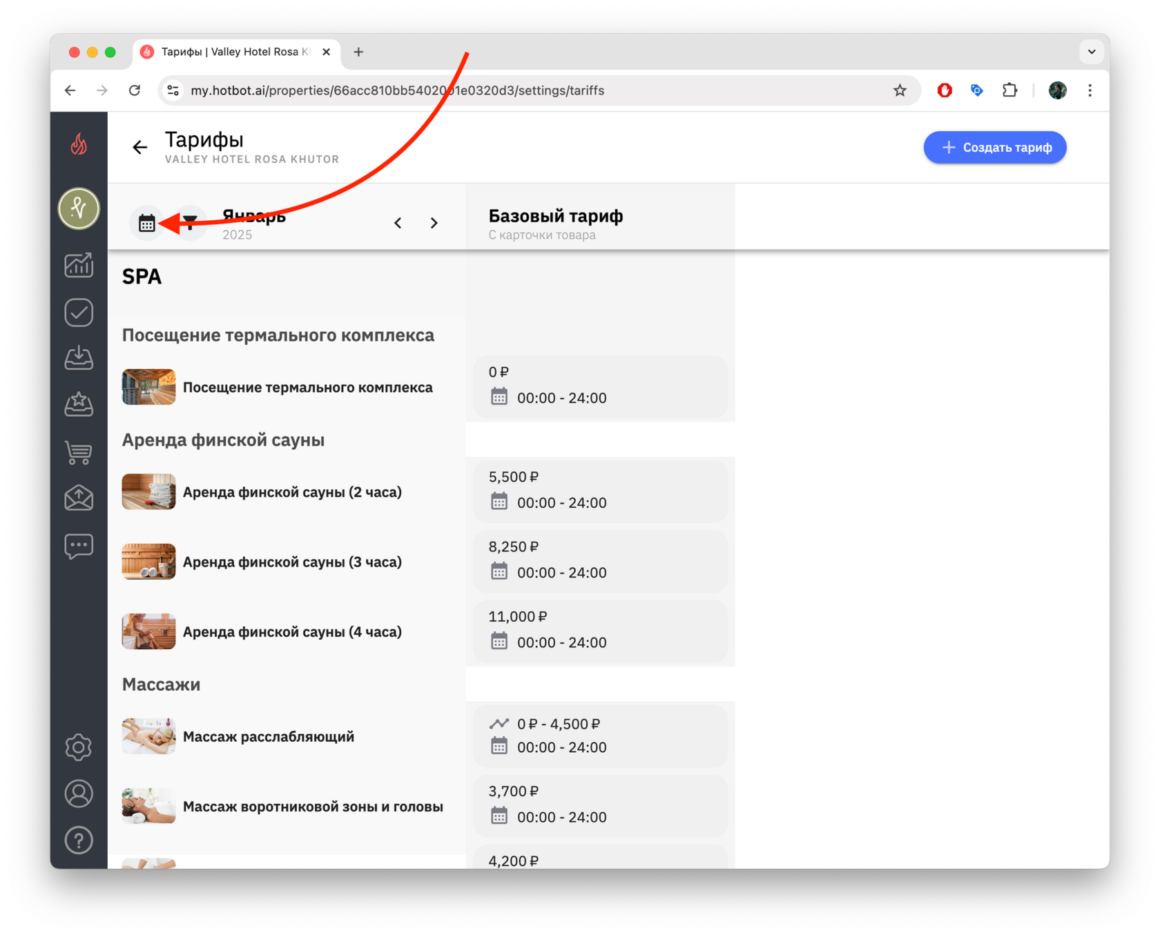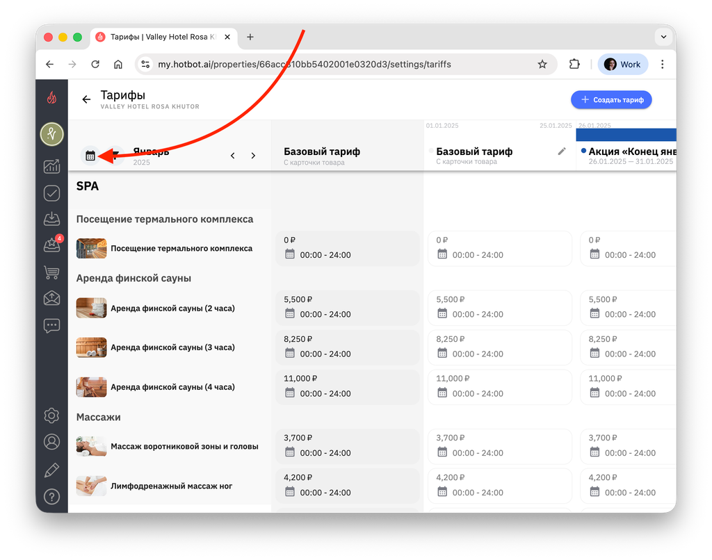 1. Чтобы просмотреть тарифы на другие периоды, нажмите на календарь в верхнем левом углу страницы.