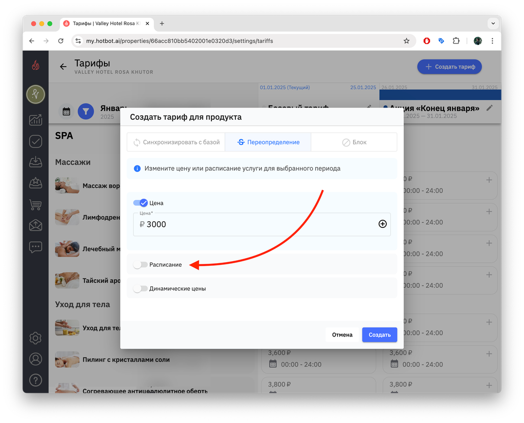 - Расписание — на период действия тарифа можно изменить расписание выбранных услуг.