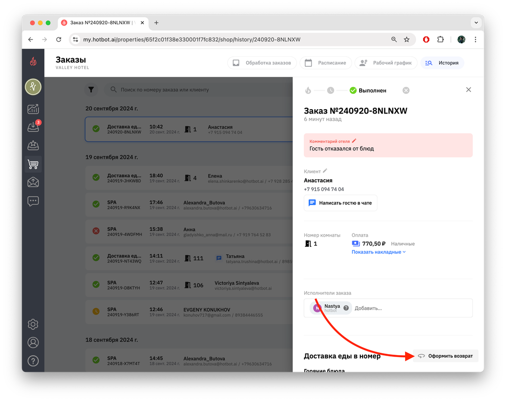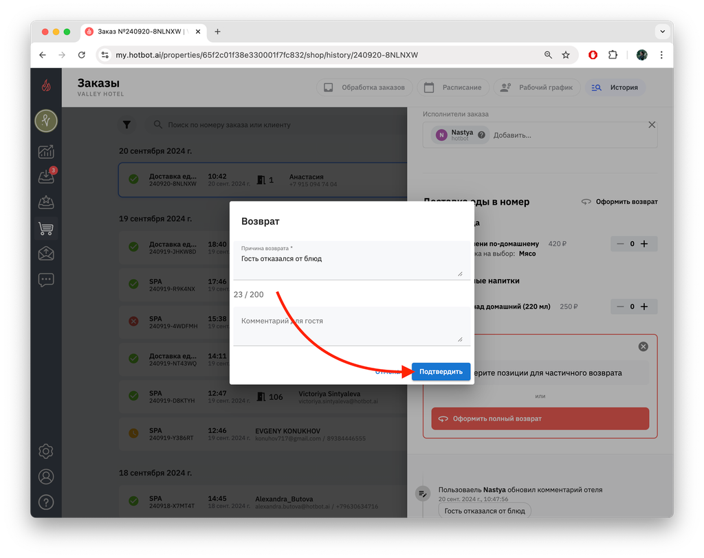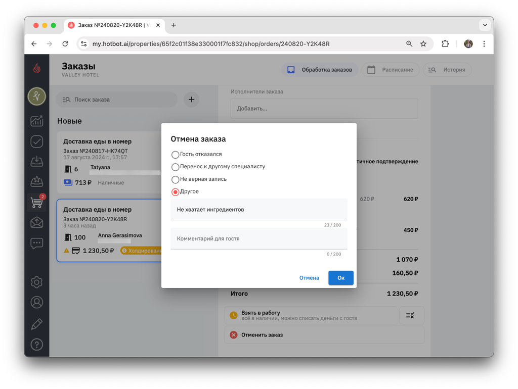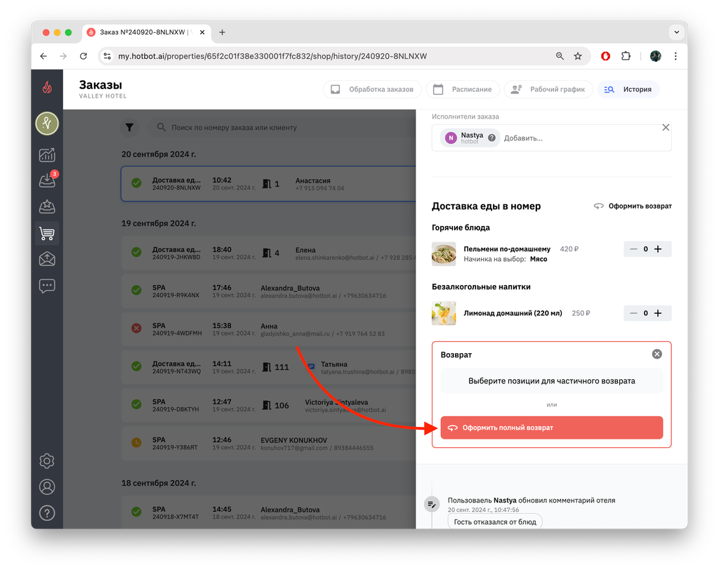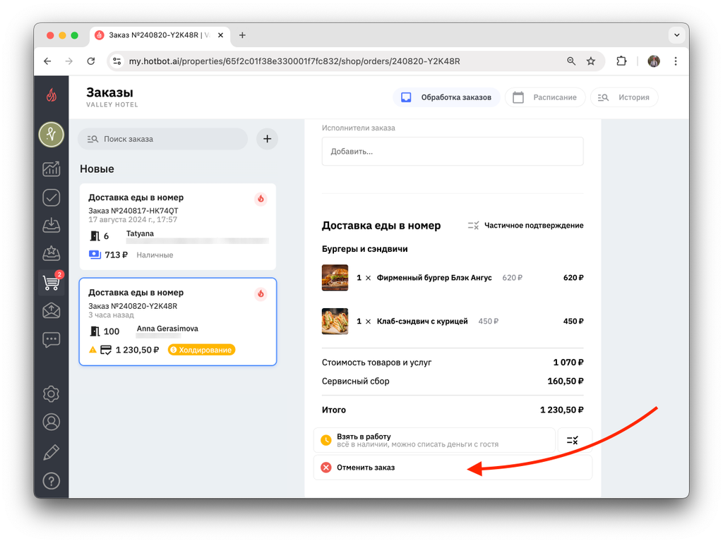 Если гость отменяет заказ полностью или частично, сумма к возврату рассчитывается автоматически.