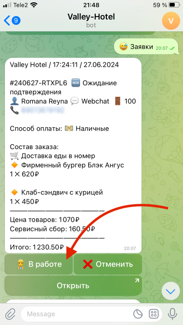 1. Нажмите 👷 В работе — заказ перейдет в работу.