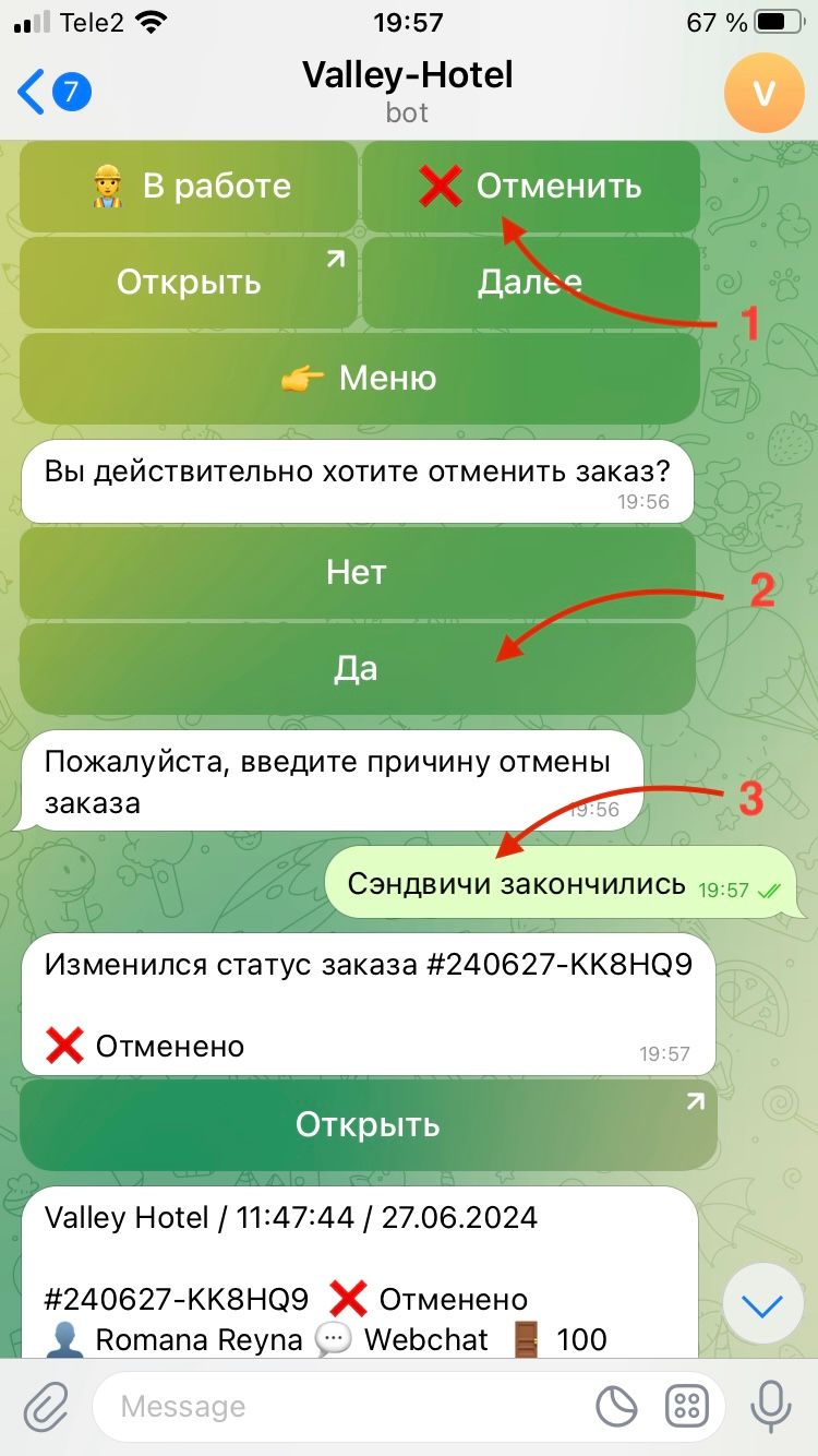 После отмены заказ придет повторным уведомлением в статусе ❌ Отменено.