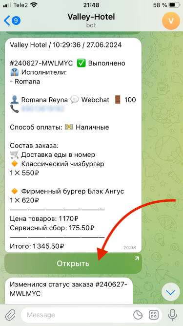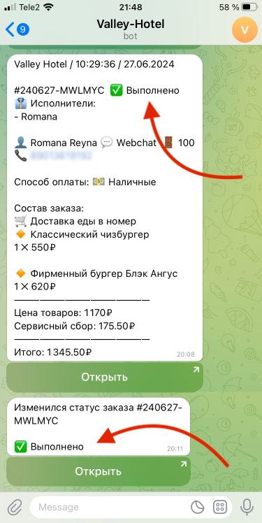 3. В подтверждение изменения статуса вы получите сообщение с тем же заказом в статусе ✅ Выполнено