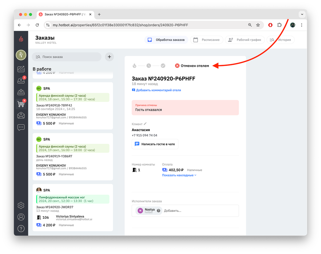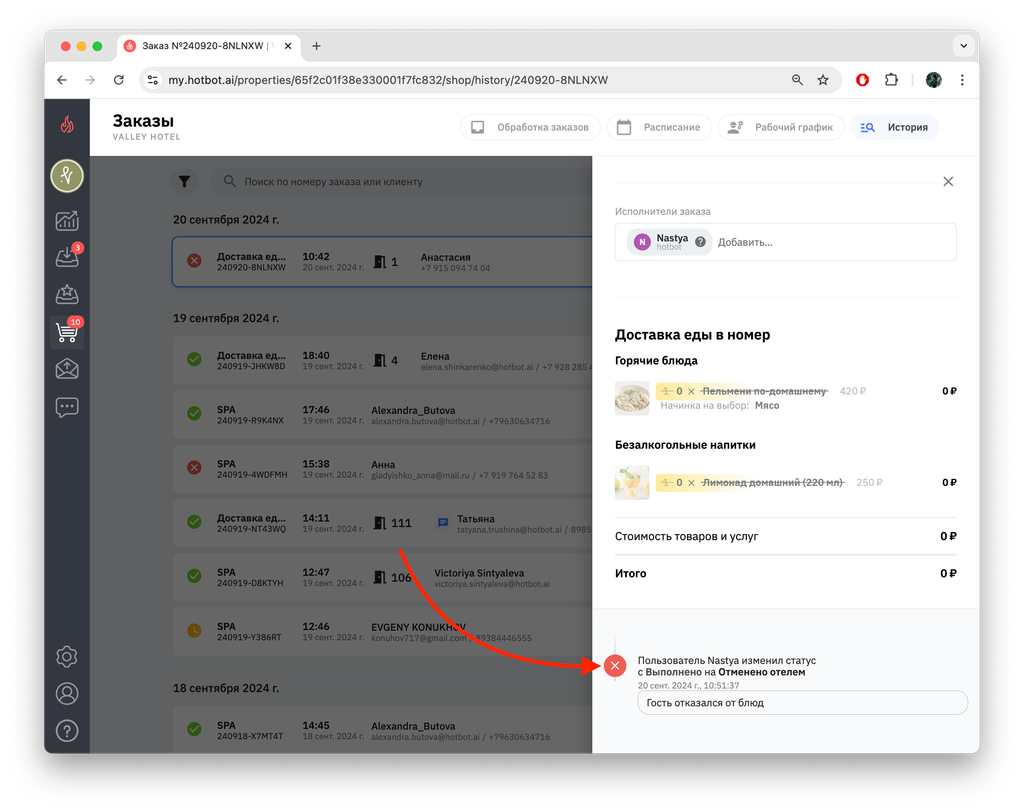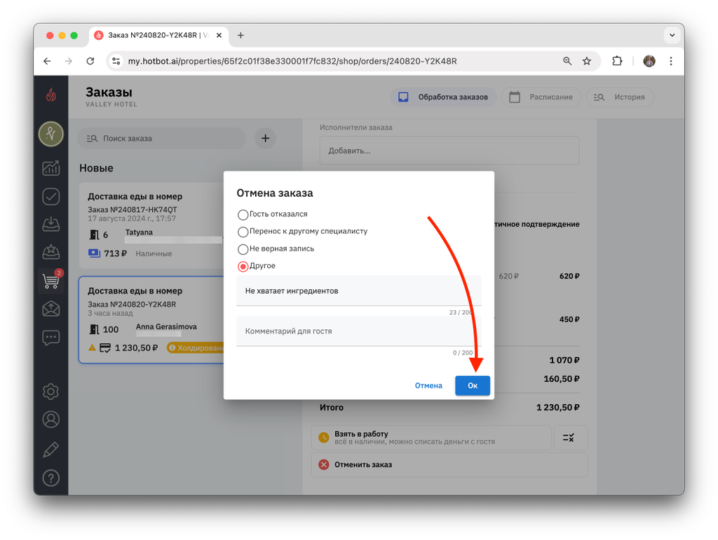 4. Подтвердите действие — заказ перейдет в статус Отменен отелем
