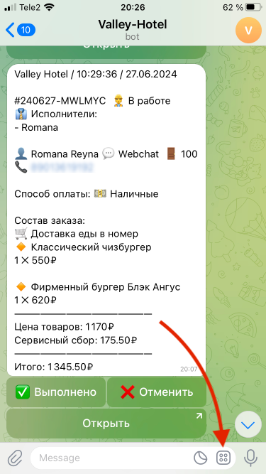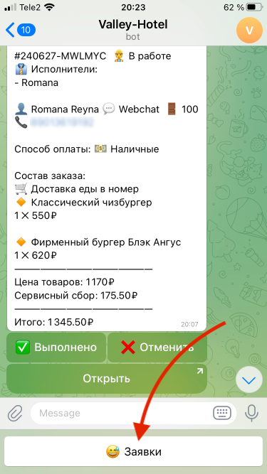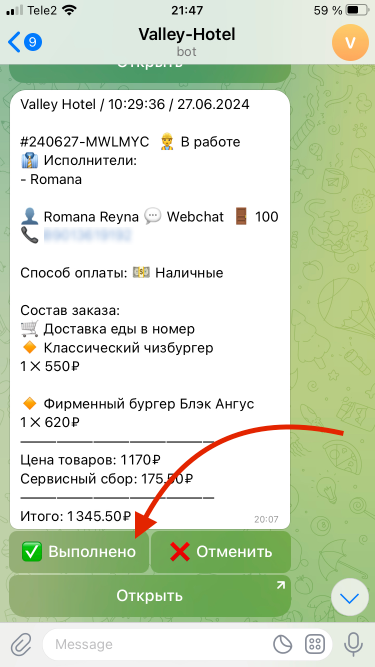 2. Когда заказ выполнен, нажмите ✅ Выполнено