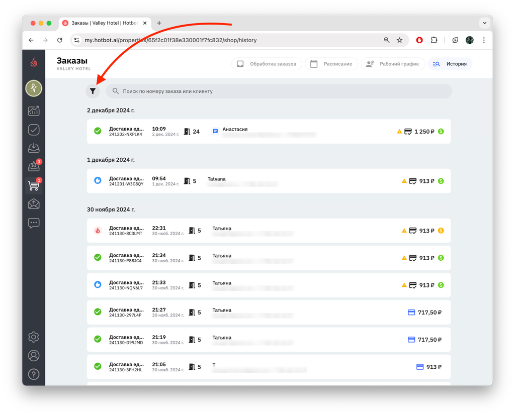 В верхнем левом углу страницы нажмите на иконку воронки, чтобы отфильтровать заказы по дате создания и статусу.