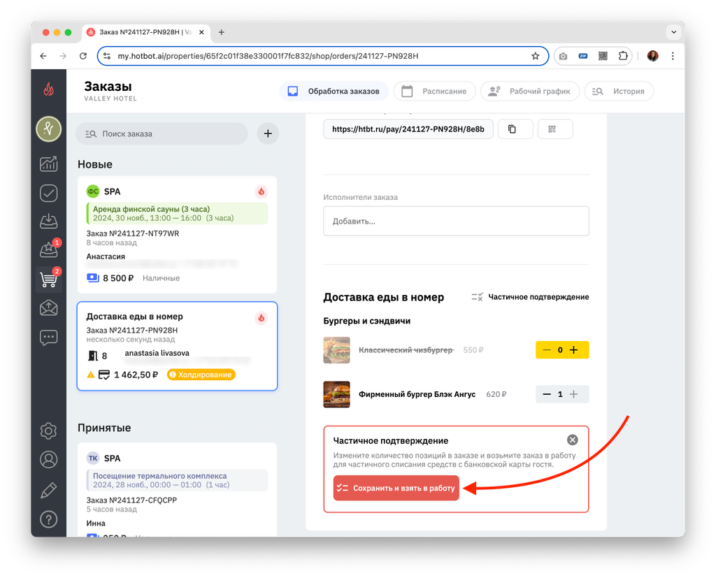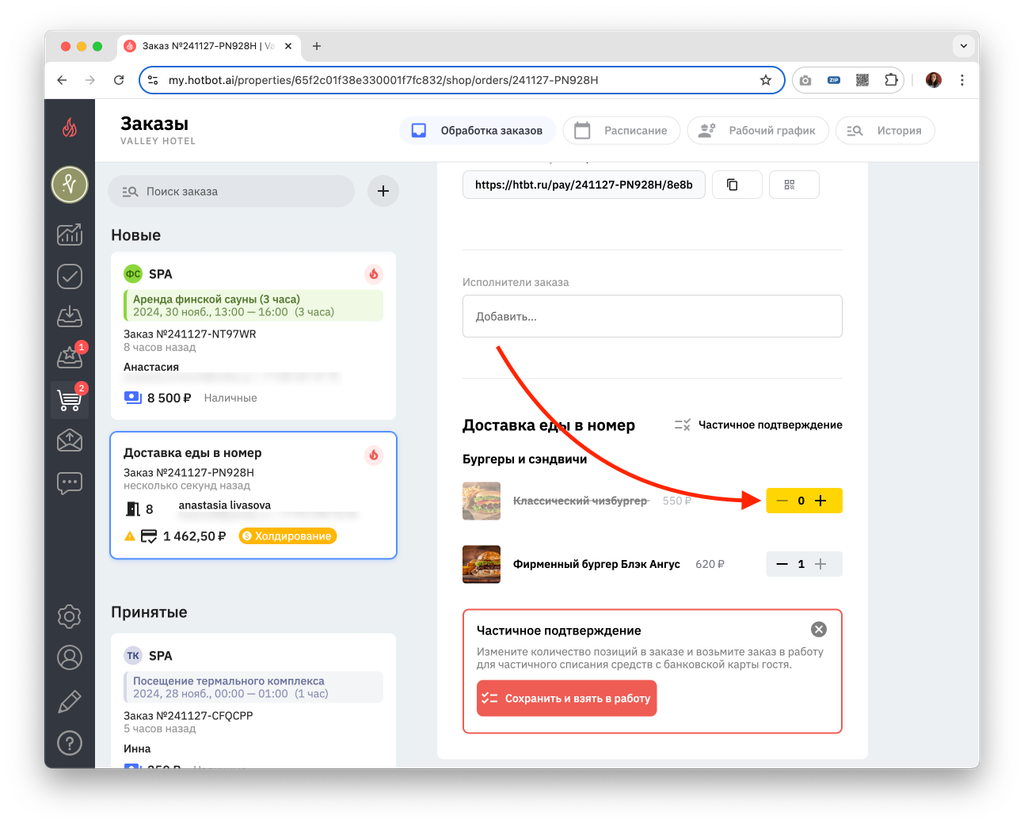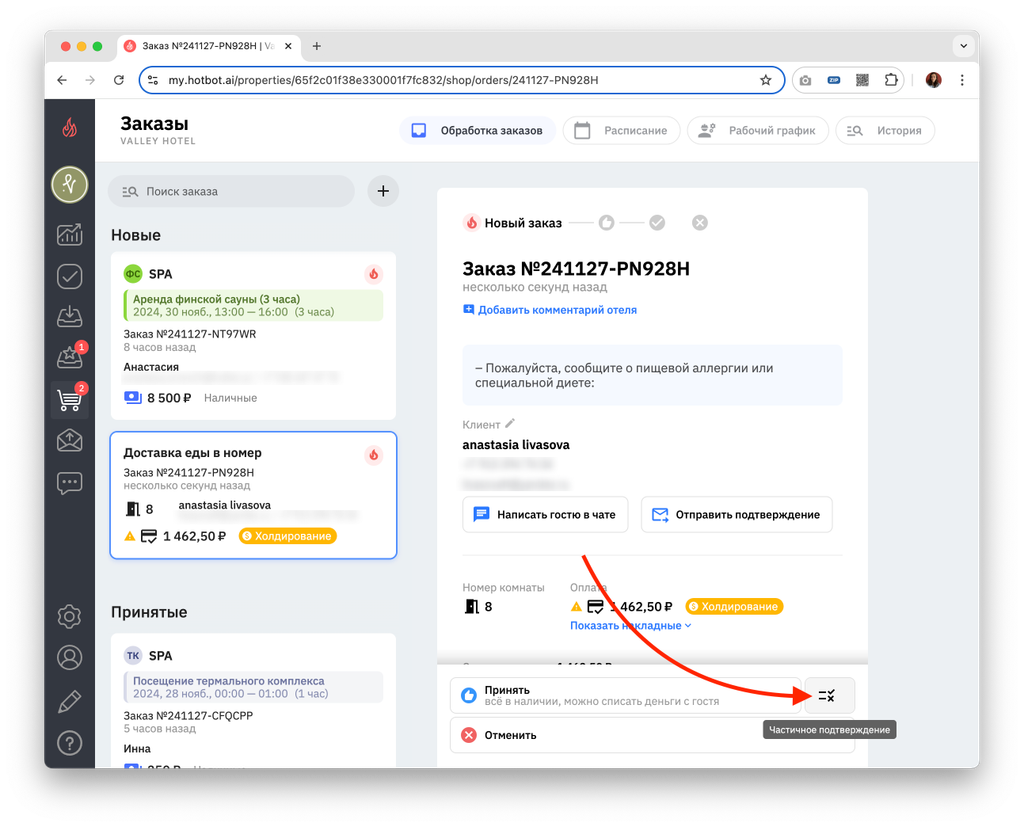 1. Уточните у гостя, можно ли убрать недоступную позицию. Затем нажмите Частичное подтверждение