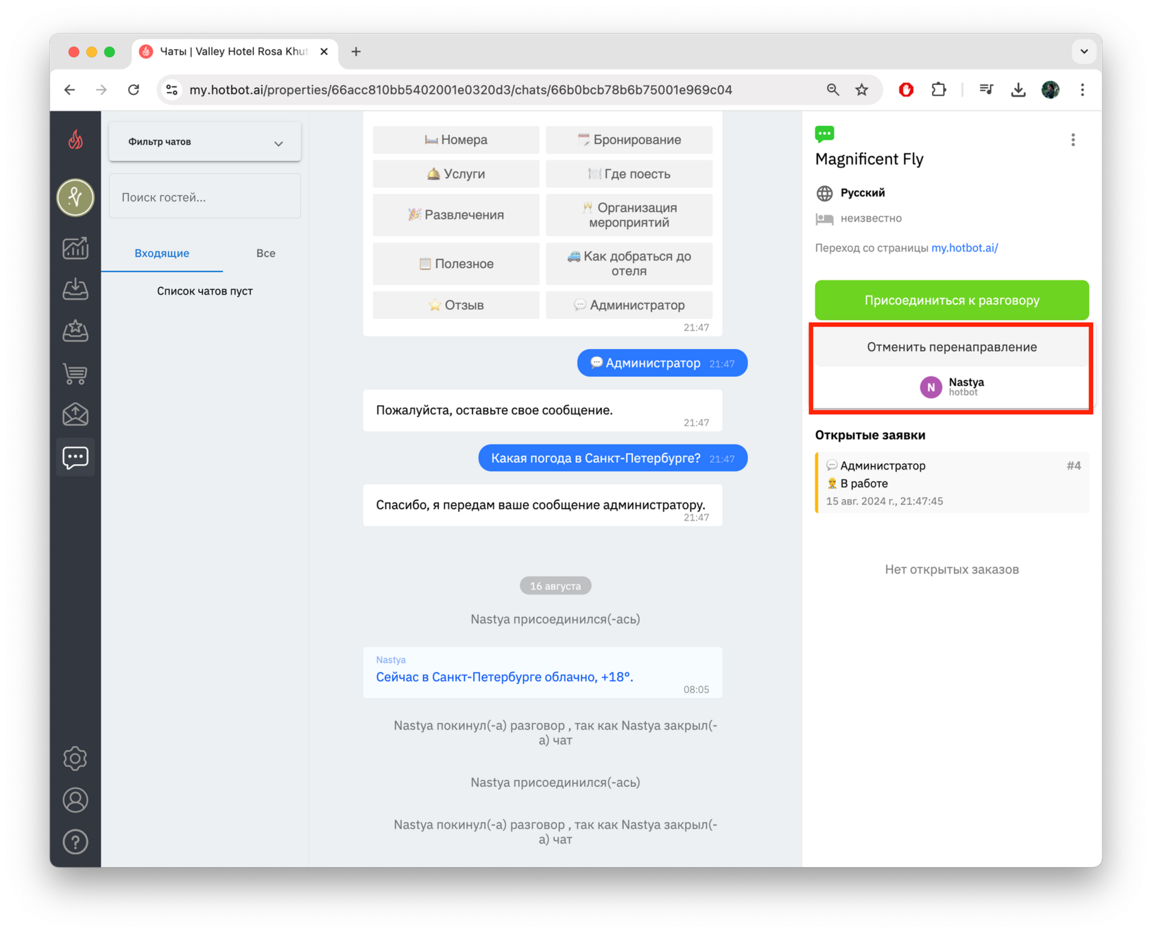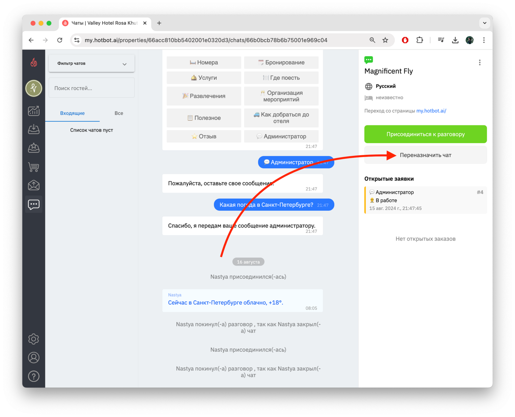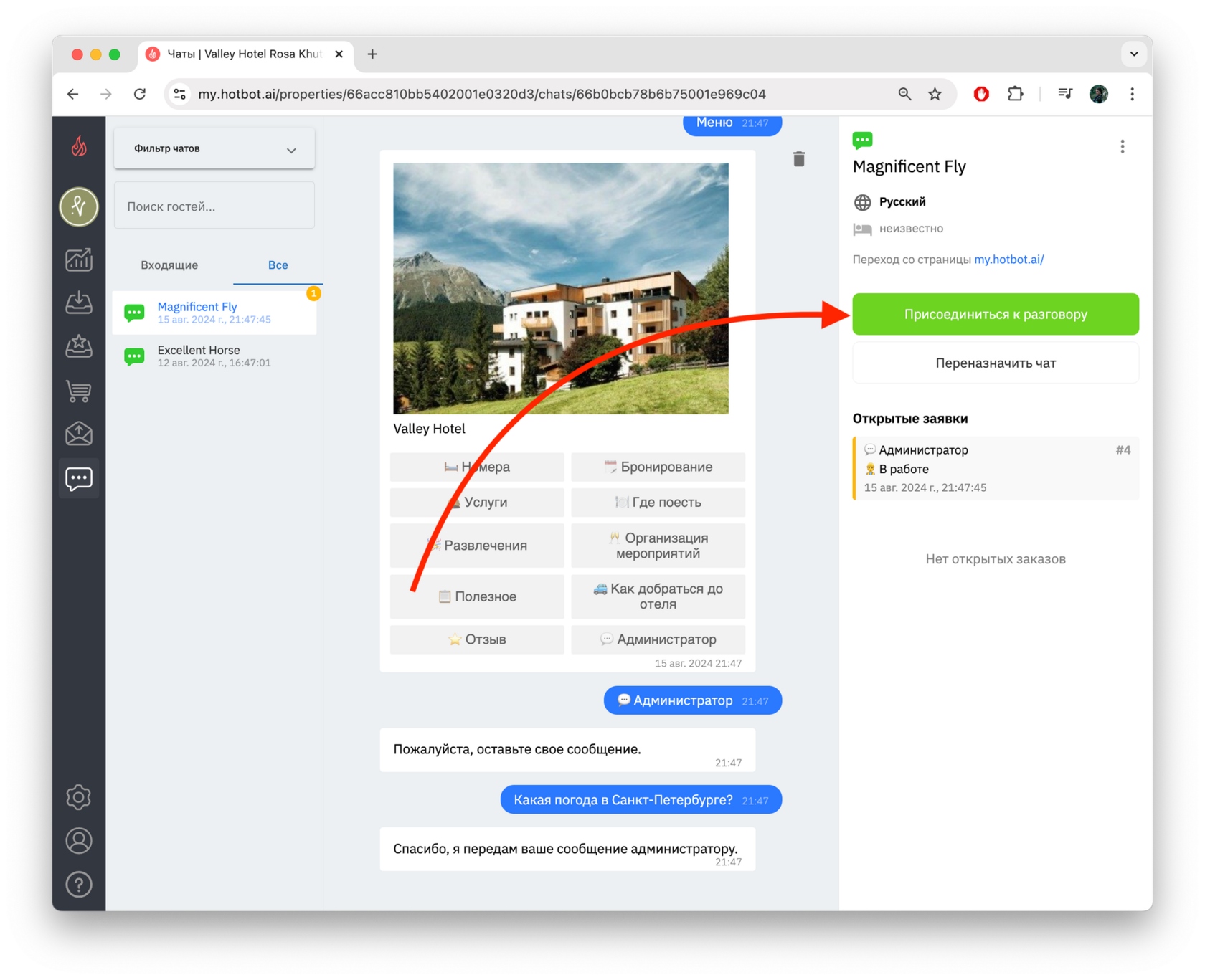 Сейчас на запросы гостя отвечает бот. Нажмите Присоединиться к разговору, чтобы гостю могли отвечать только вы.