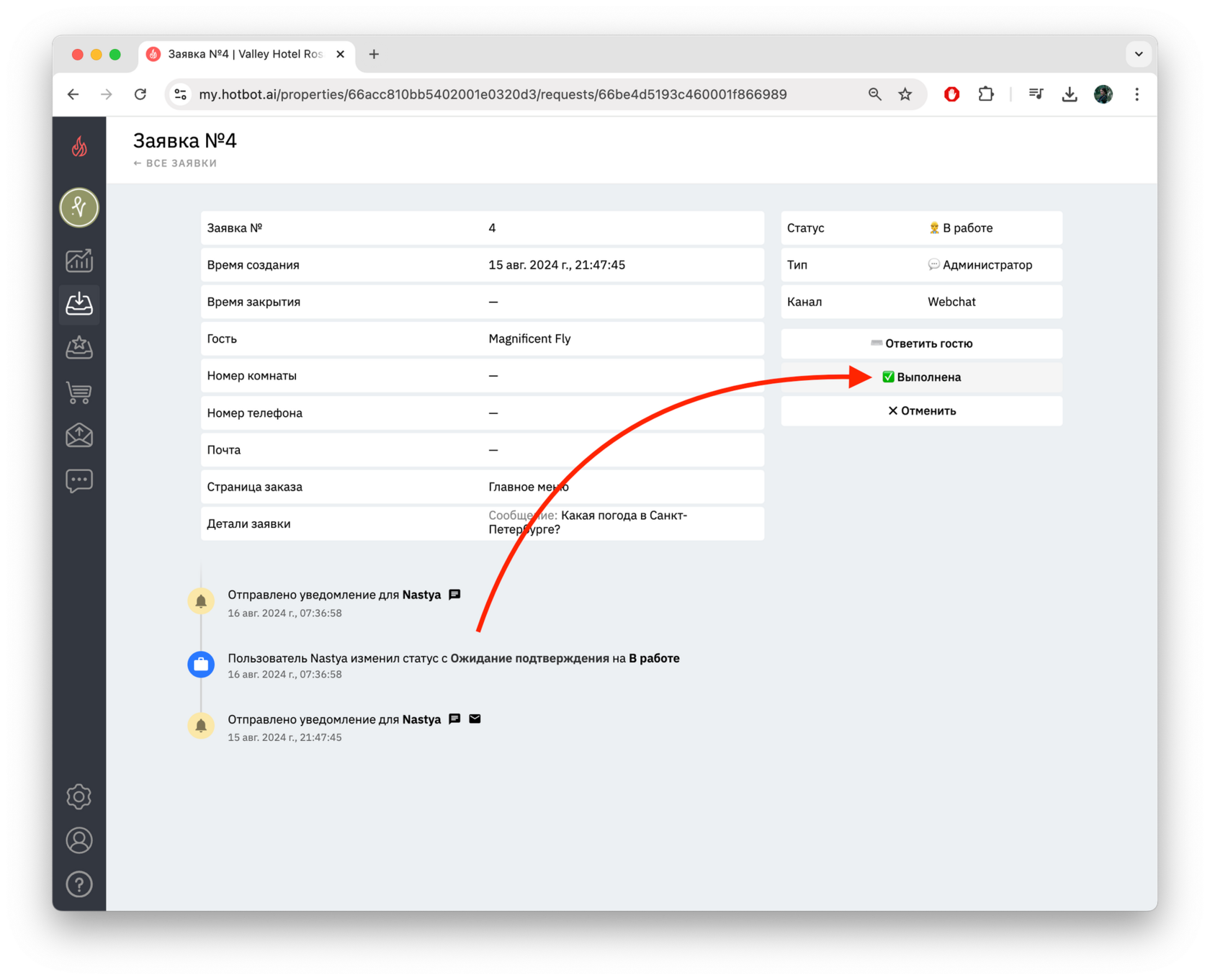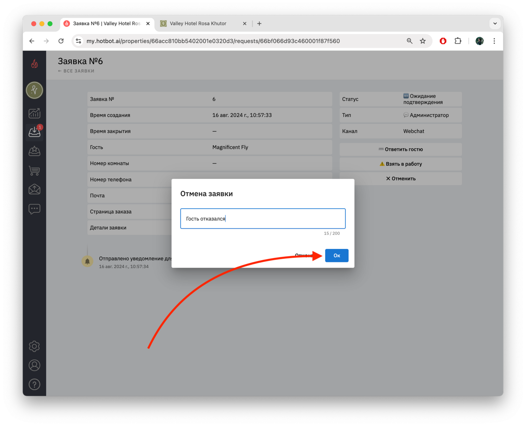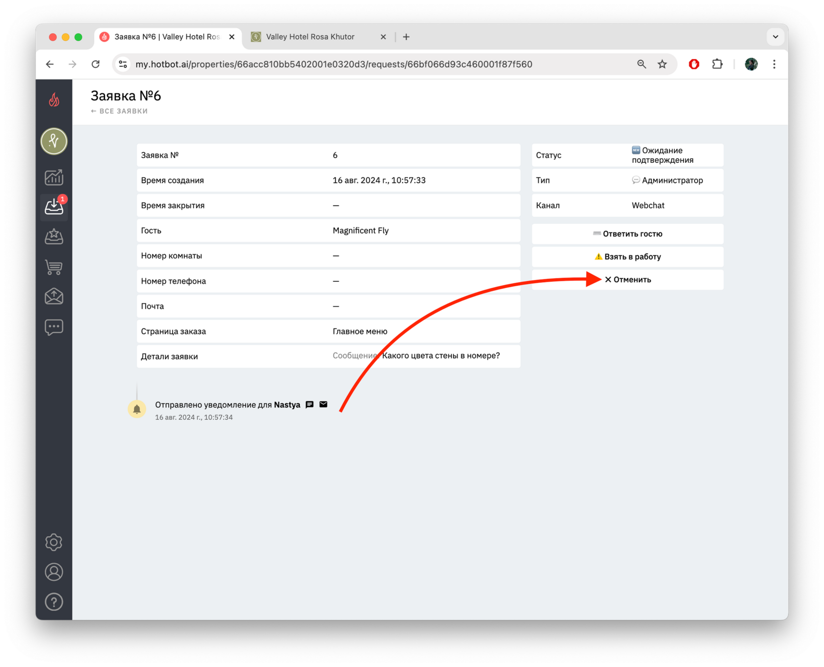 Гость может создать заявку, а затем отменить ее в чат-боте.