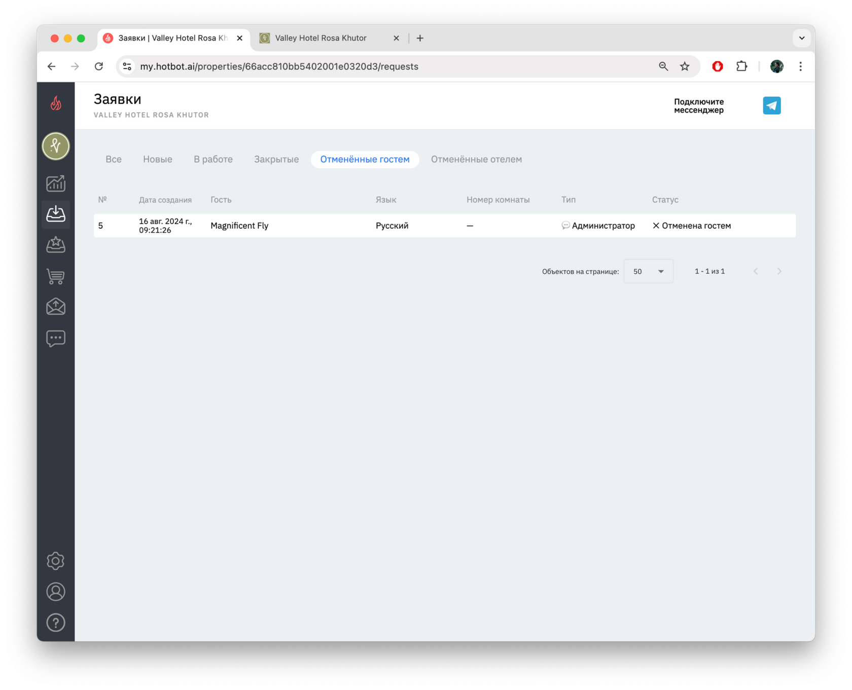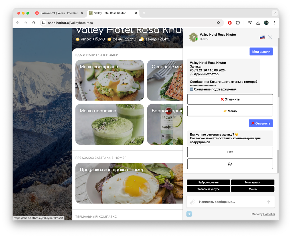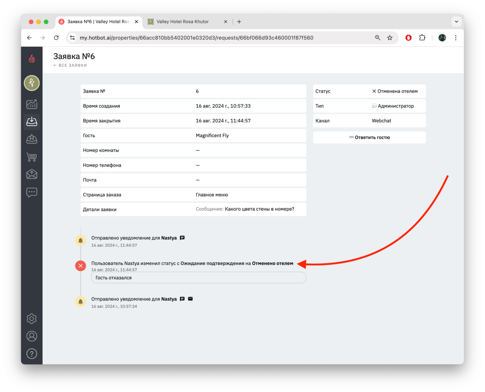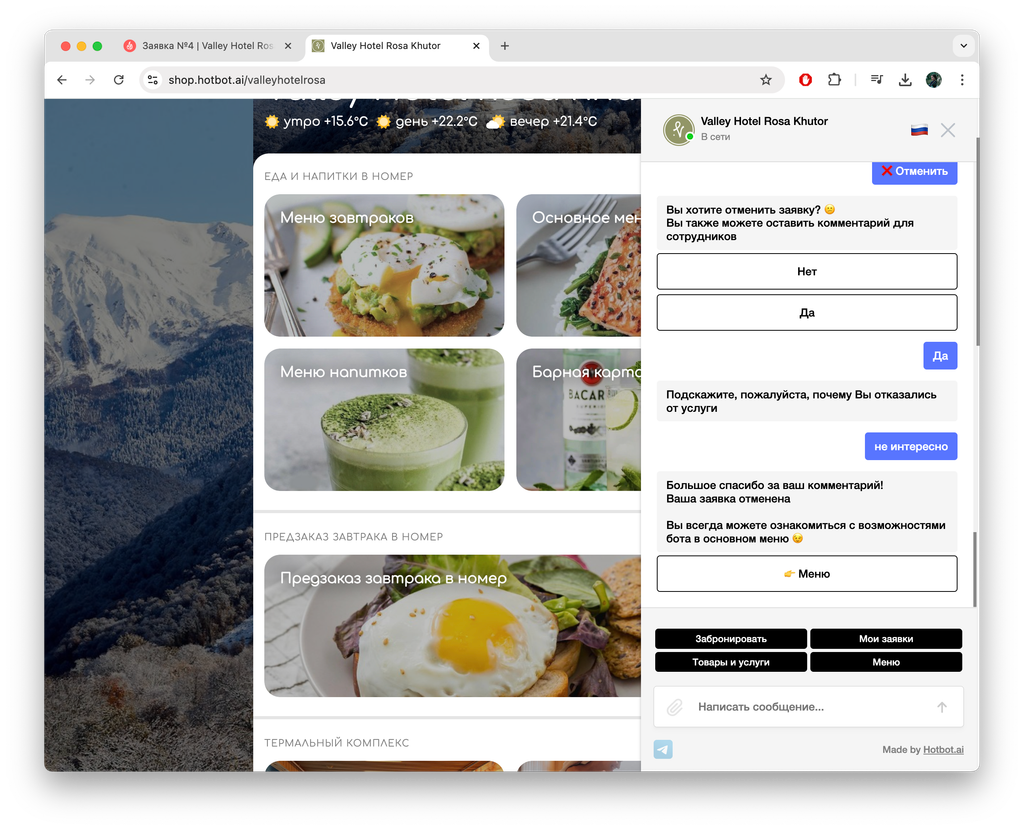 Гость может создать заявку, а затем отменить ее в чат-боте.