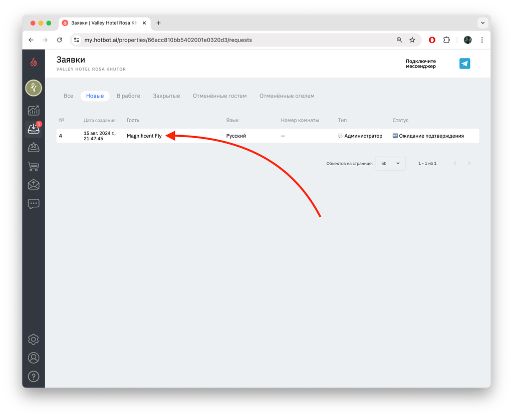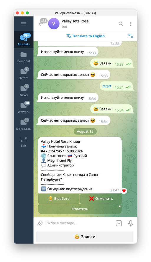 Чтобы обработать заявку в Telegram, откройте чат-бот отеля, куда пришло уведомление о новой заявке. В чате вы увидите сообщение с информацией о новой заявке.