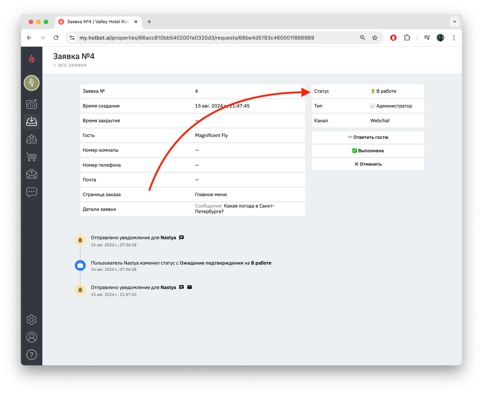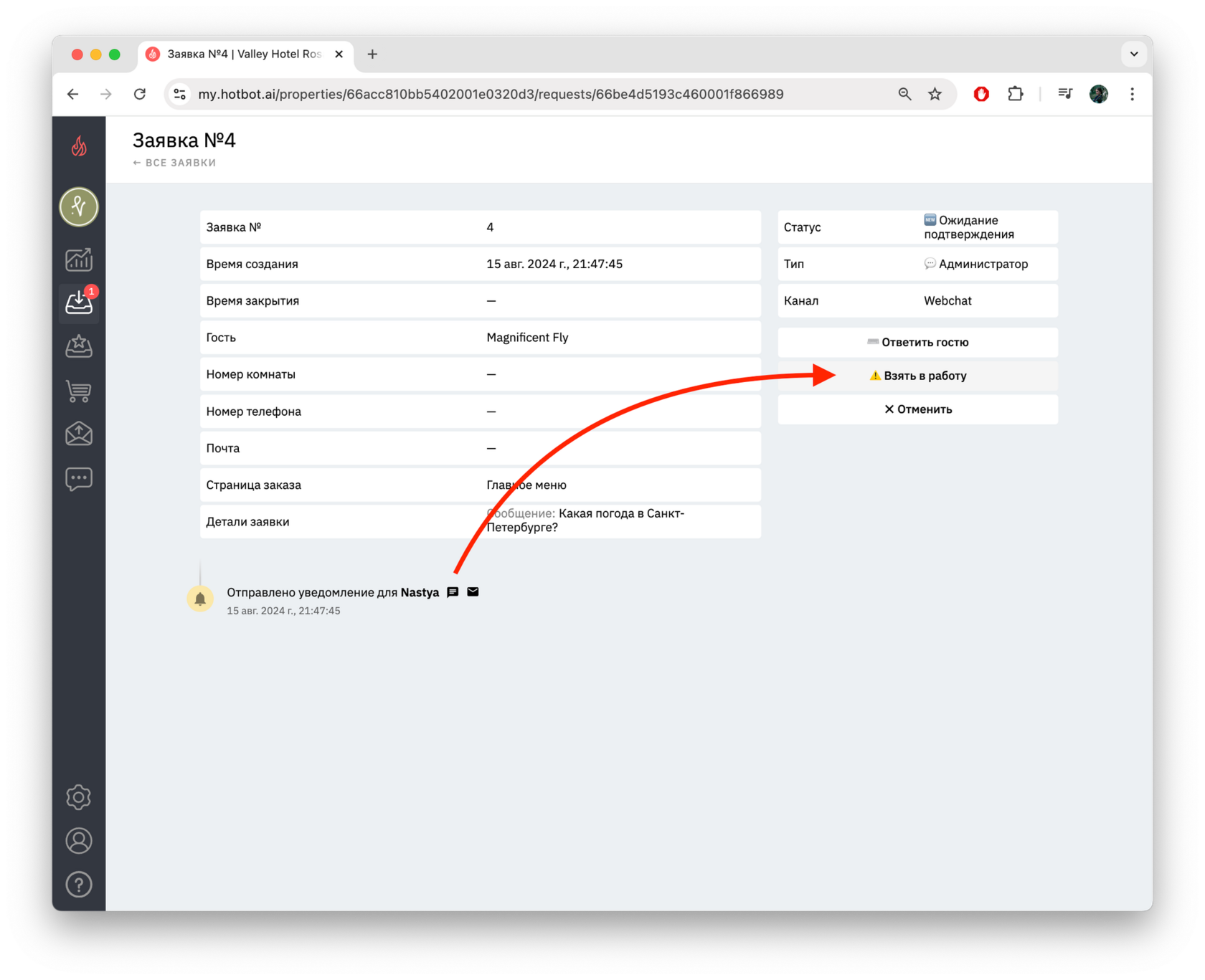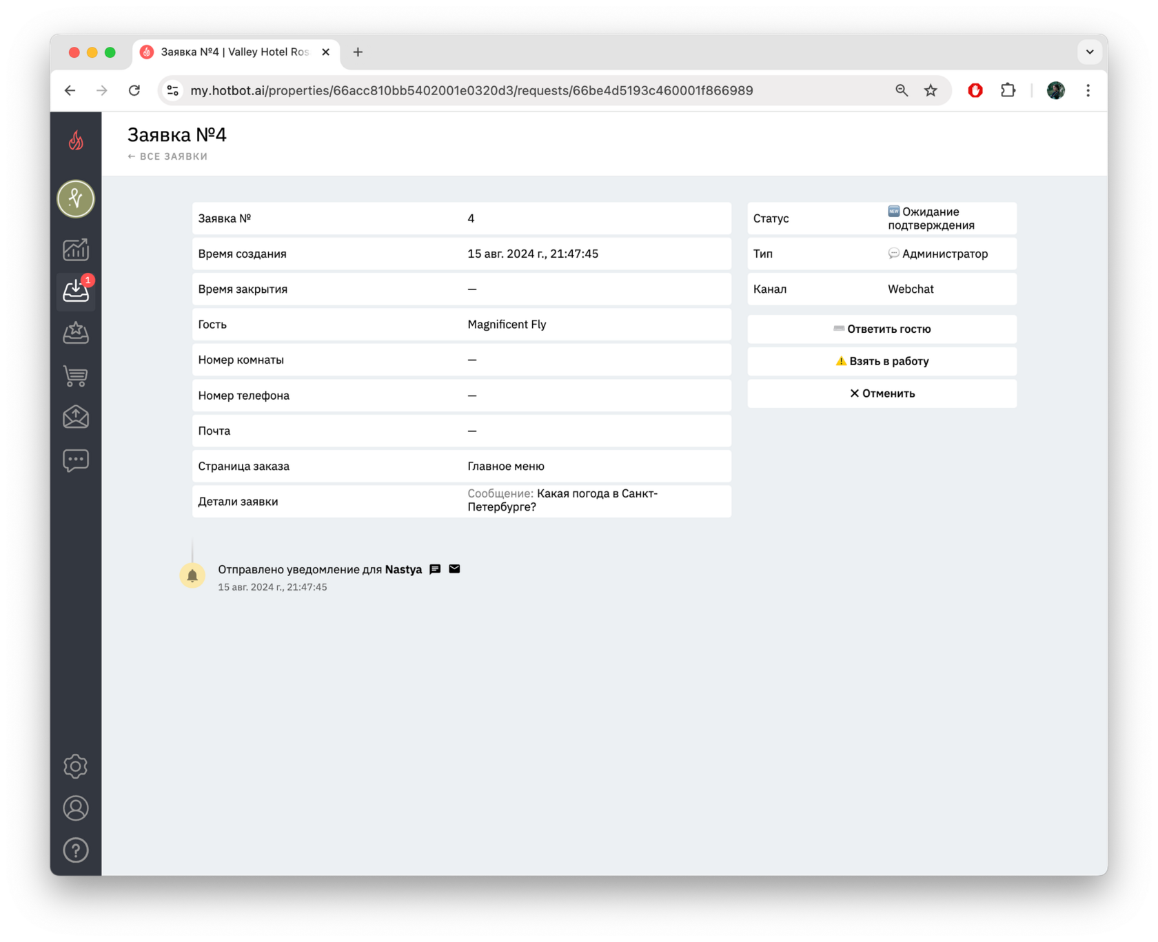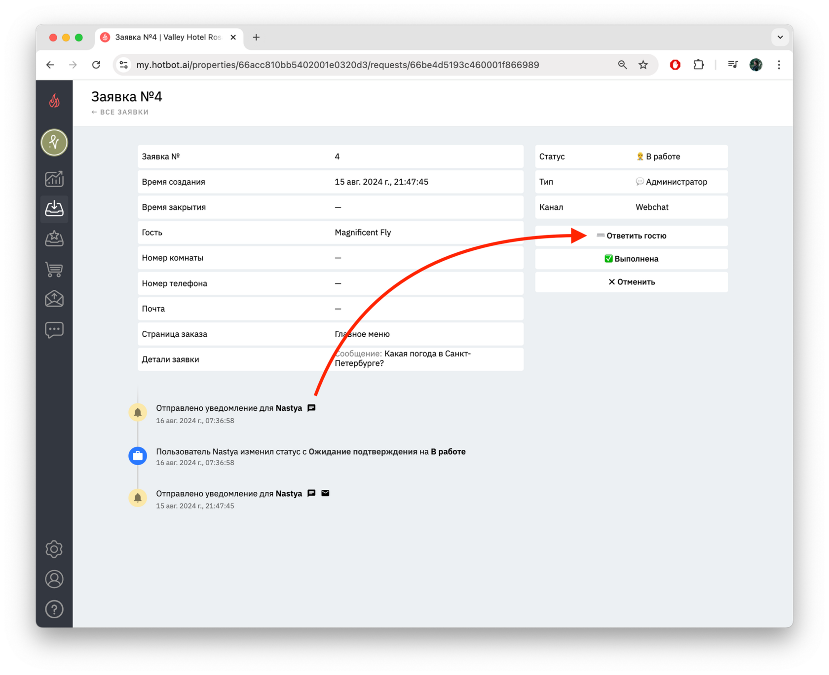 - Детали заявки — здесь отображается само обращение гостя.