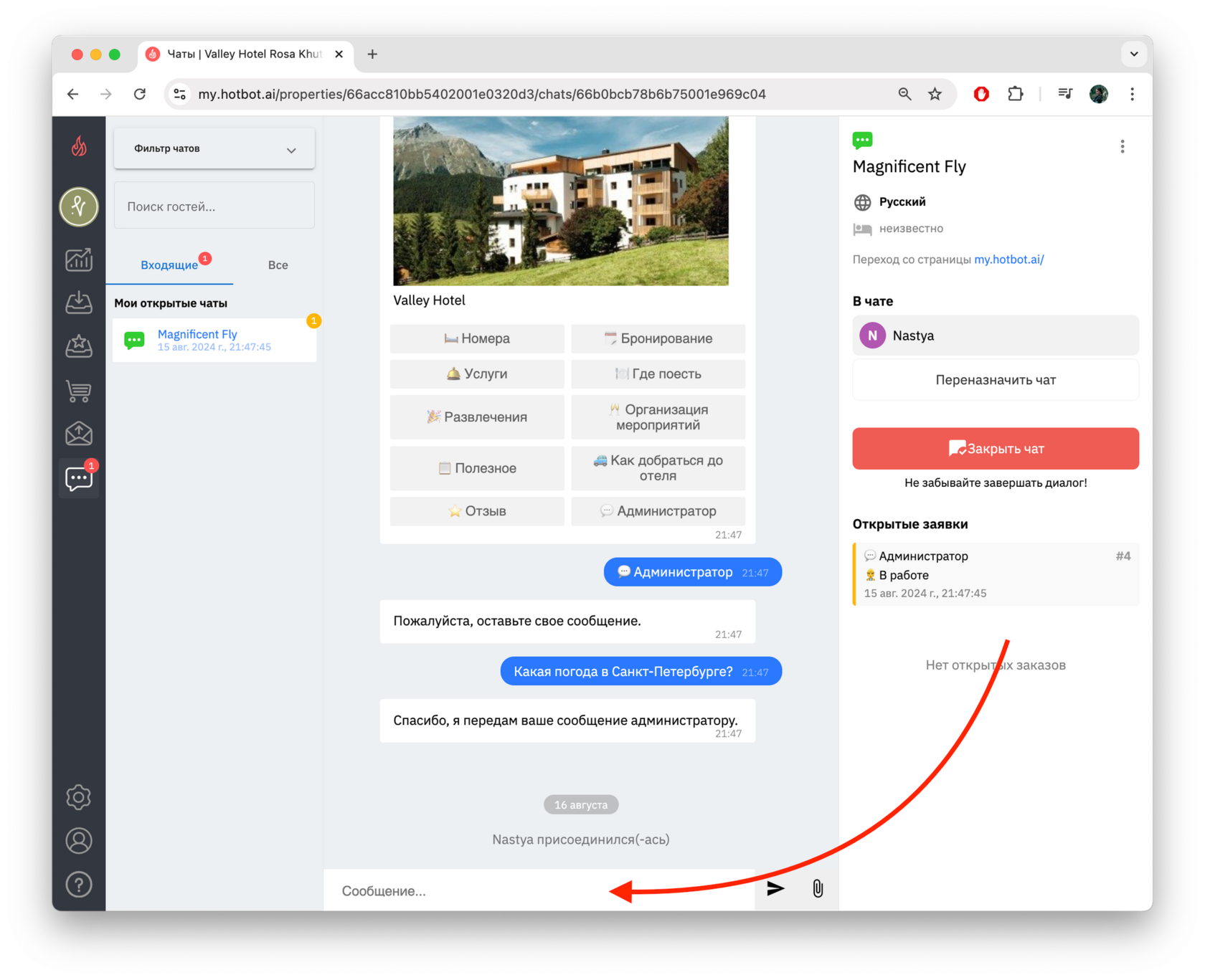 После этого вы сможете ответить гостю в чате.