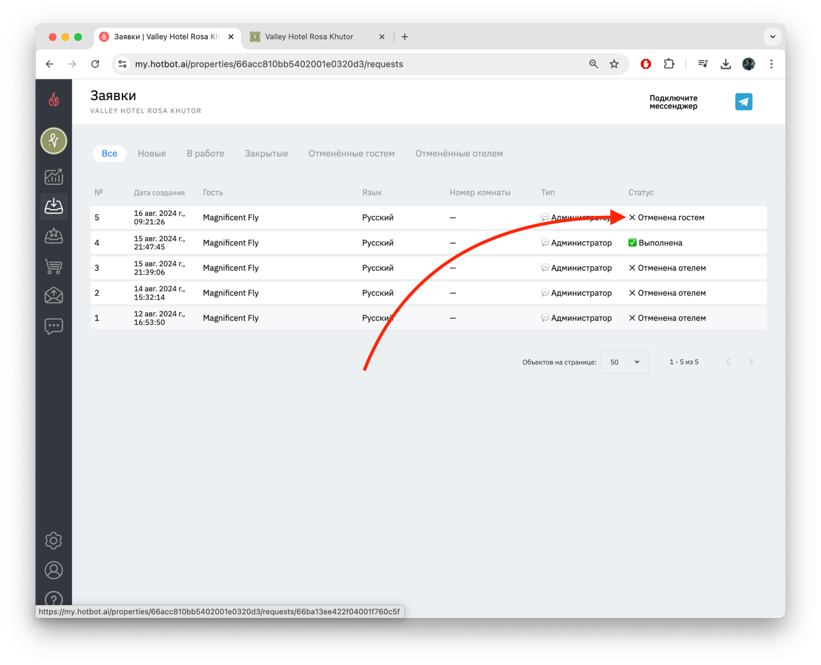 В разделе Заявки во вкладке Все вы увидите заявку со статусом Отменена гостем
