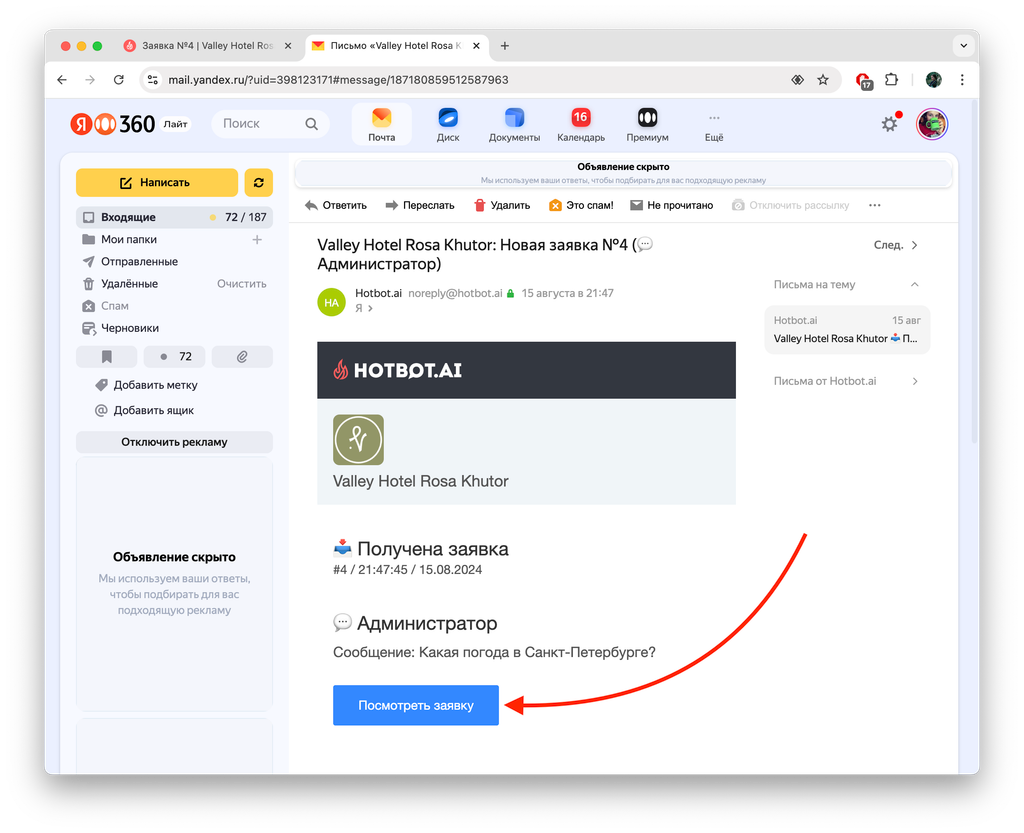 Нажмите Посмотреть заявку. В новом окне откроется страница заявки в личном кабинете Хотбот.