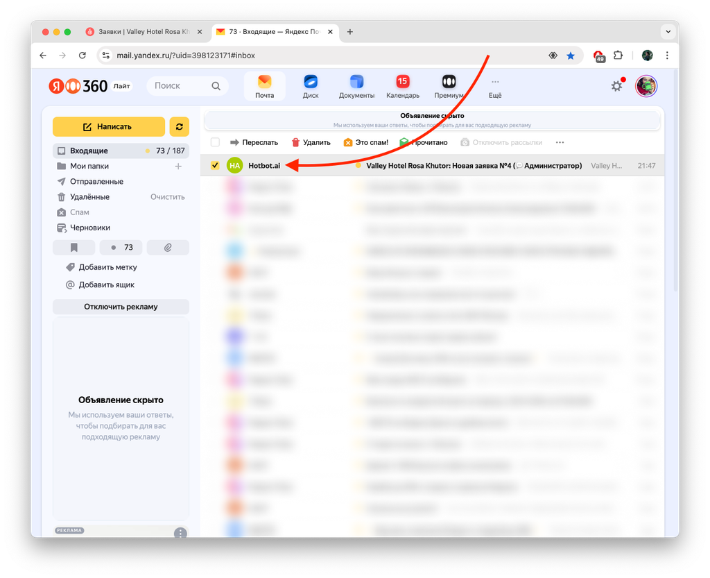 Откройте почту, к которой привязан личный кабинет сервиса. Чтобы обработать новую заявку, откройте письмо от Хотбот.
