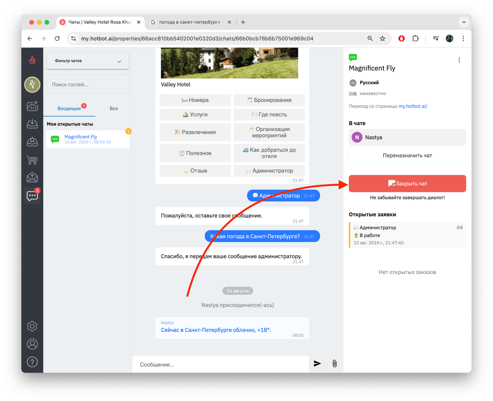 После того как вы ответили на вопрос гостя, нажмите Закрыть чат, чтобы бот снова заработал.