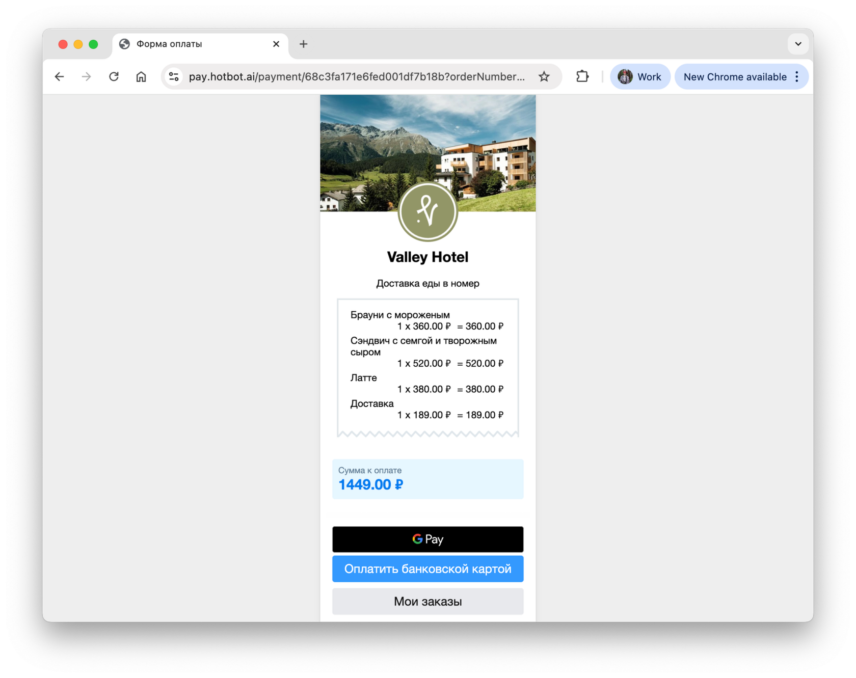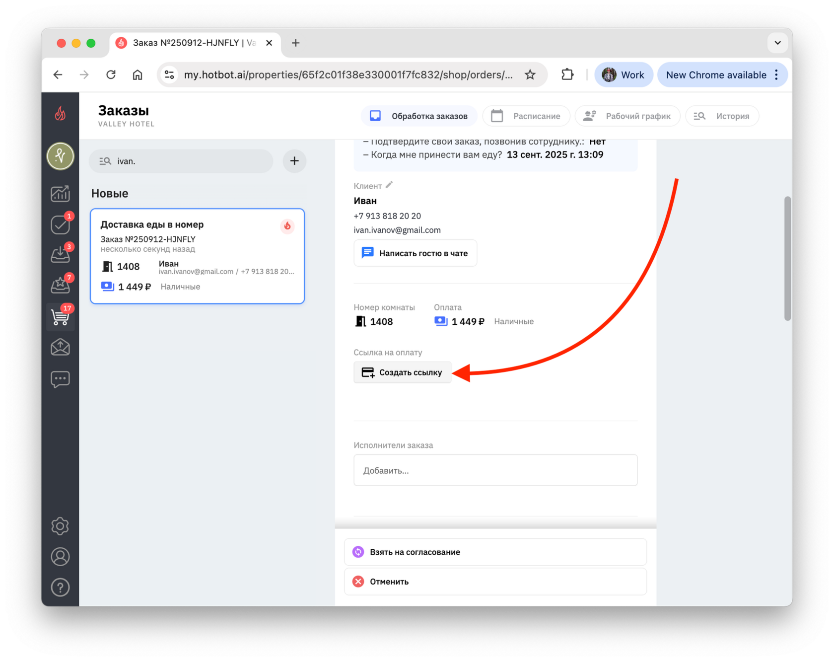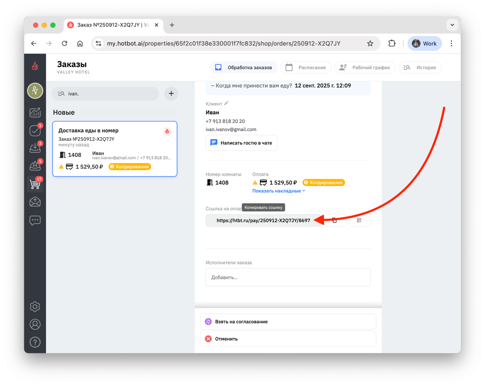 2. Создайте ссылку на оплату и отправьте ее гостю. Ссылка формируется на полную сумму заказа.