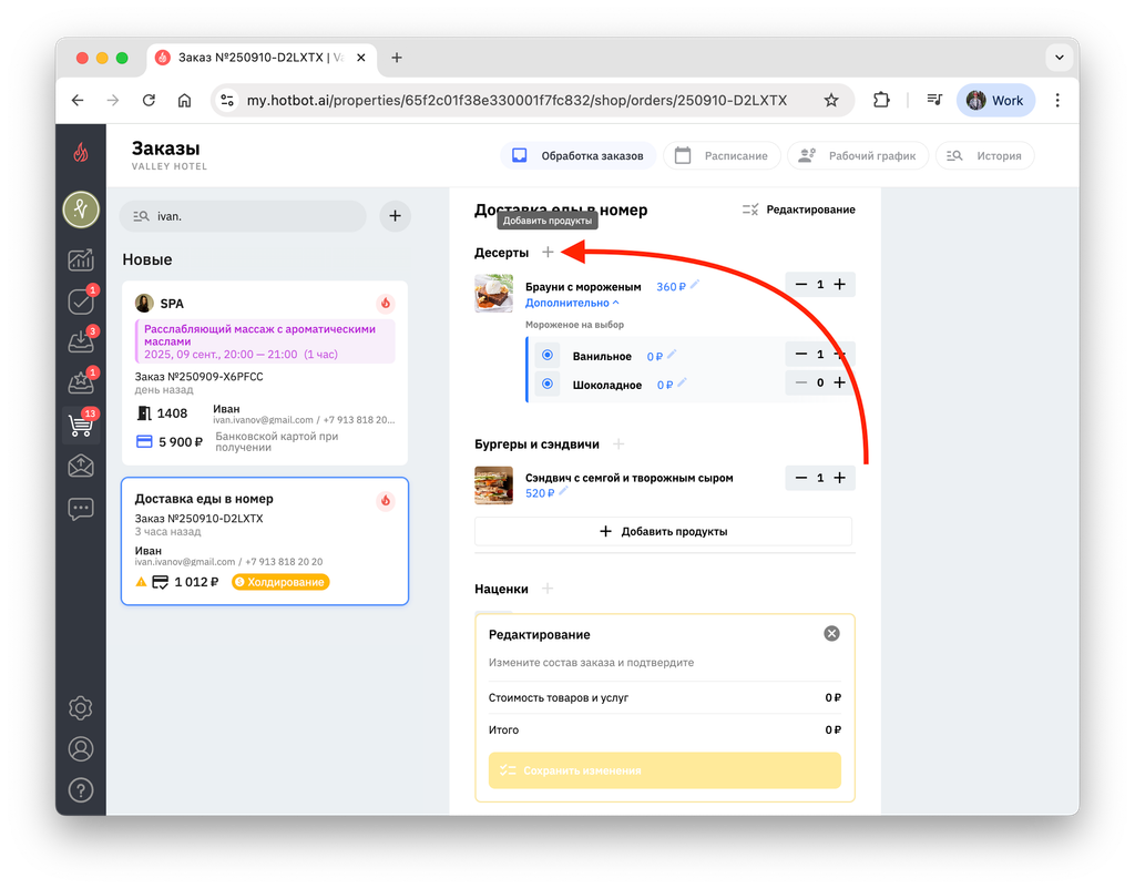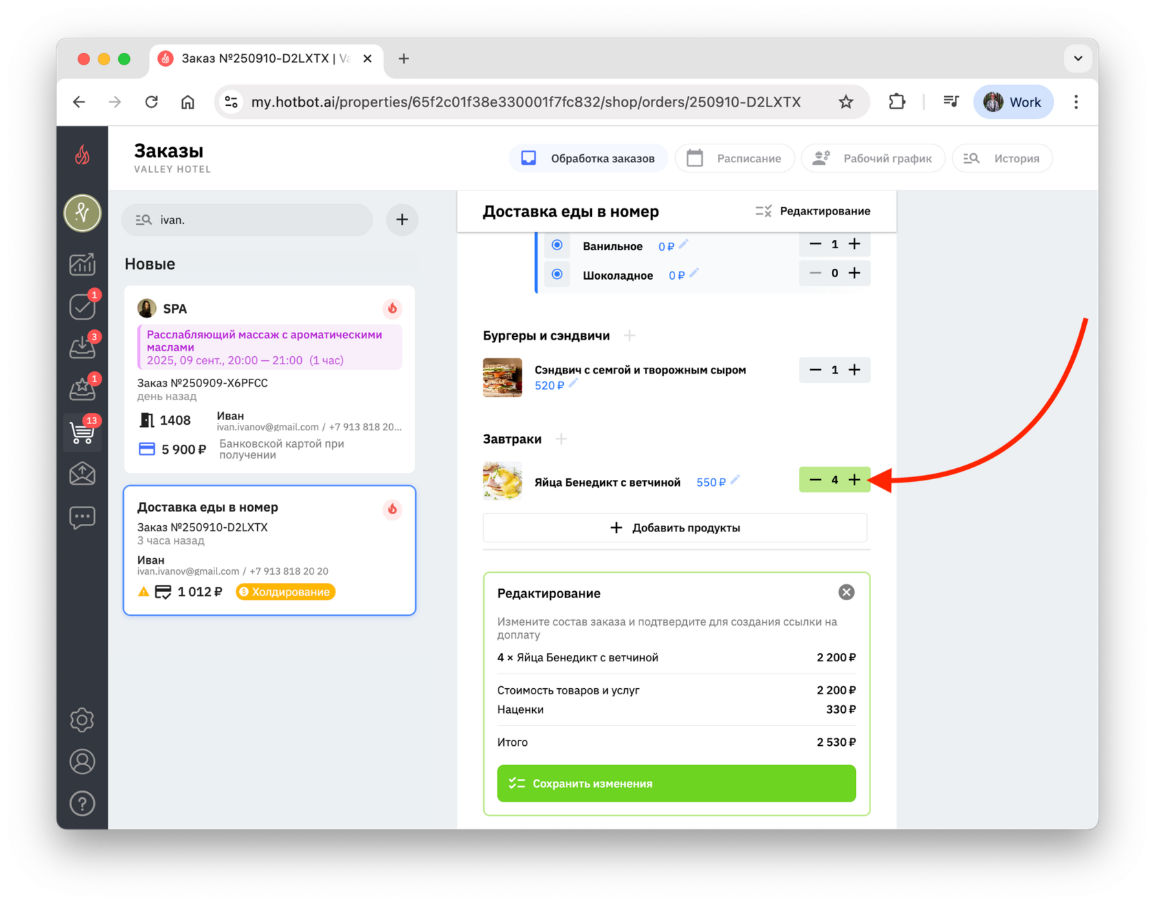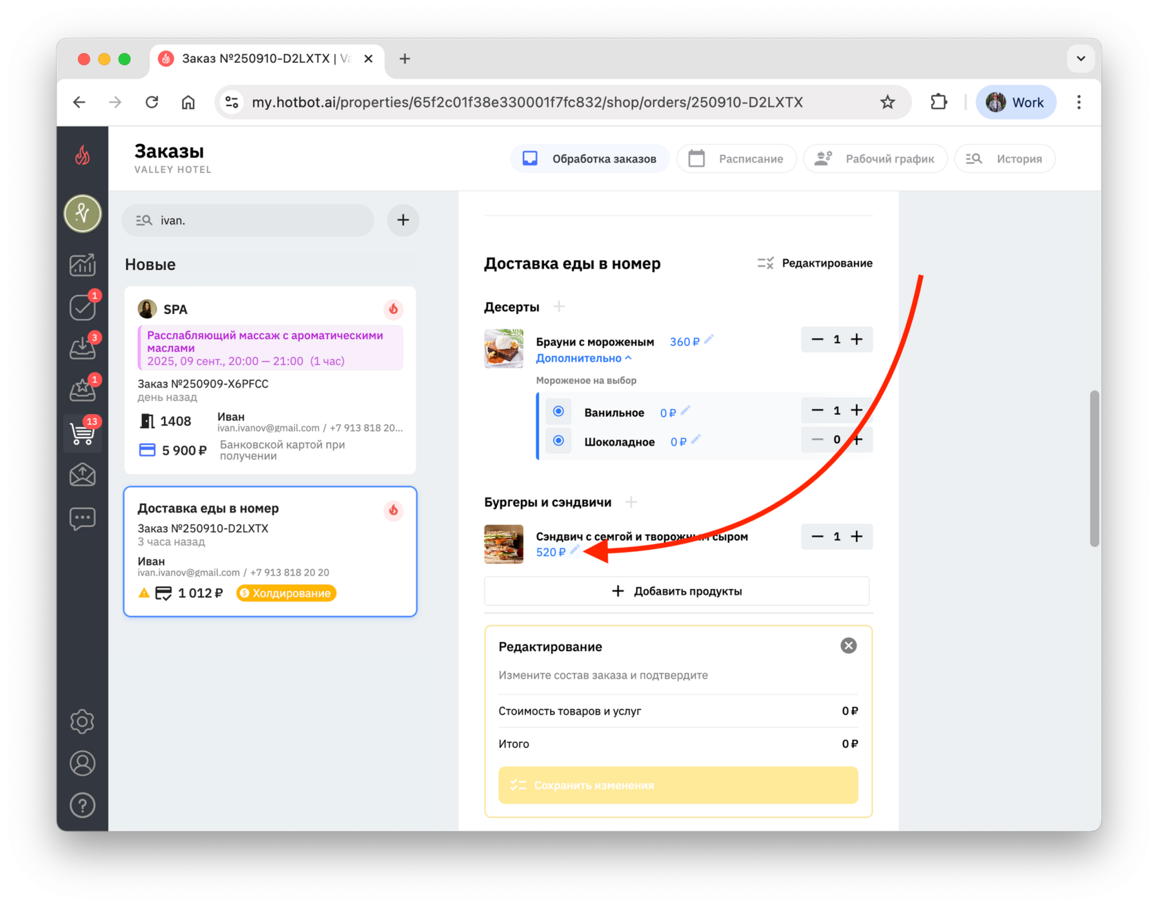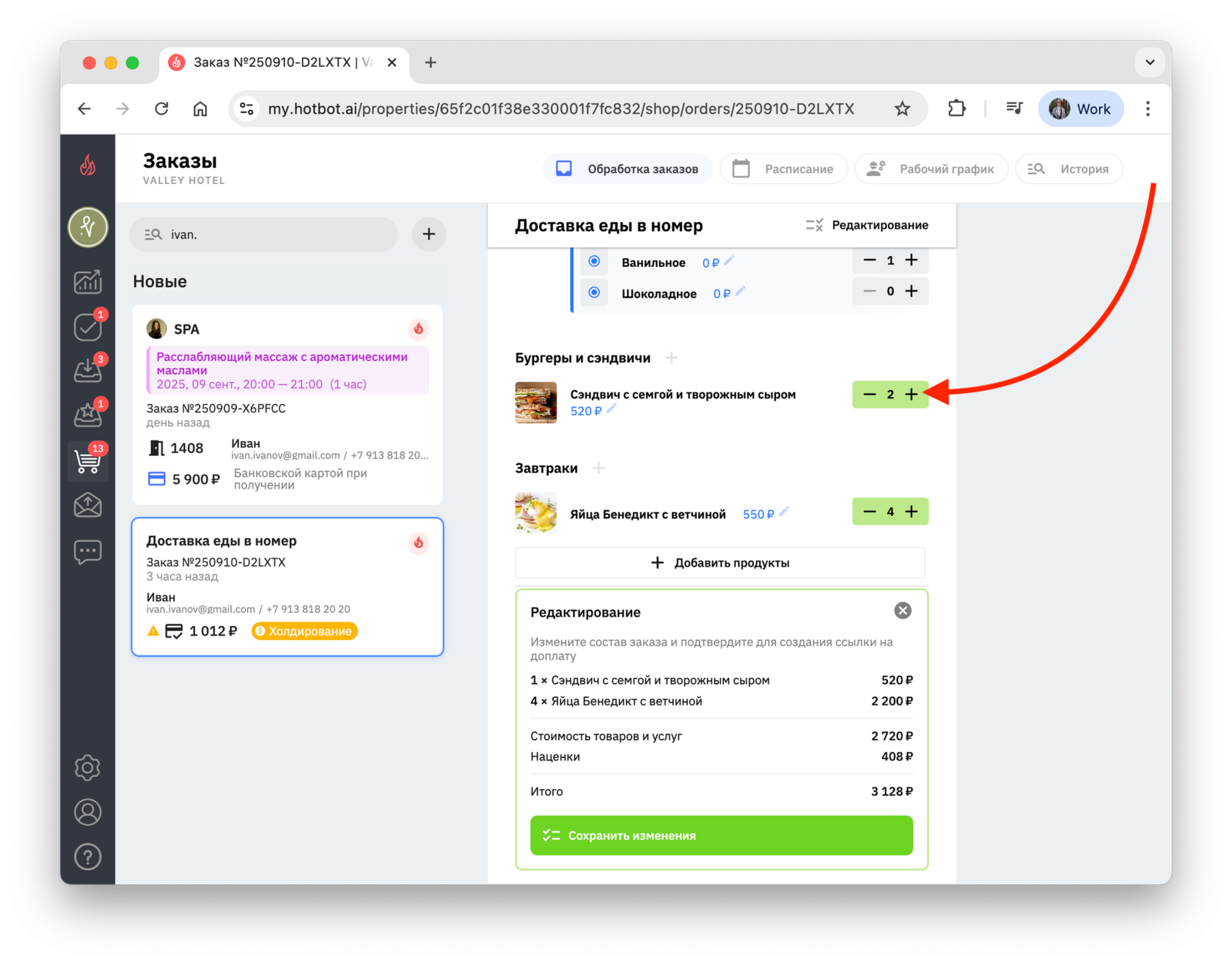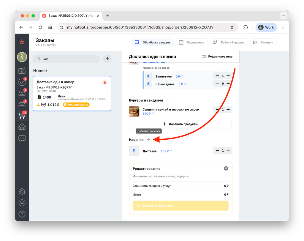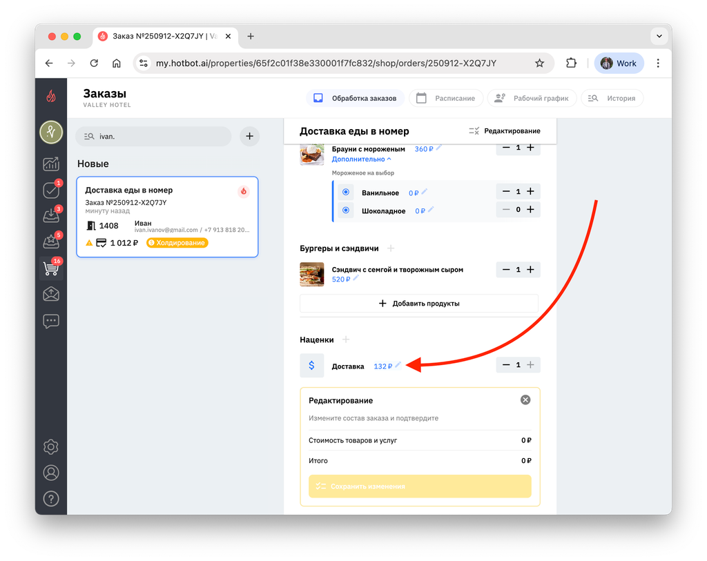 Функционал редактирования заказа доступен в тестовом режиме. Чтобы подключить его в своем отеле, обратитесь в службу поддержки по кнопке❓в нижнем левом углу личного кабинета или на support@hotbot.ai.