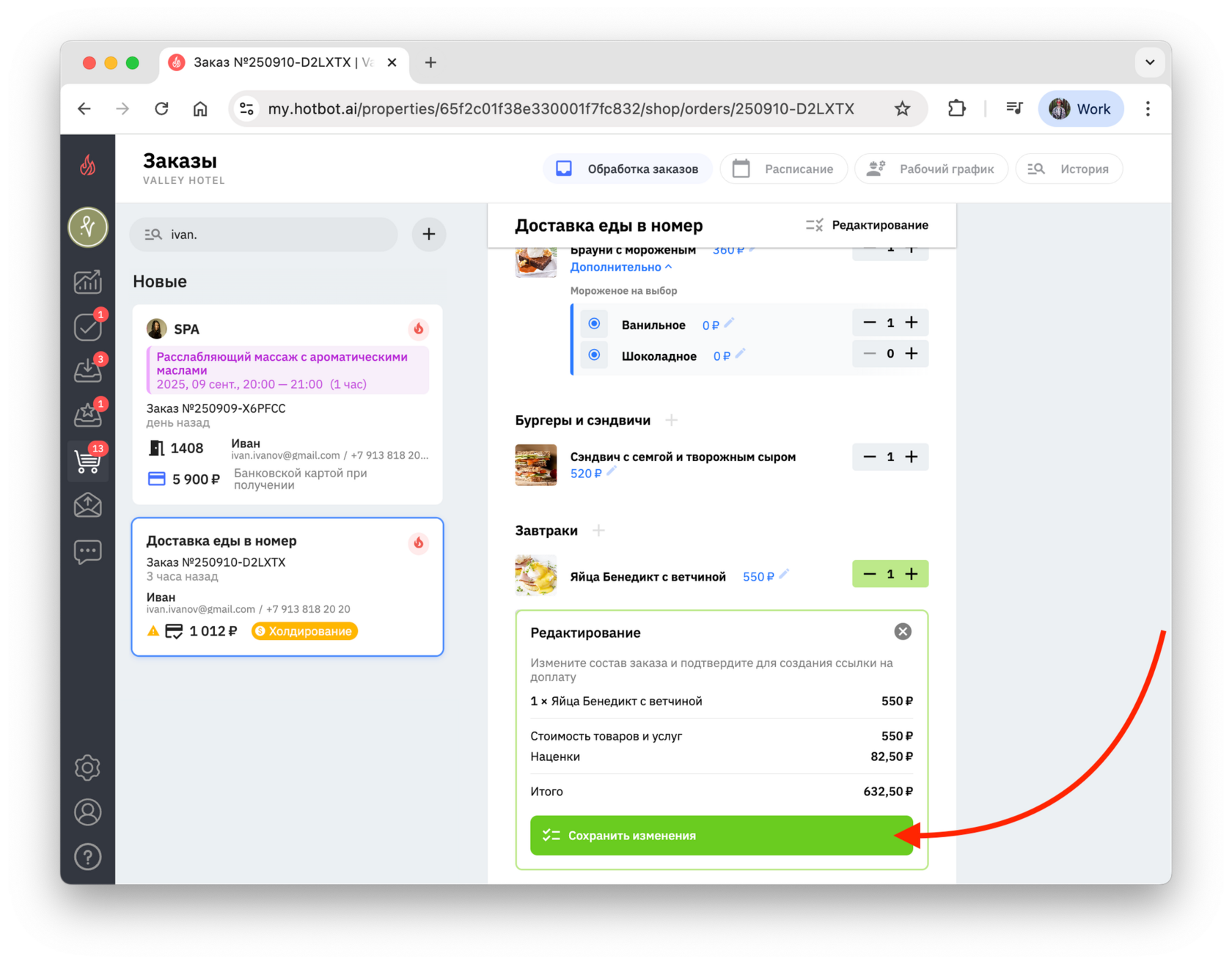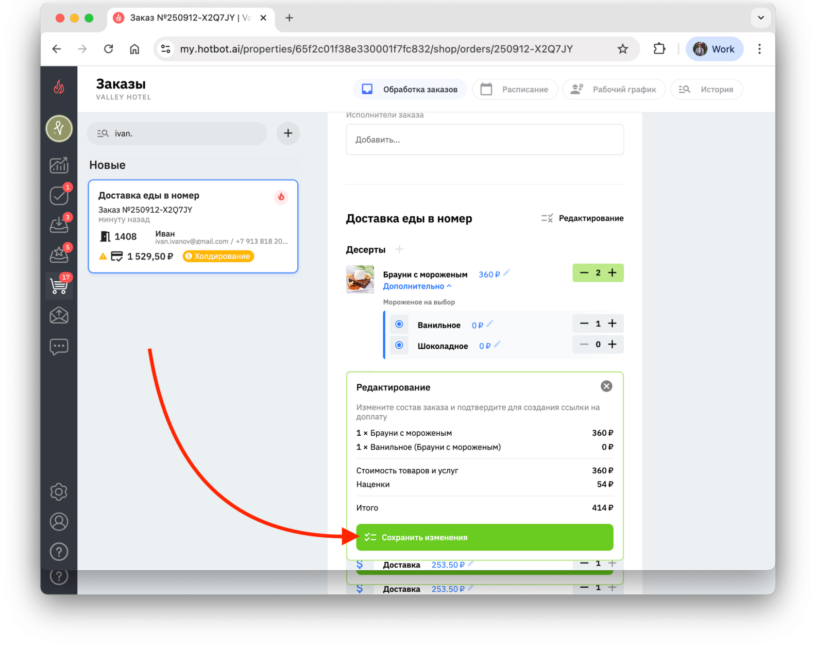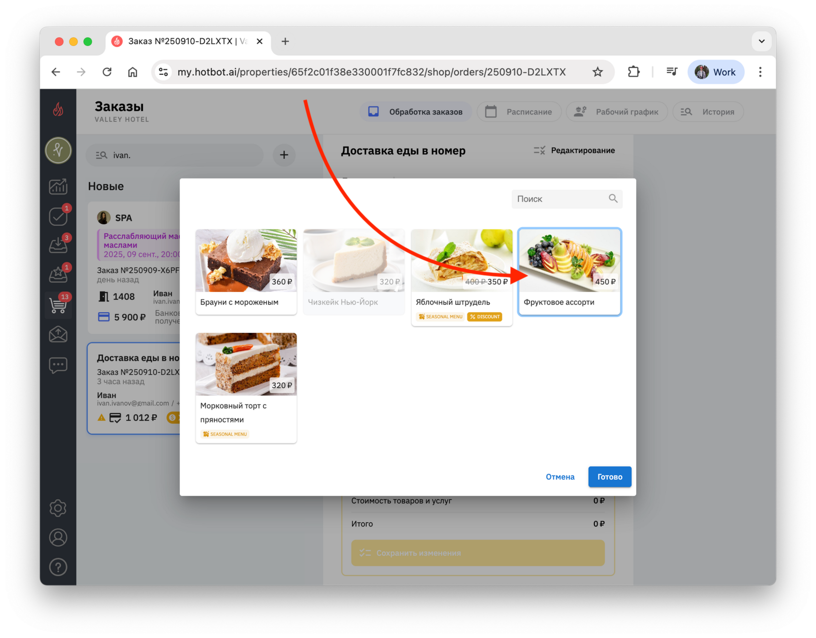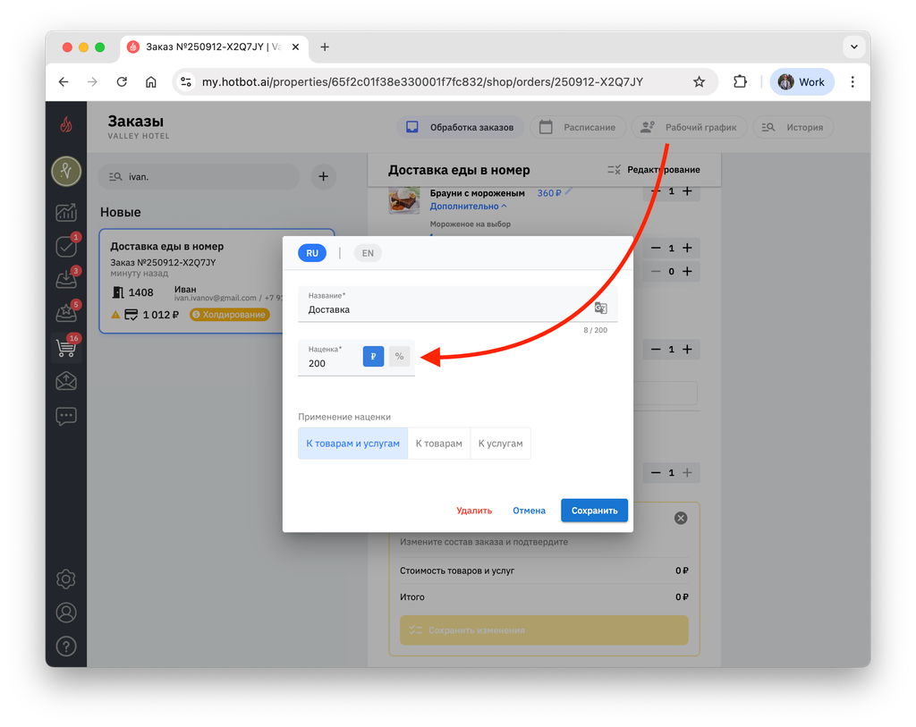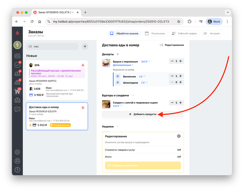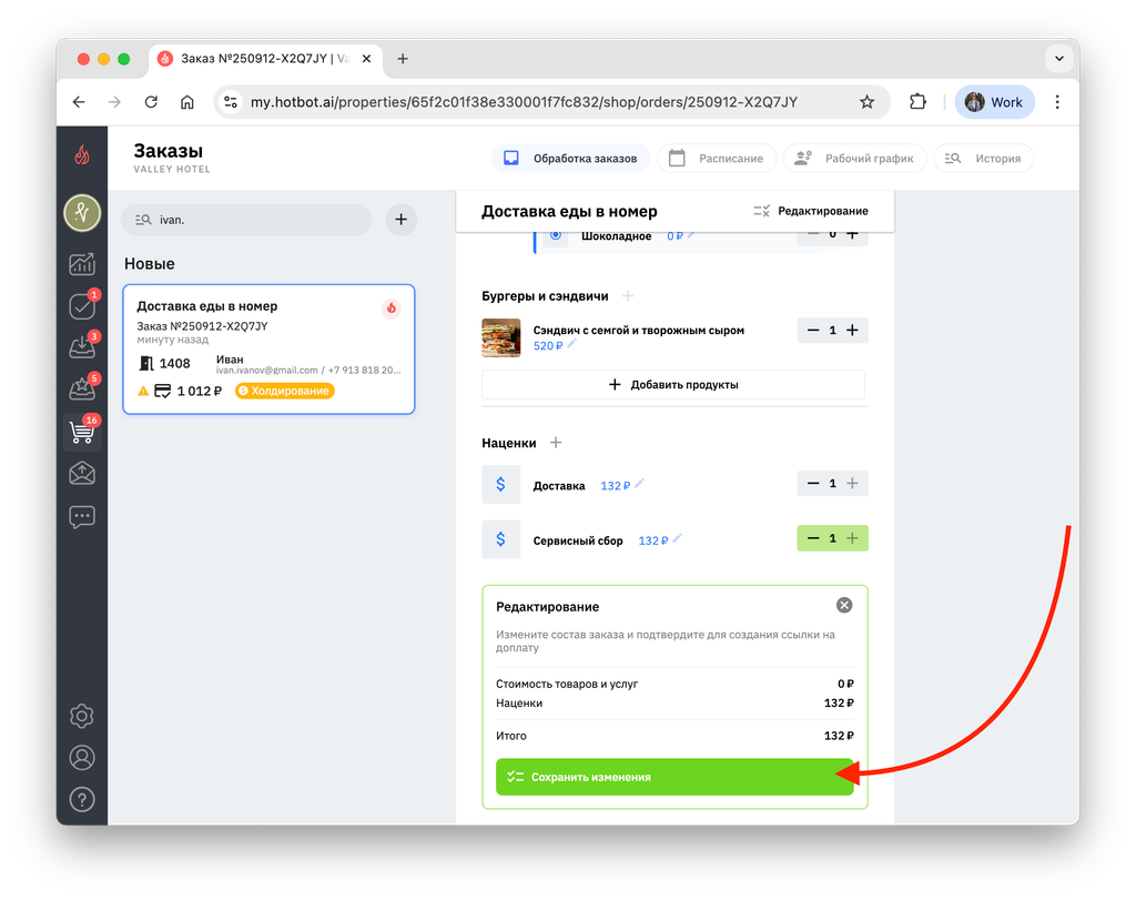 Функционал редактирования заказа доступен в тестовом режиме. Чтобы подключить его в своем отеле, обратитесь в службу поддержки по кнопке❓в нижнем левом углу личного кабинета или на support@hotbot.ai.