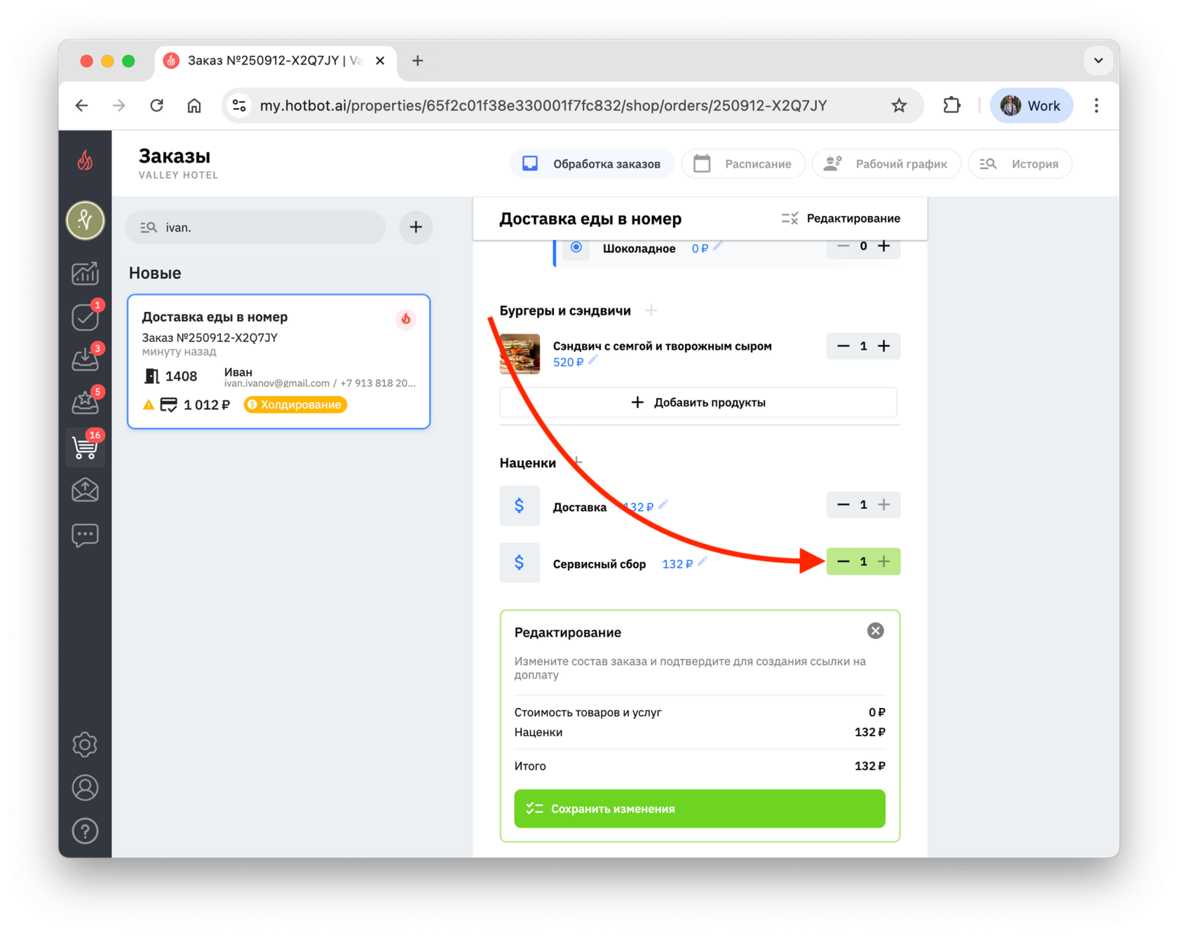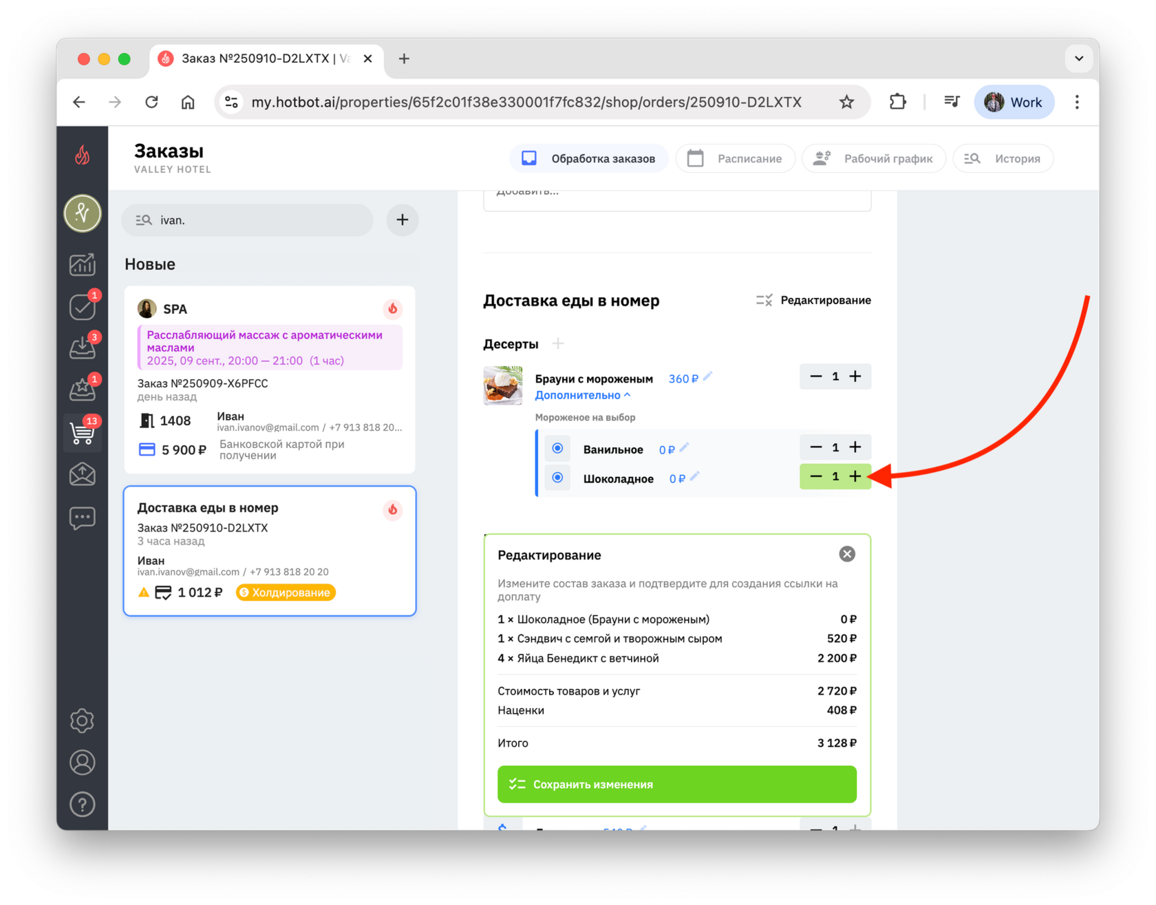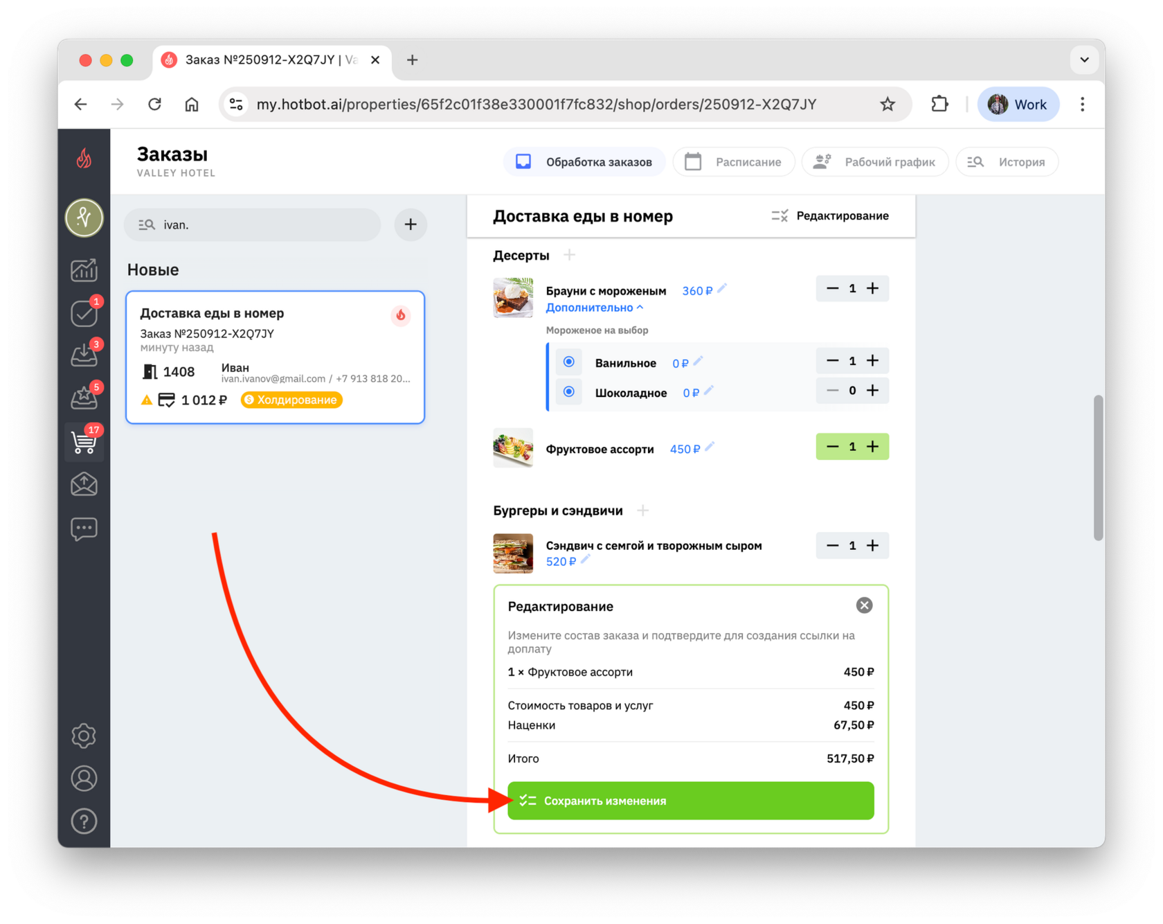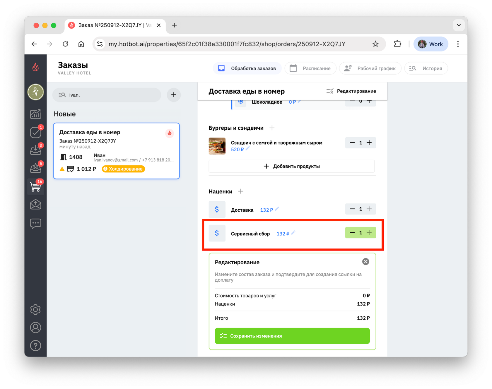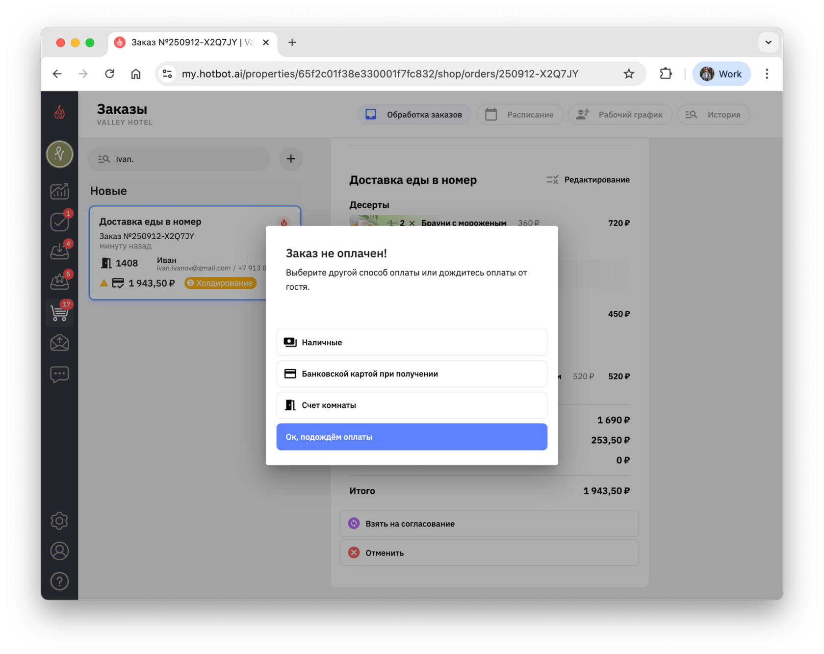 Функционал редактирования заказа доступен в тестовом режиме. Чтобы подключить его в своем отеле, обратитесь в службу поддержки по кнопке❓в нижнем левом углу личного кабинета или на support@hotbot.ai.