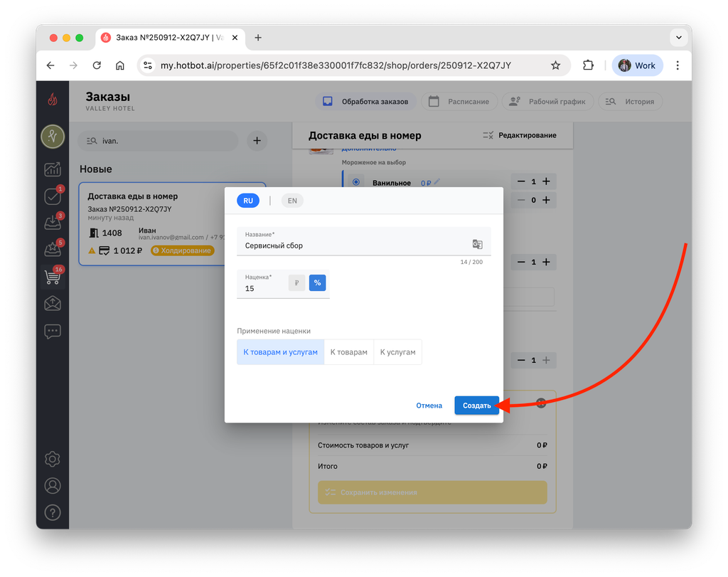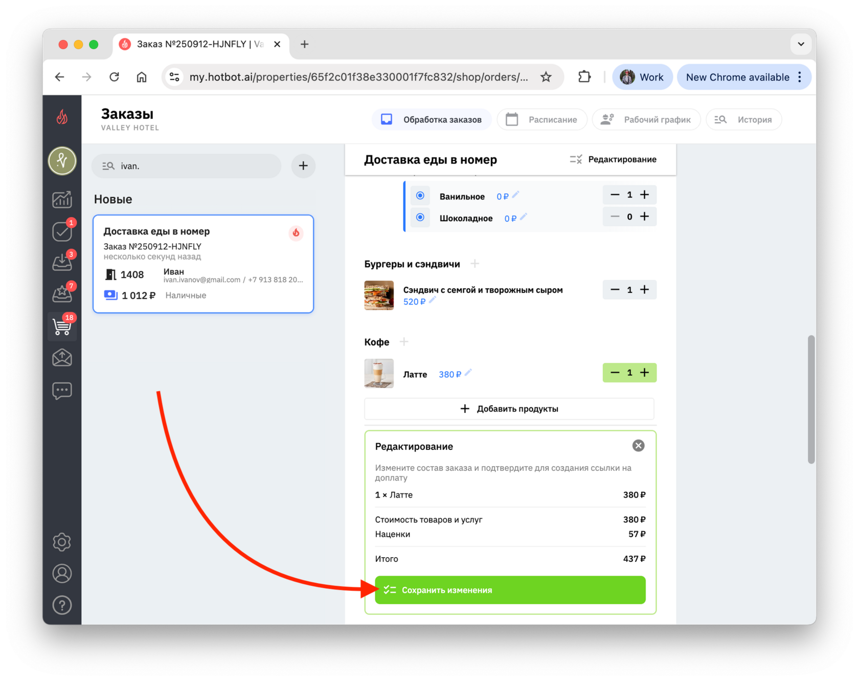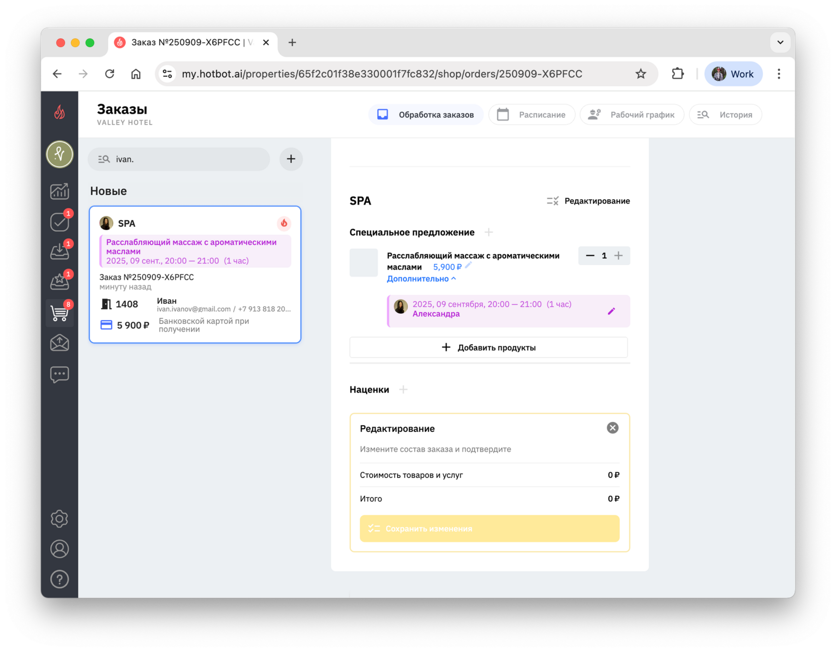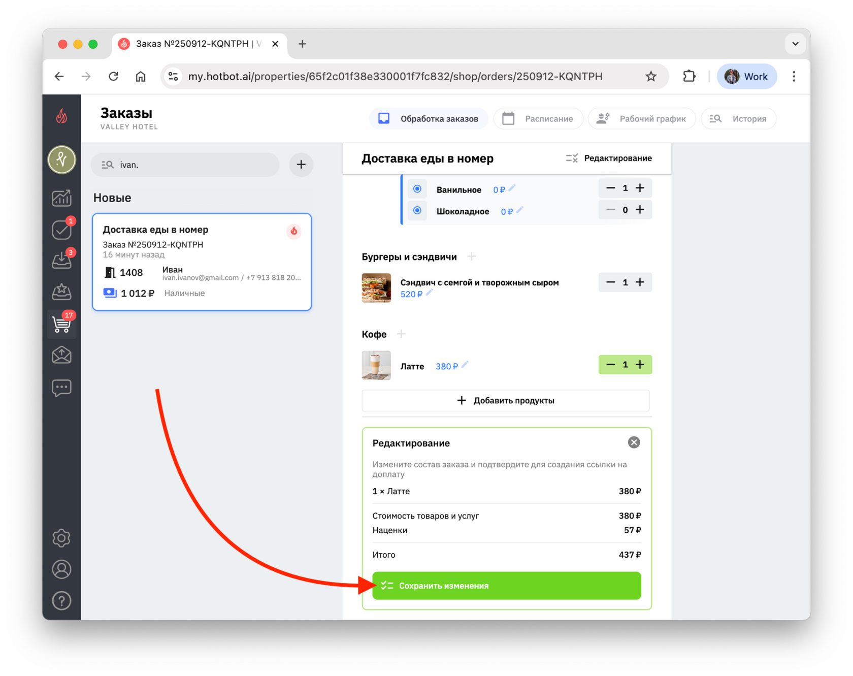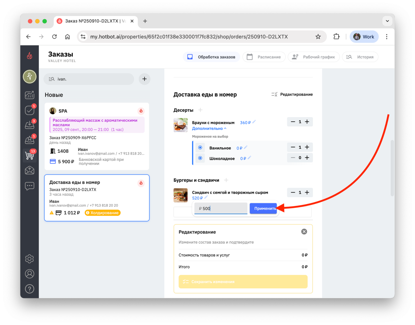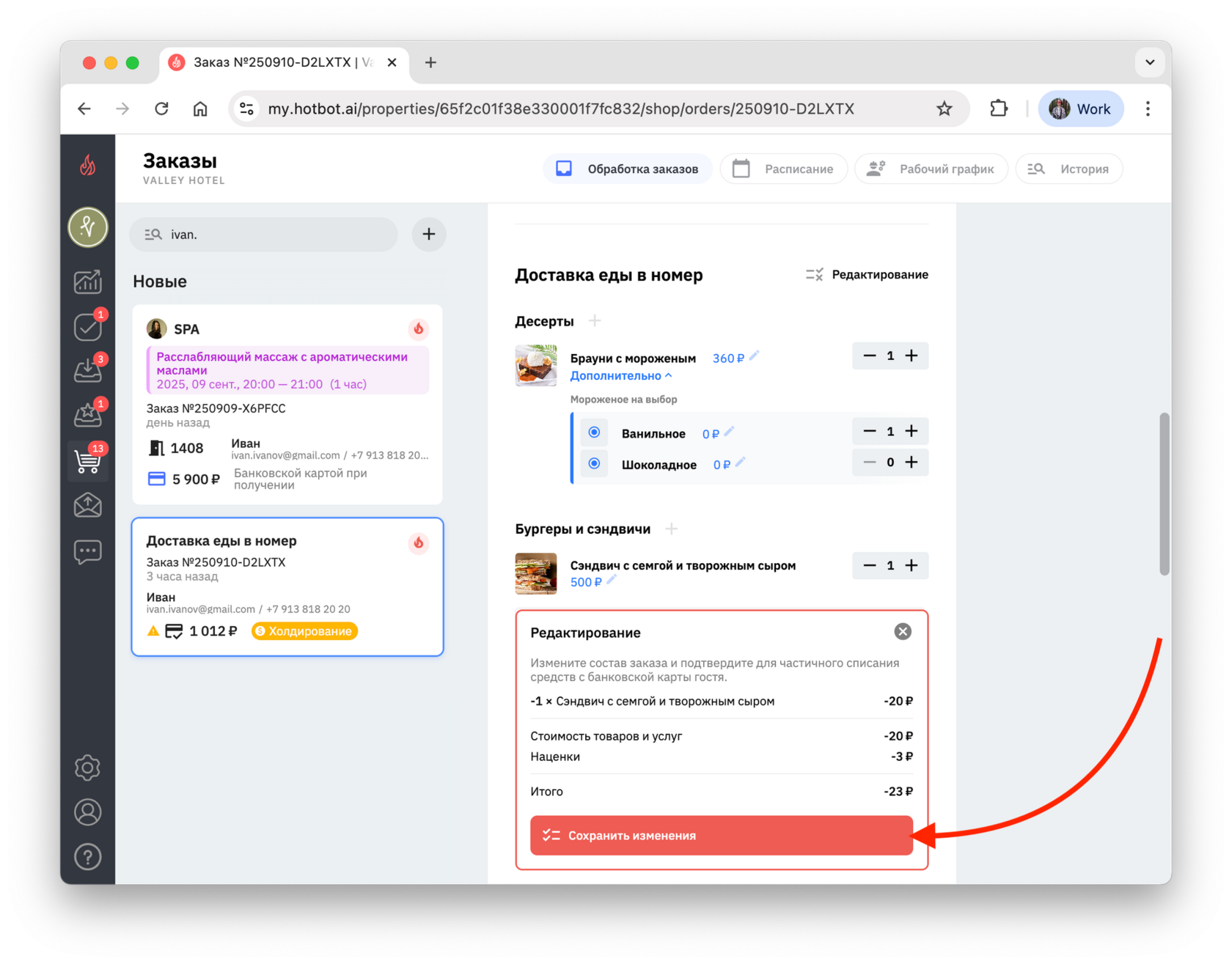 Функционал редактирования заказа доступен в тестовом режиме. Чтобы подключить его в своем отеле, обратитесь в службу поддержки по кнопке❓в нижнем левом углу личного кабинета или на support@hotbot.ai.