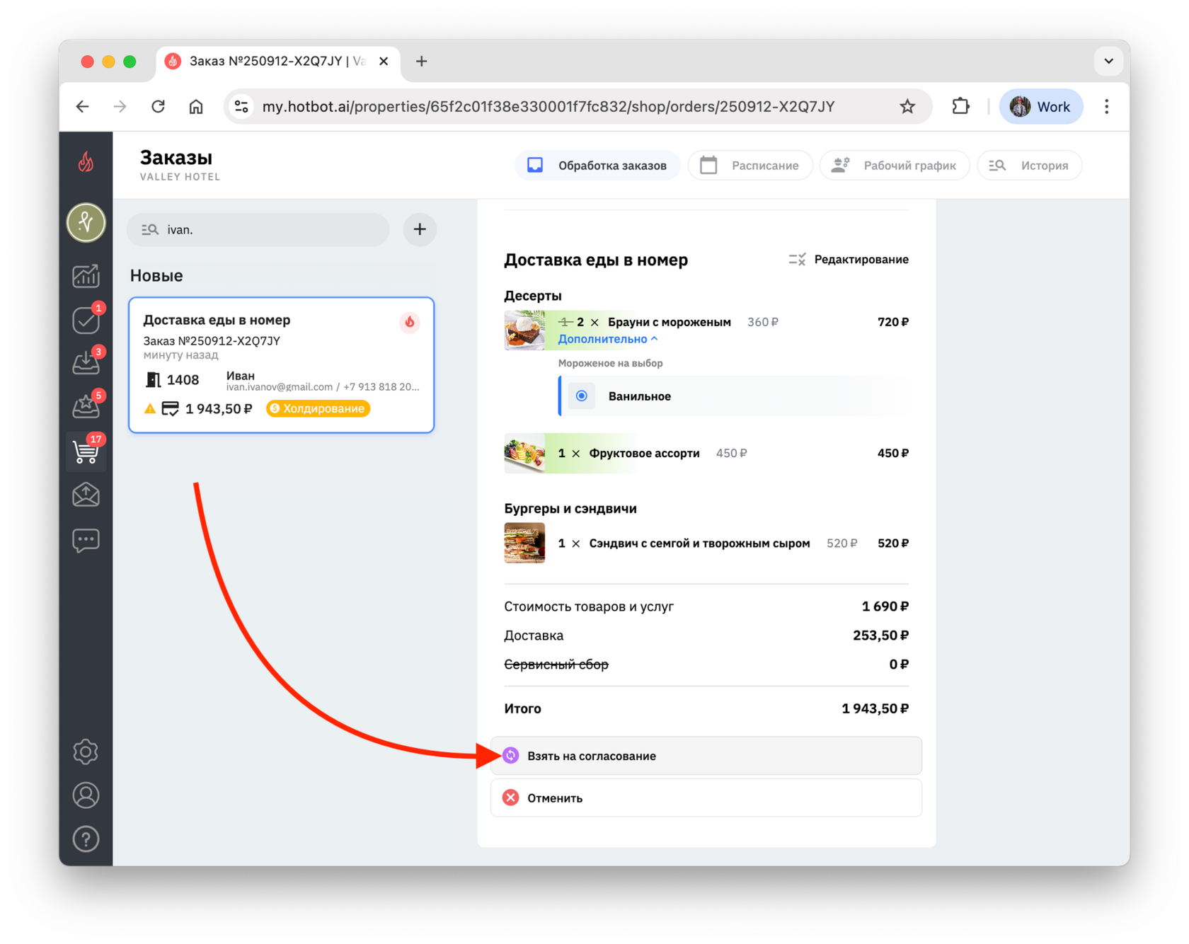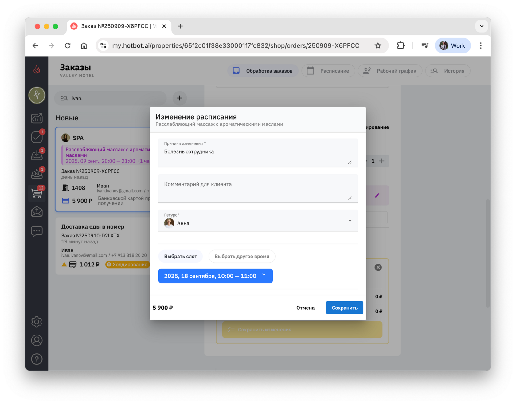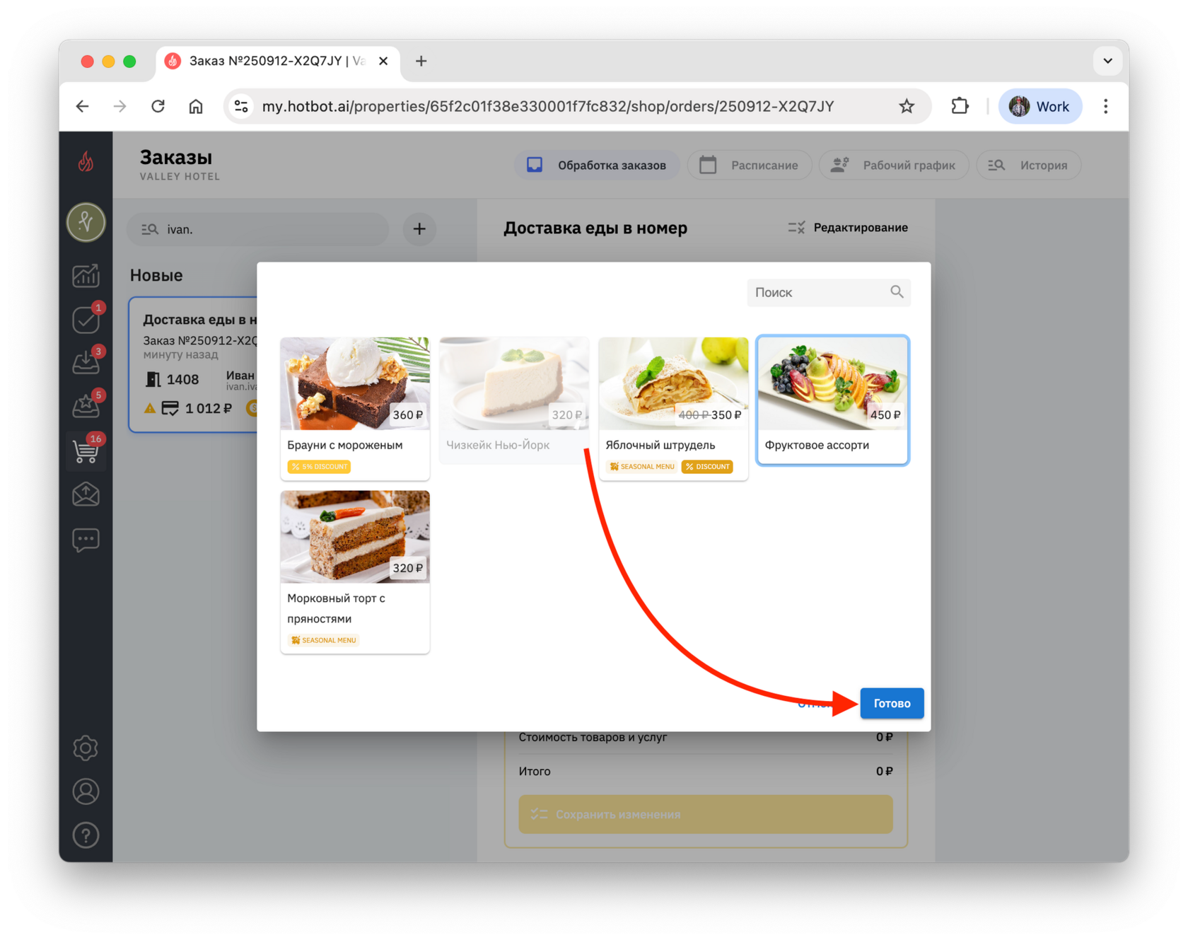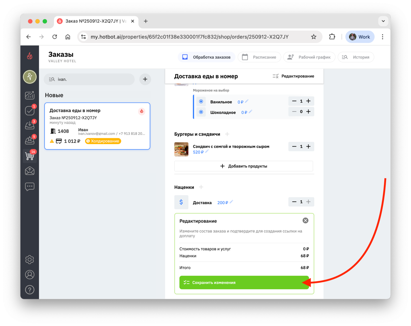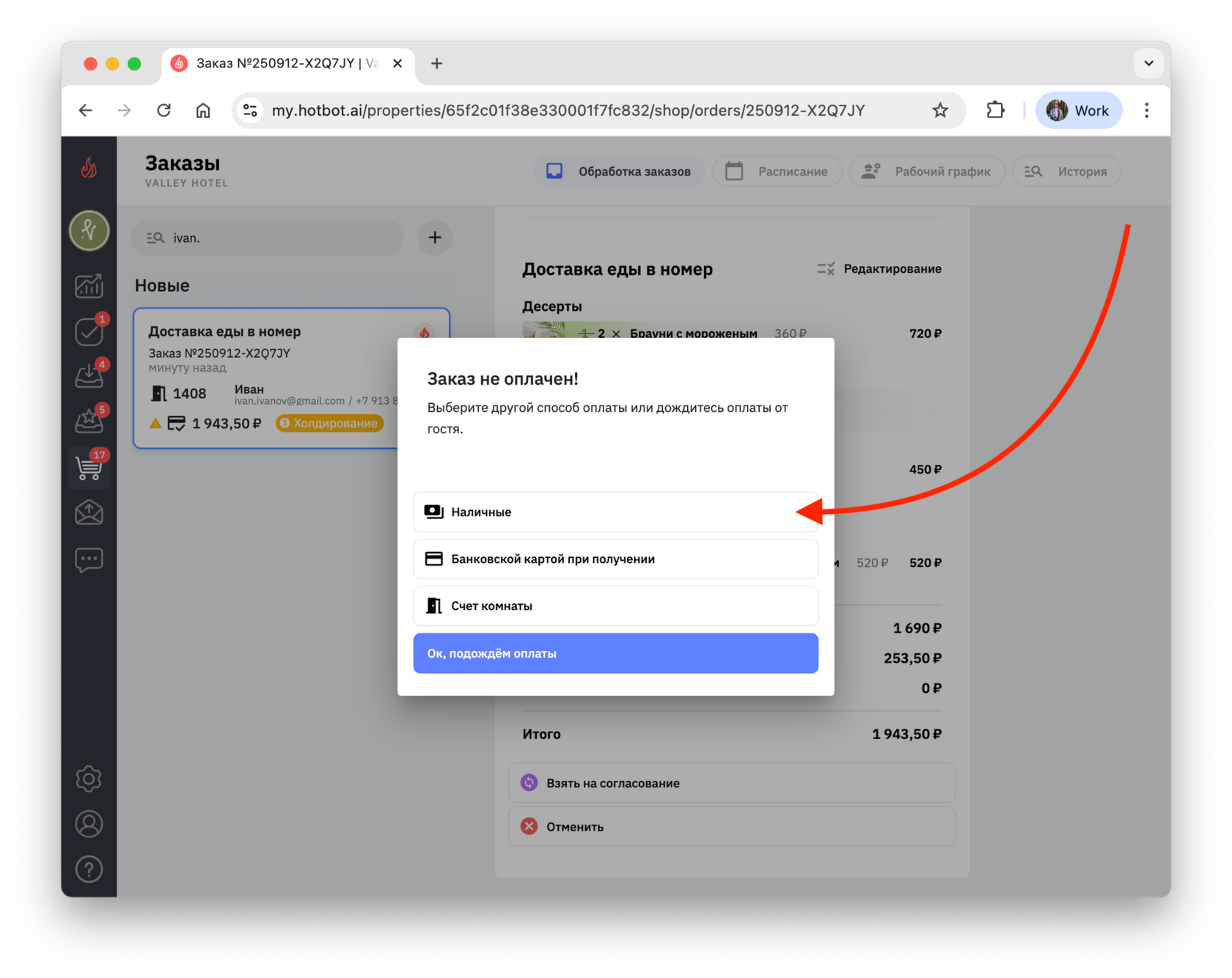 Функционал редактирования заказа доступен в тестовом режиме. Чтобы подключить его в своем отеле, обратитесь в службу поддержки по кнопке❓в нижнем левом углу личного кабинета или на support@hotbot.ai.