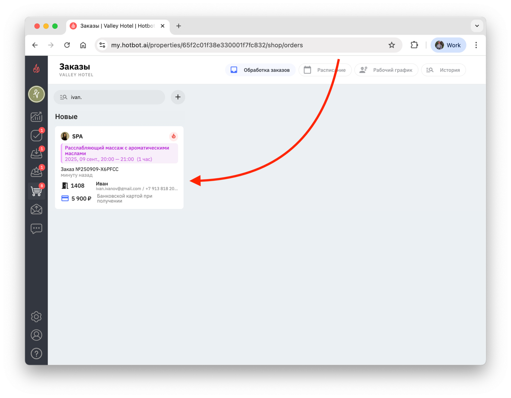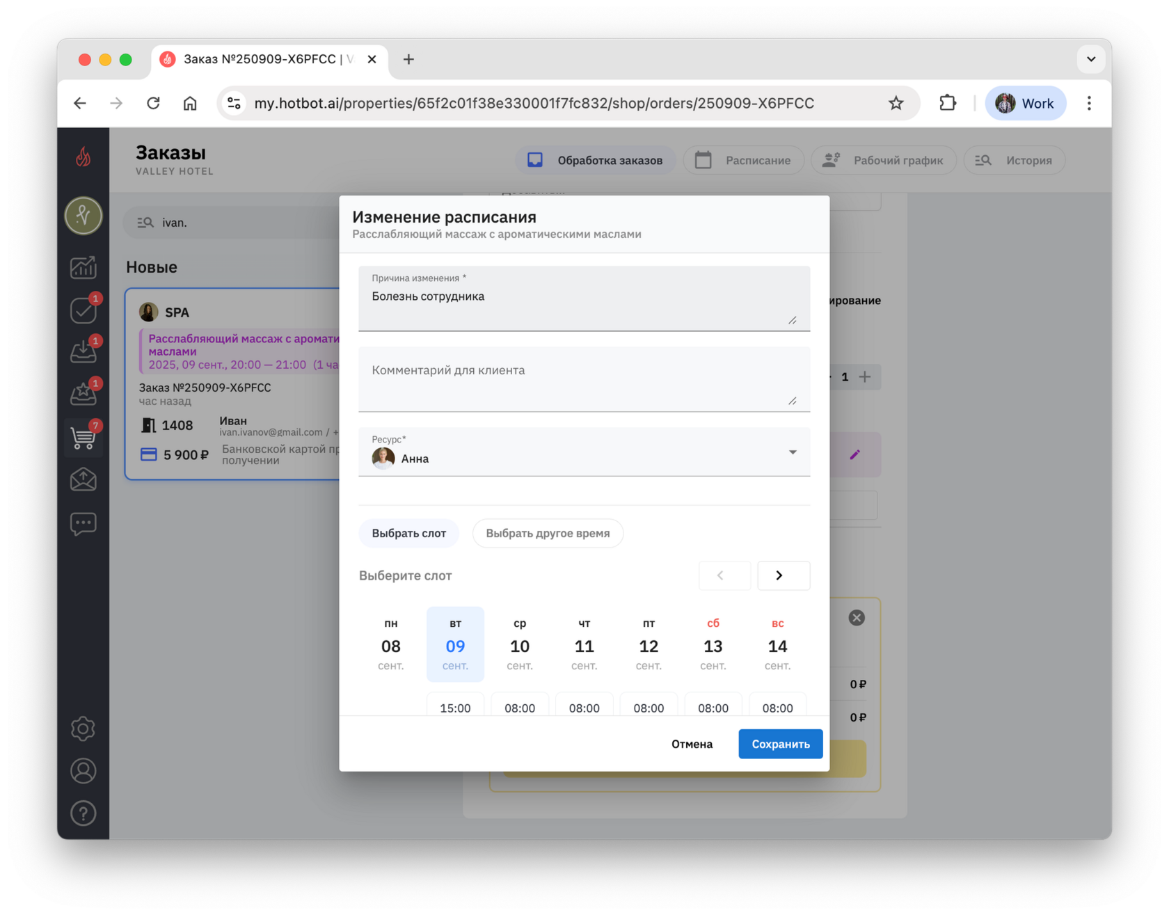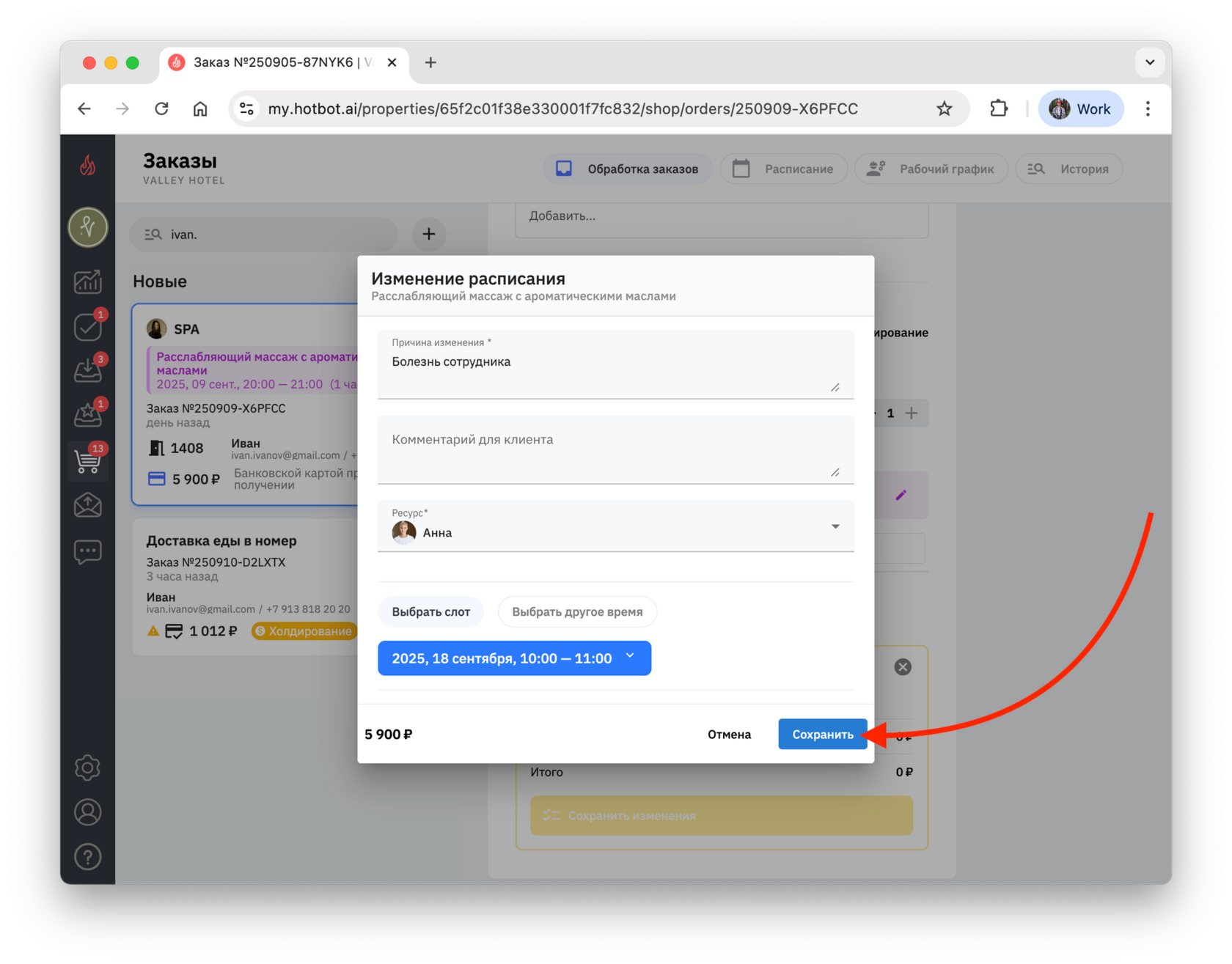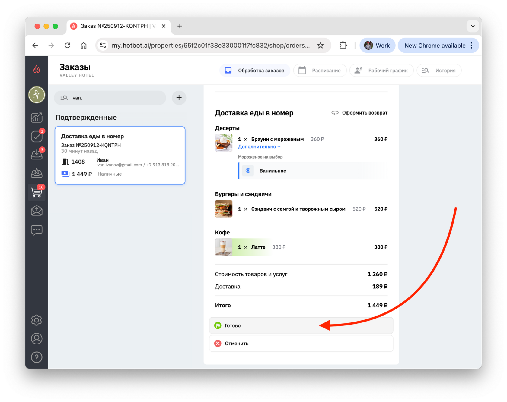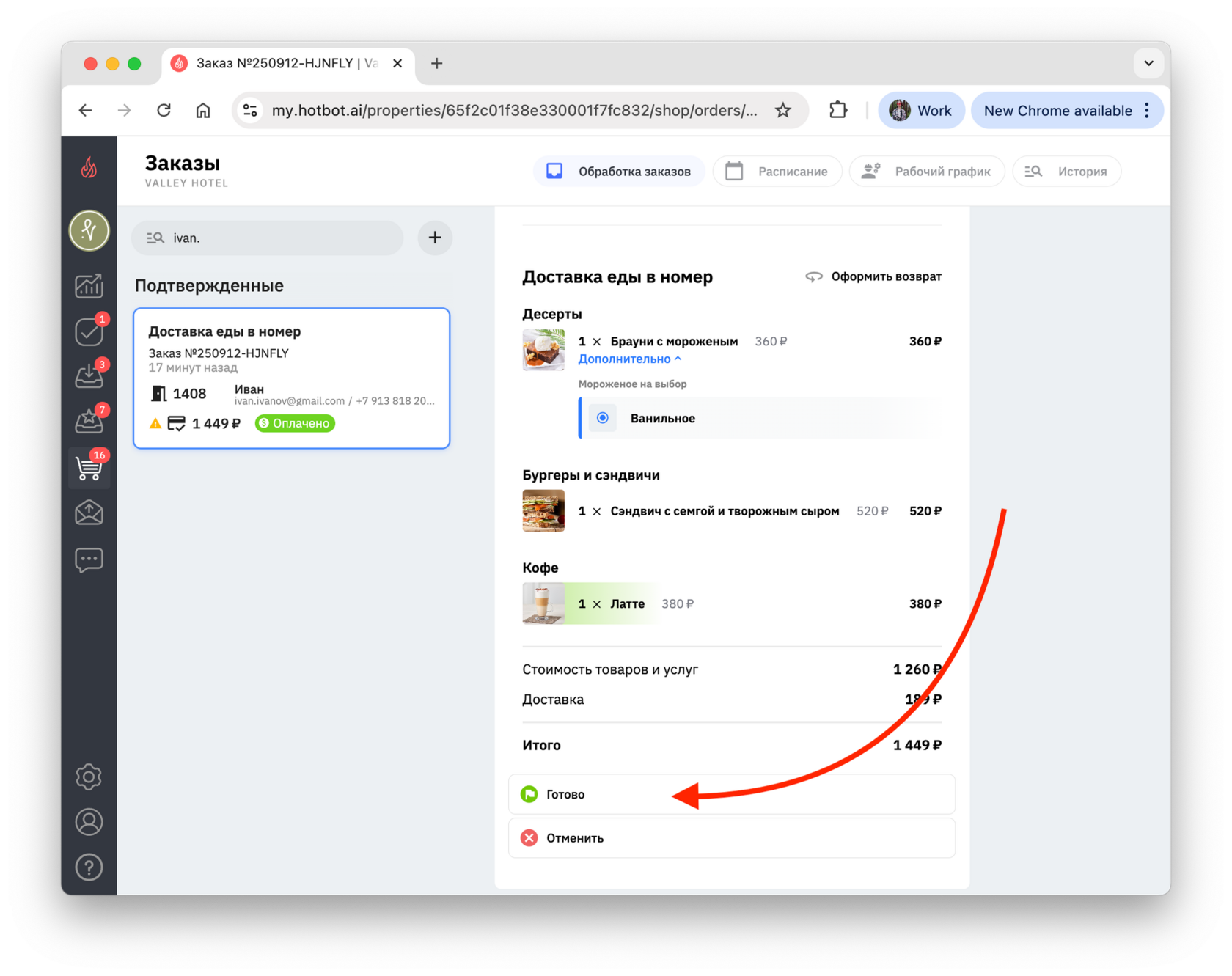 Функционал редактирования заказа доступен в тестовом режиме. Чтобы подключить его в своем отеле, обратитесь в службу поддержки по кнопке❓в нижнем левом углу личного кабинета или на support@hotbot.ai.