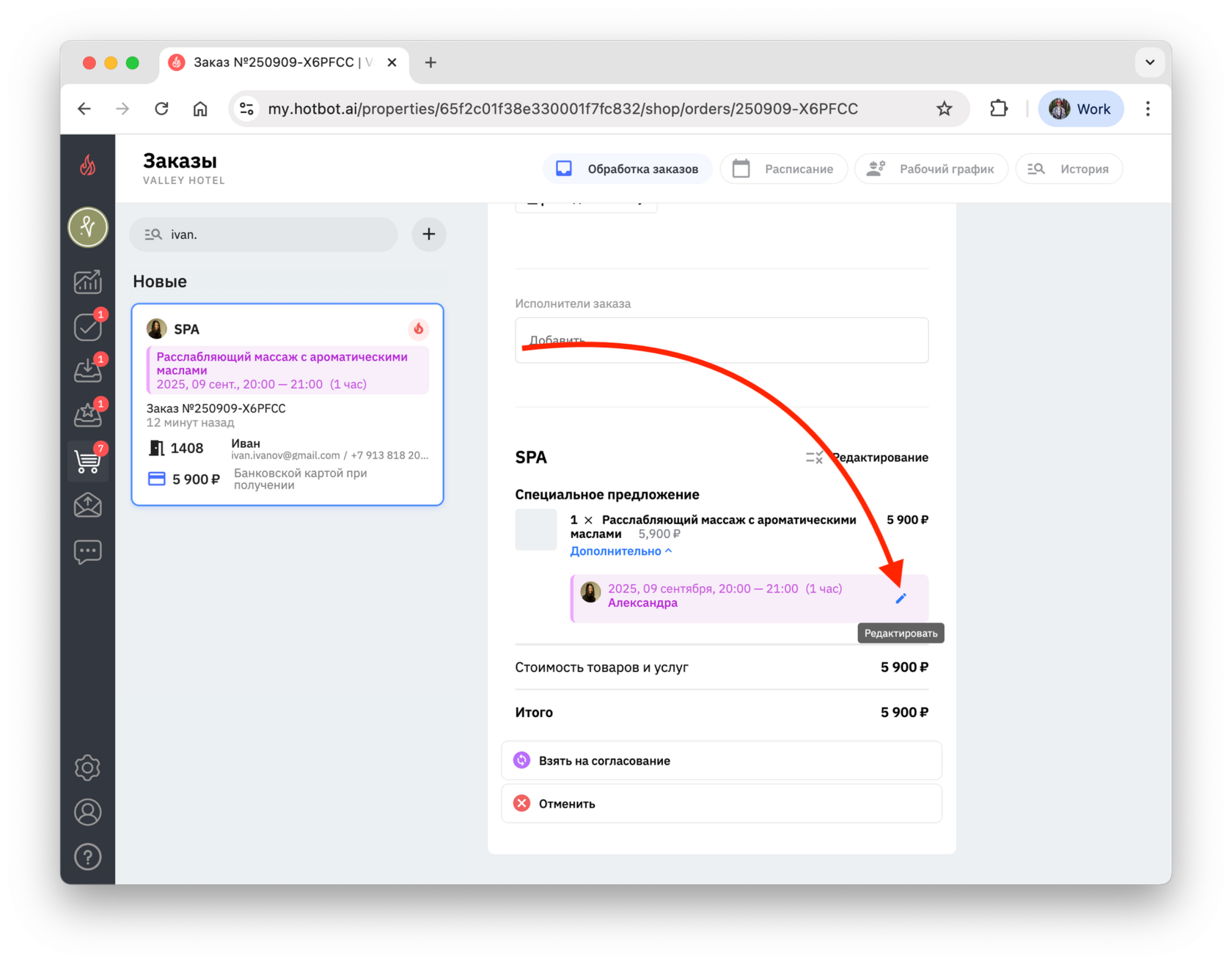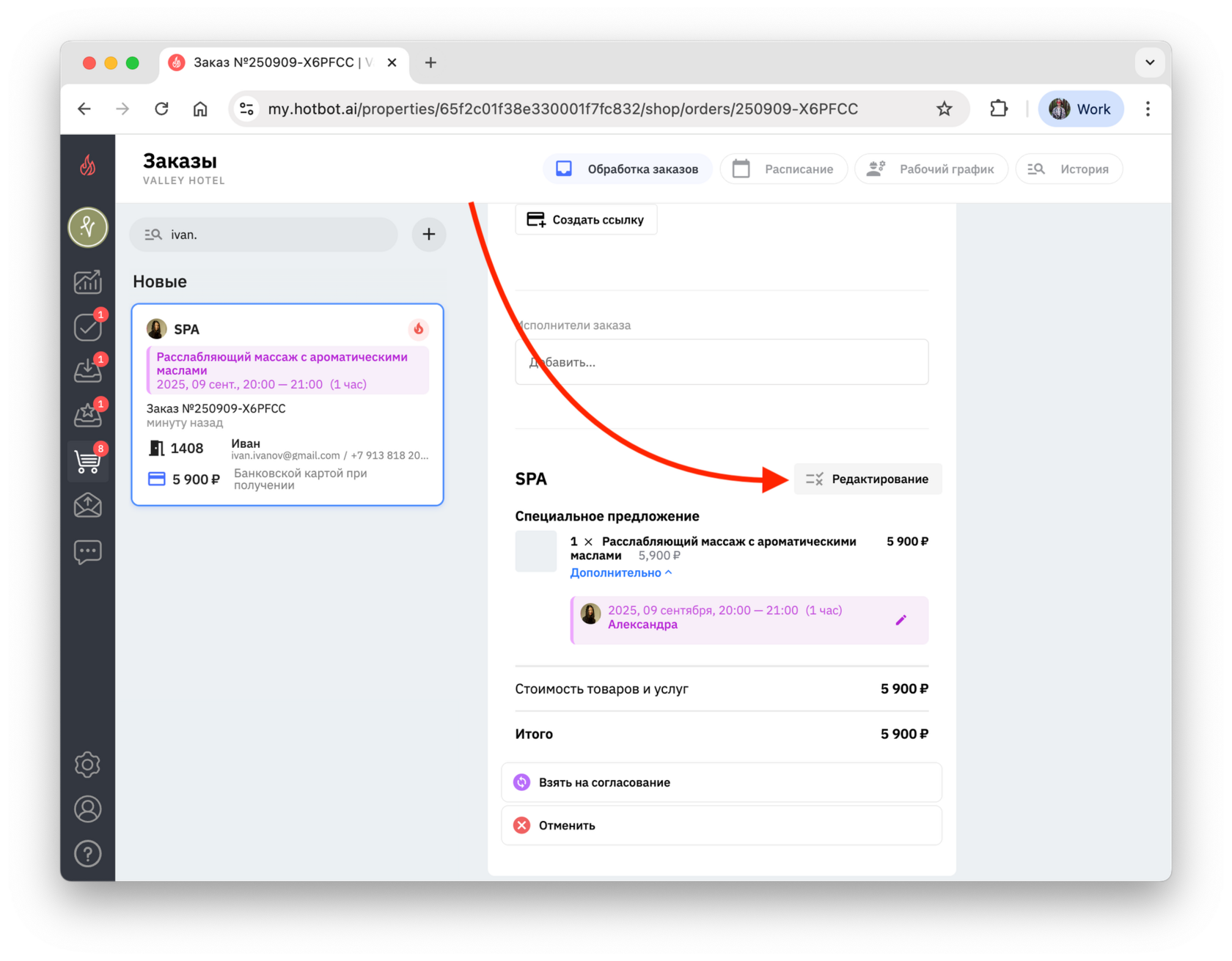Редактирование заказа позволяет администратору гибко управлять бронями услуг и корректировать детали, если в процессе работы у гостя или отеля что-то изменилось. Это помогает избежать отмены заказа и сохранить удобство для гостя.