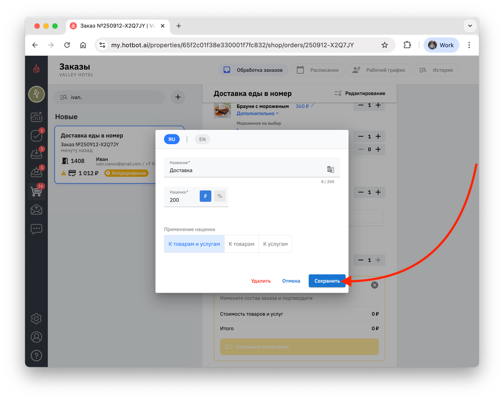 4. После изменения наценки итоговая сумма заказа изменится. Сохраните изменения.